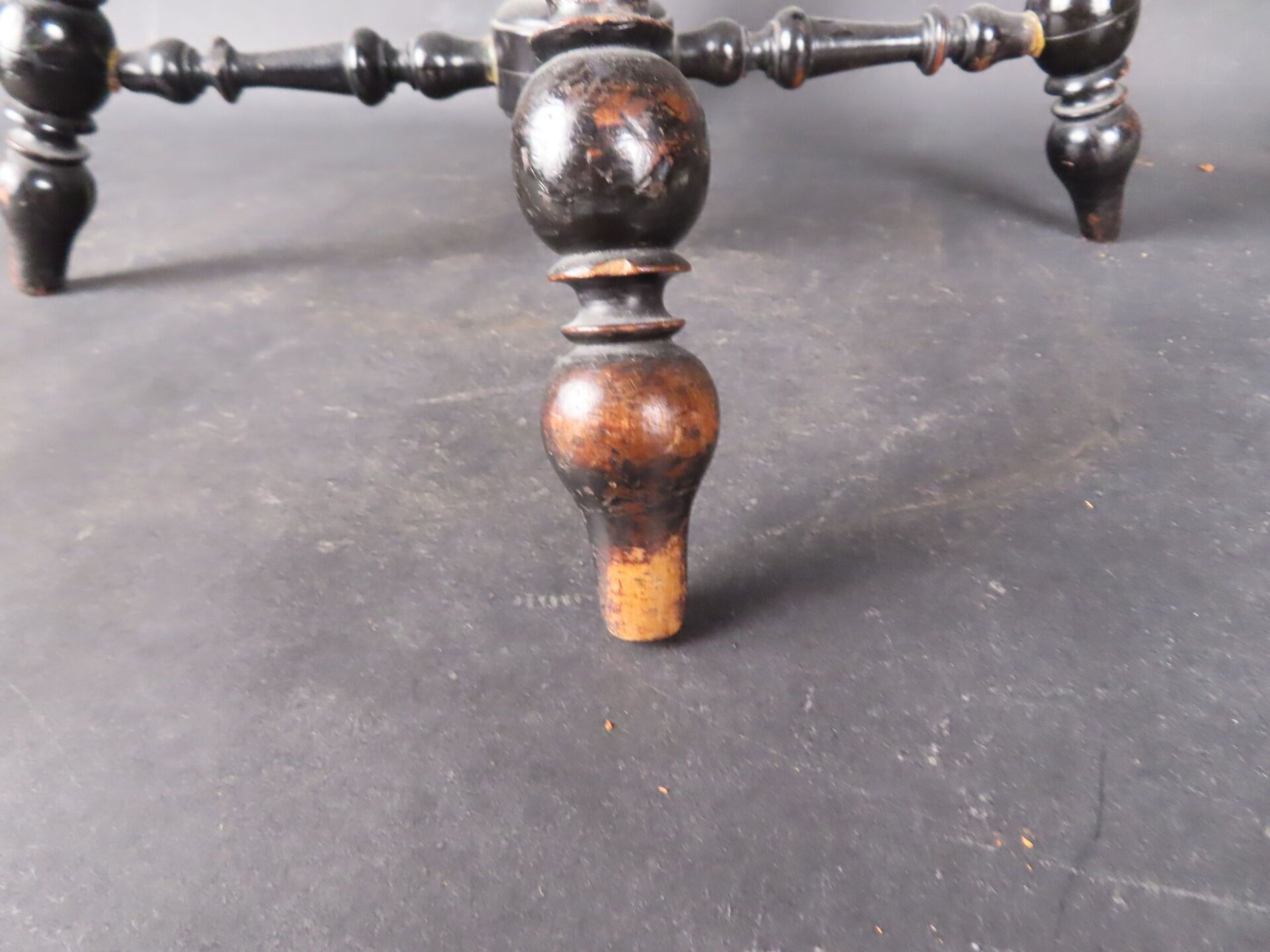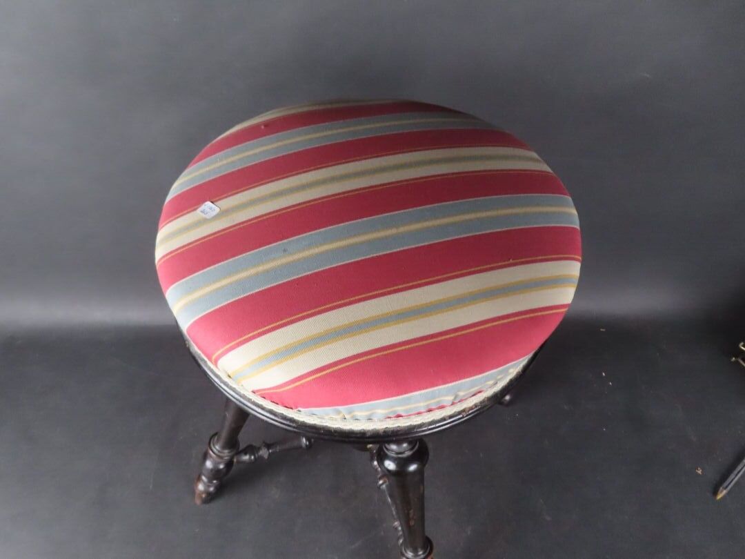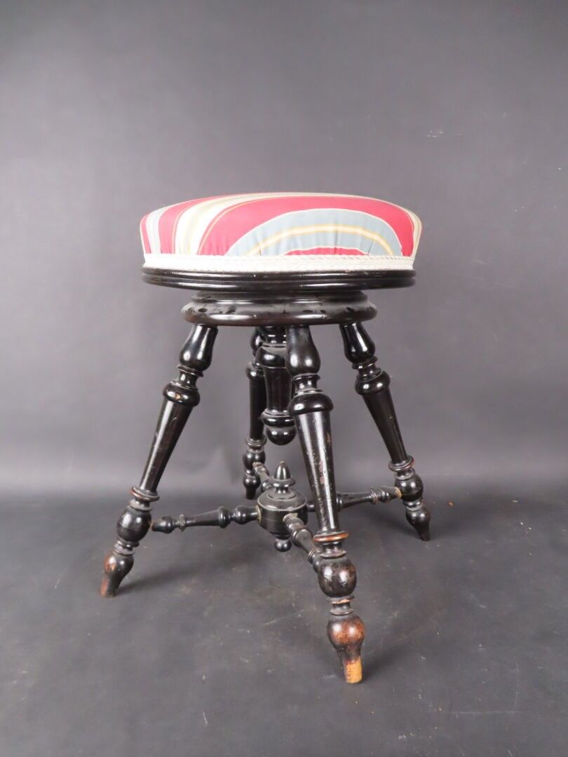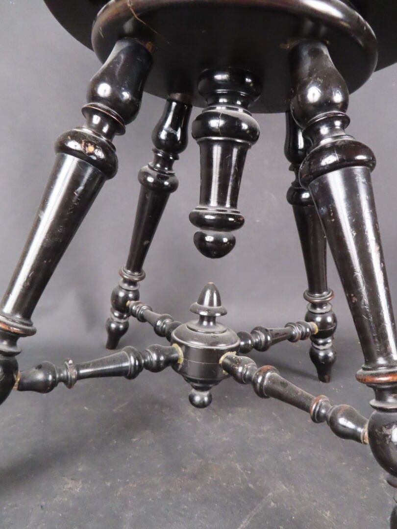 Blackened and turned wood piano stool, height adjustable circular seat. Late 19th century (H: 47 cm, diam: 34 cm)