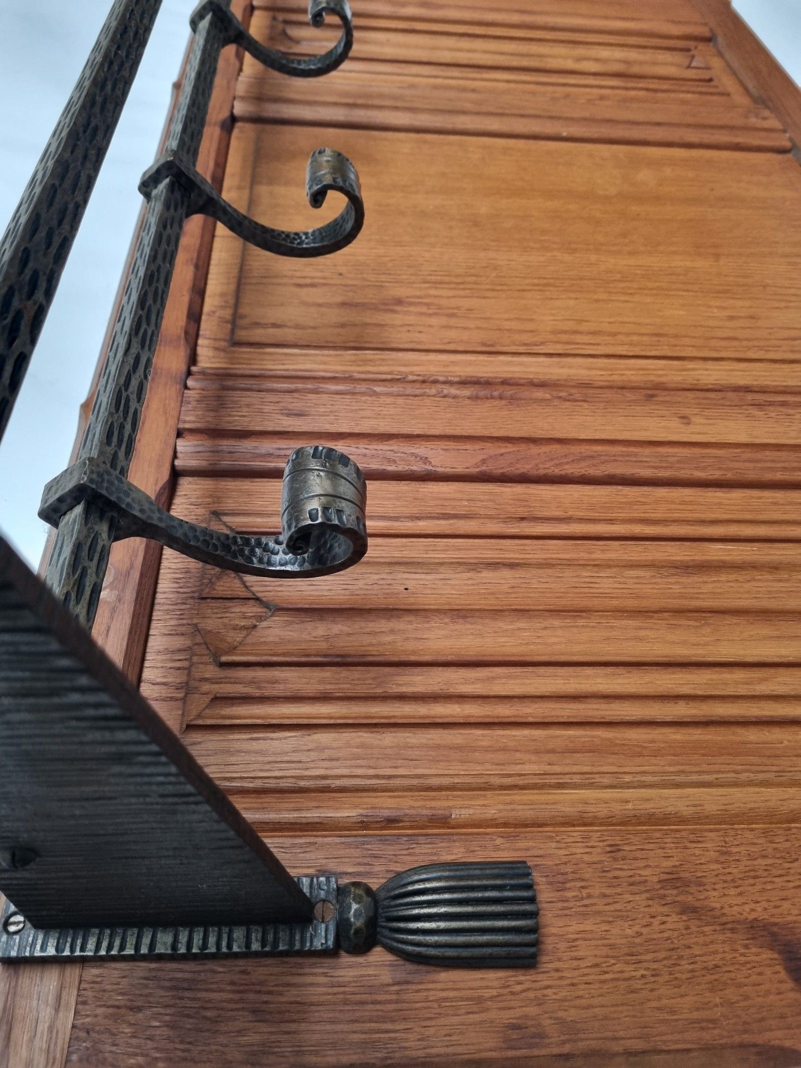 Set of two hammered wrought iron and moulded and carved wood coat stands decorated with napkin pleats (70 x 126 cm)