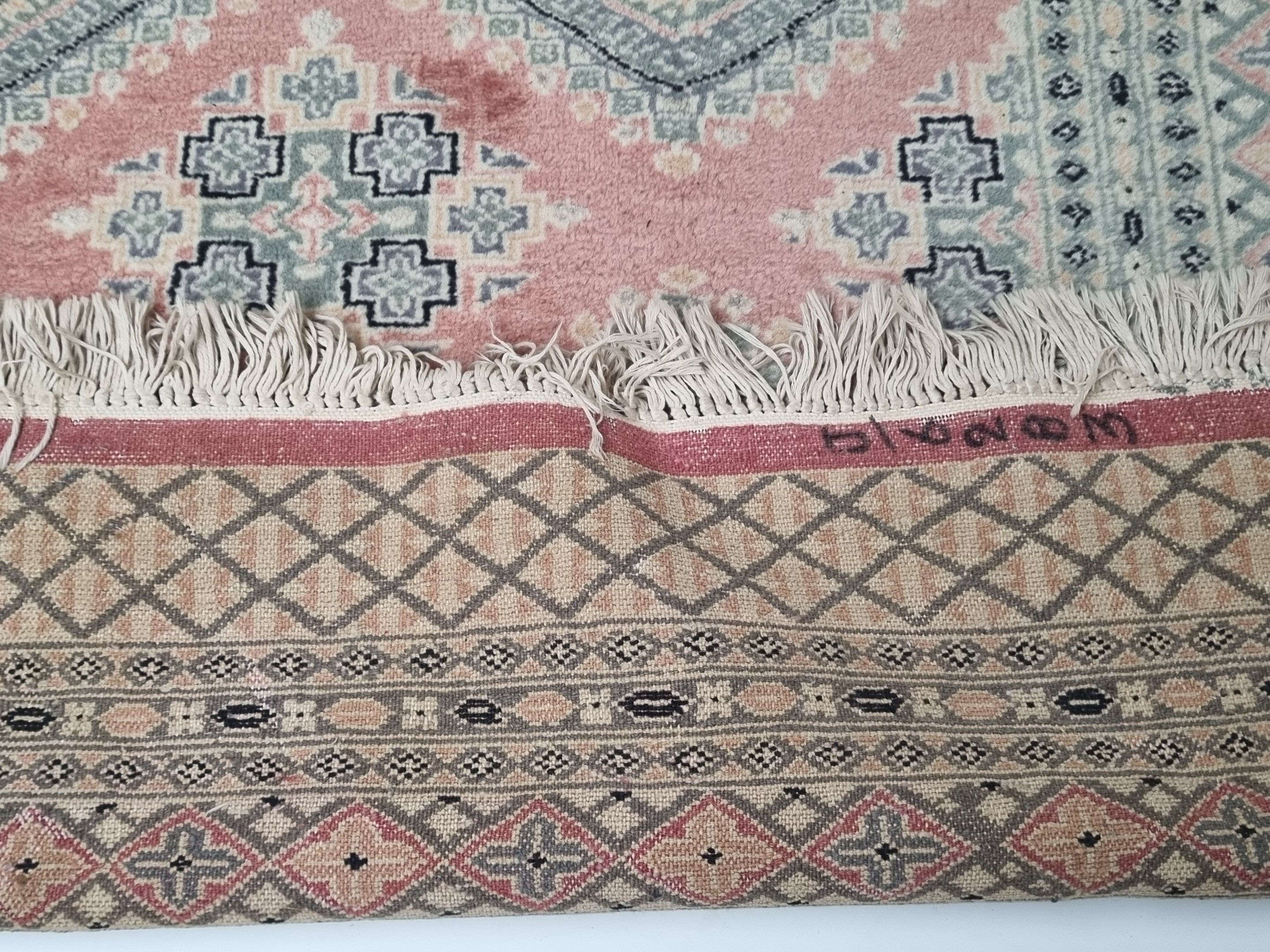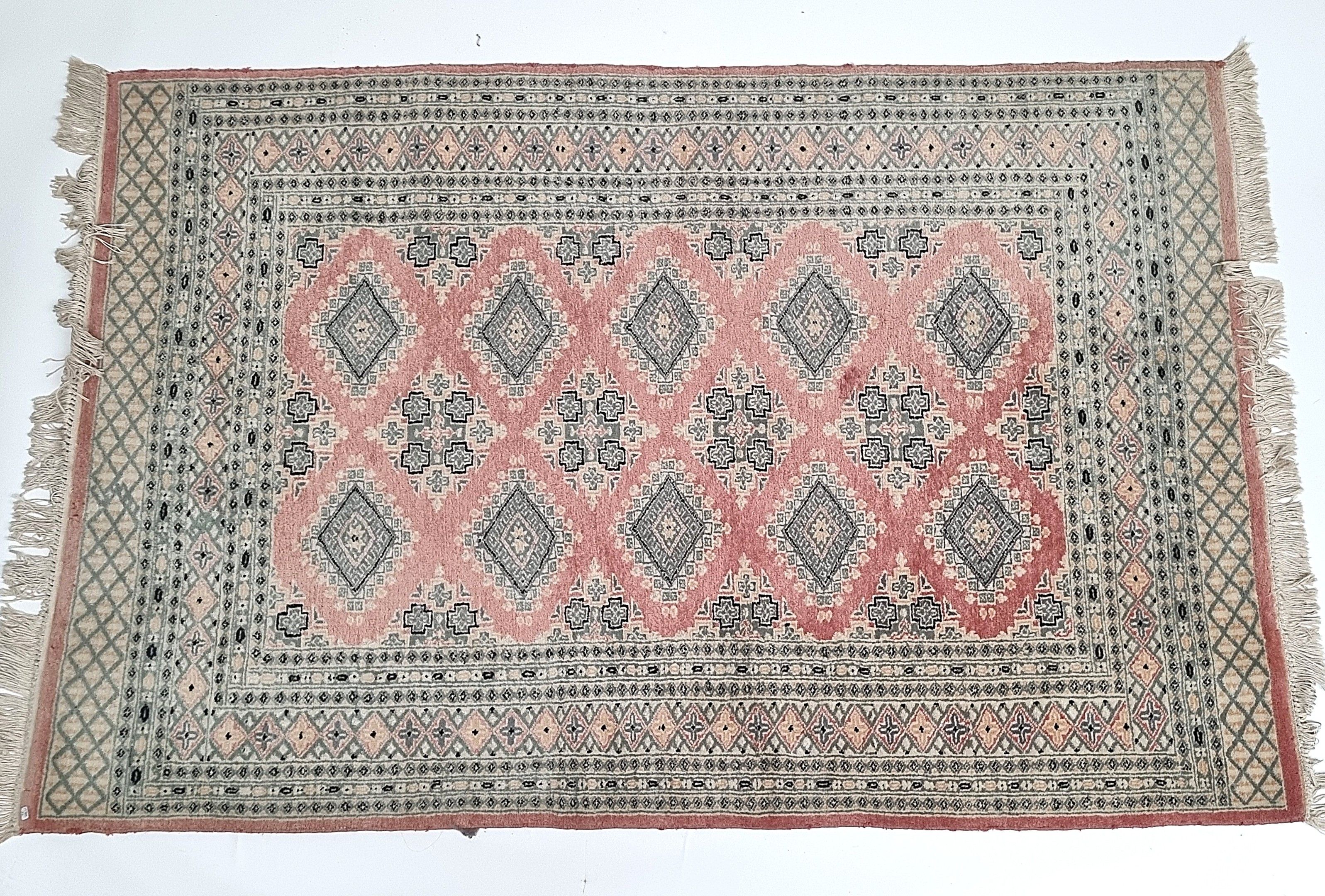 Wool carpet decorated with geometric motifs on a pink background, edged with three braids (190 x 124 cm)