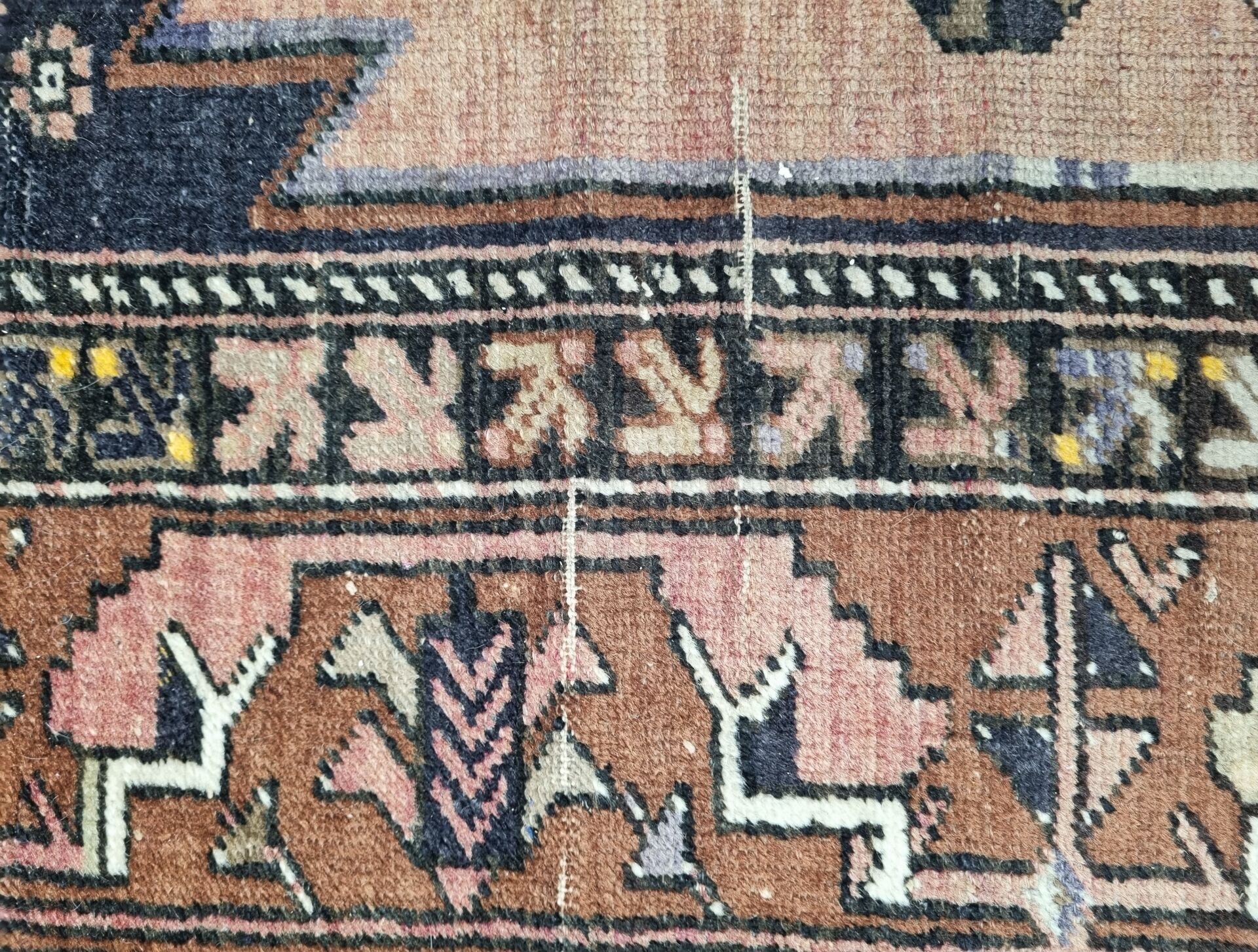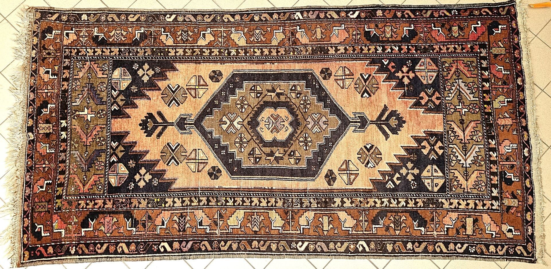 CAUCASE. Handmade wool carpet with central medallion decoration on a blue and beige background, borders with four polychrome braids decorated with geometric motifs (wear) (245 x 130 cm)