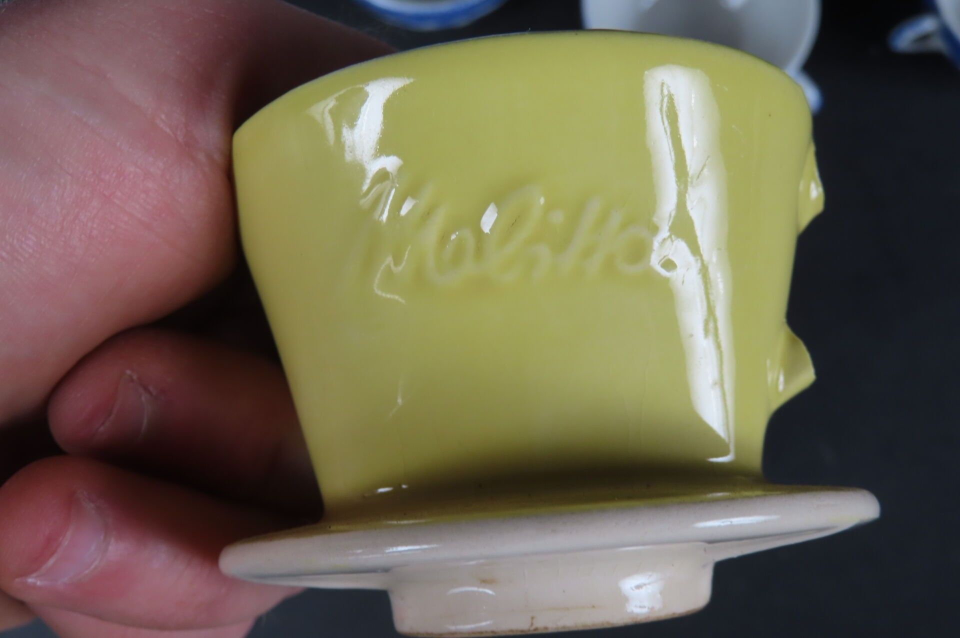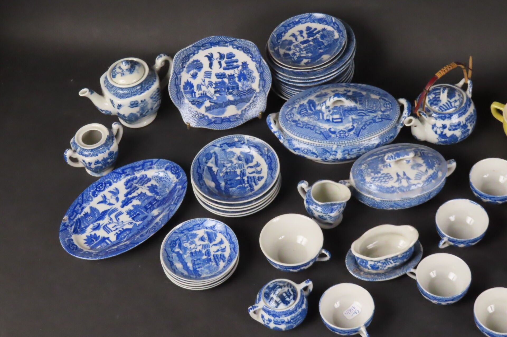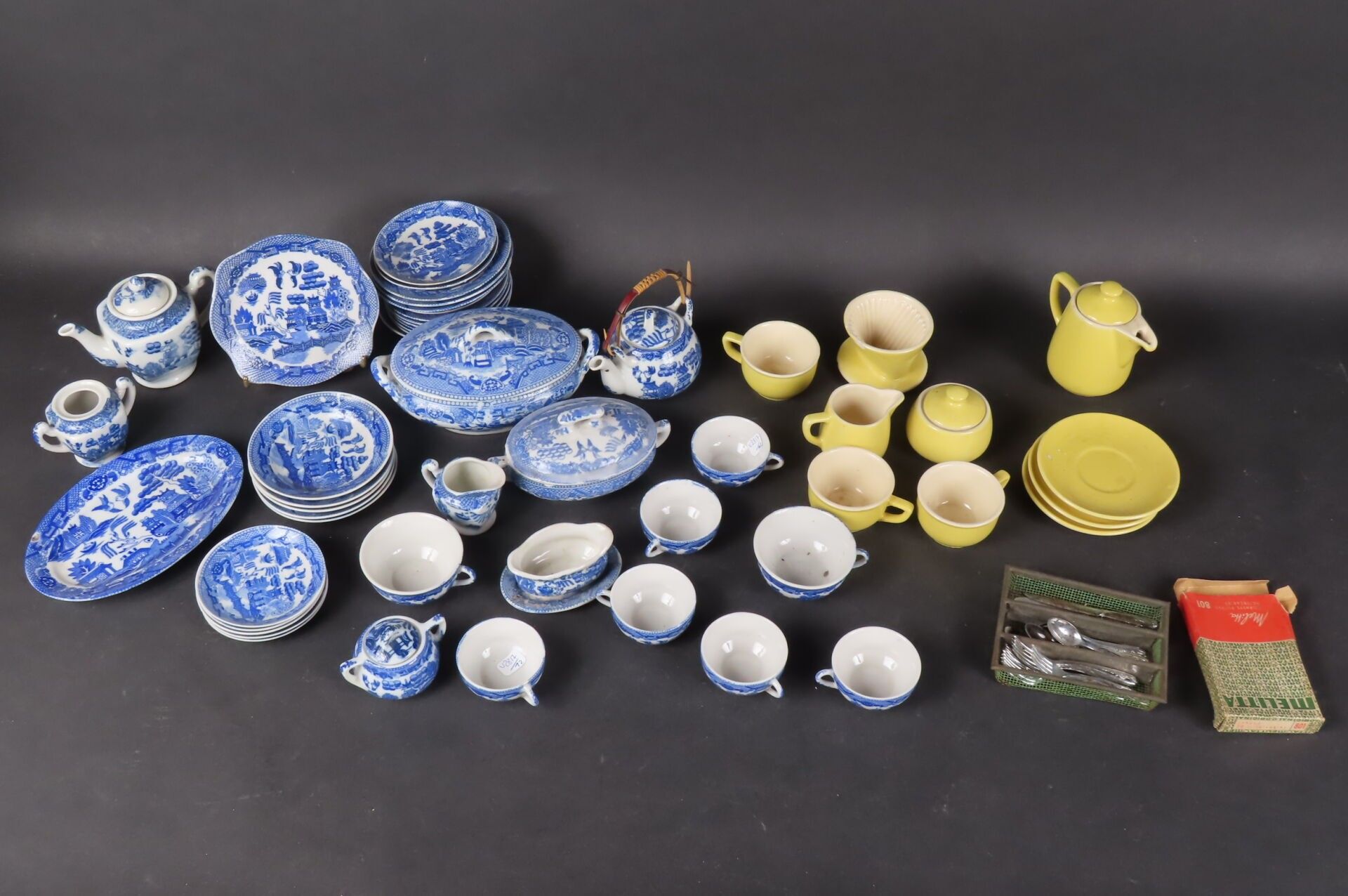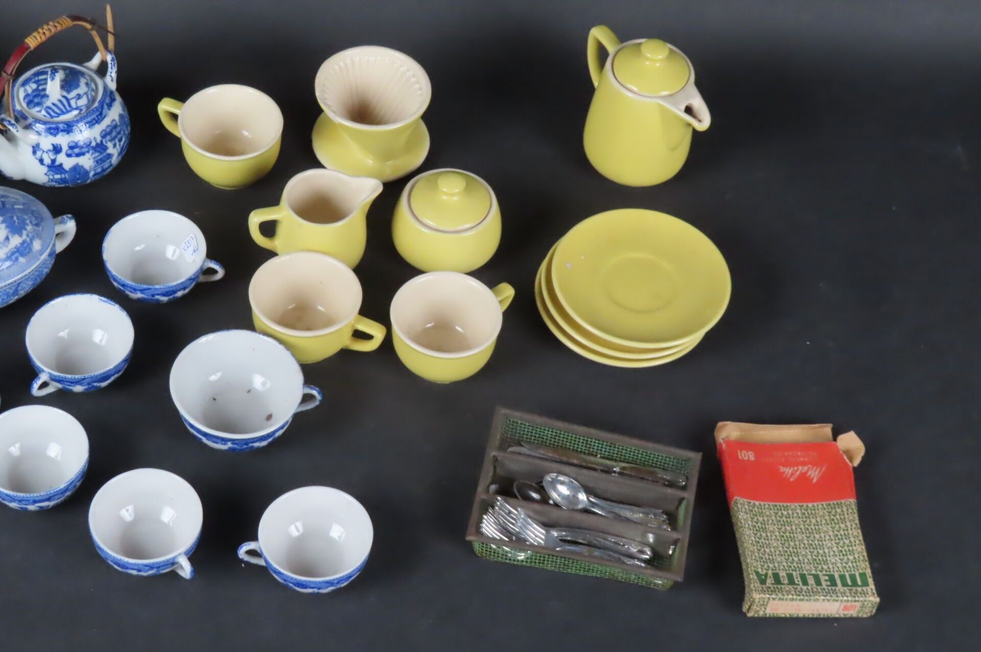 Set comprising a white and blue porcelain doll's dinette with Chinese decoration and a yellow enamelled ceramic MELITTA doll's dinette comprising 1 teapot, 1 milk jug, 1 sugar bowl, 3 cups and saucers and 1 filter (missing). There are also some aluminium kitchen utensils.