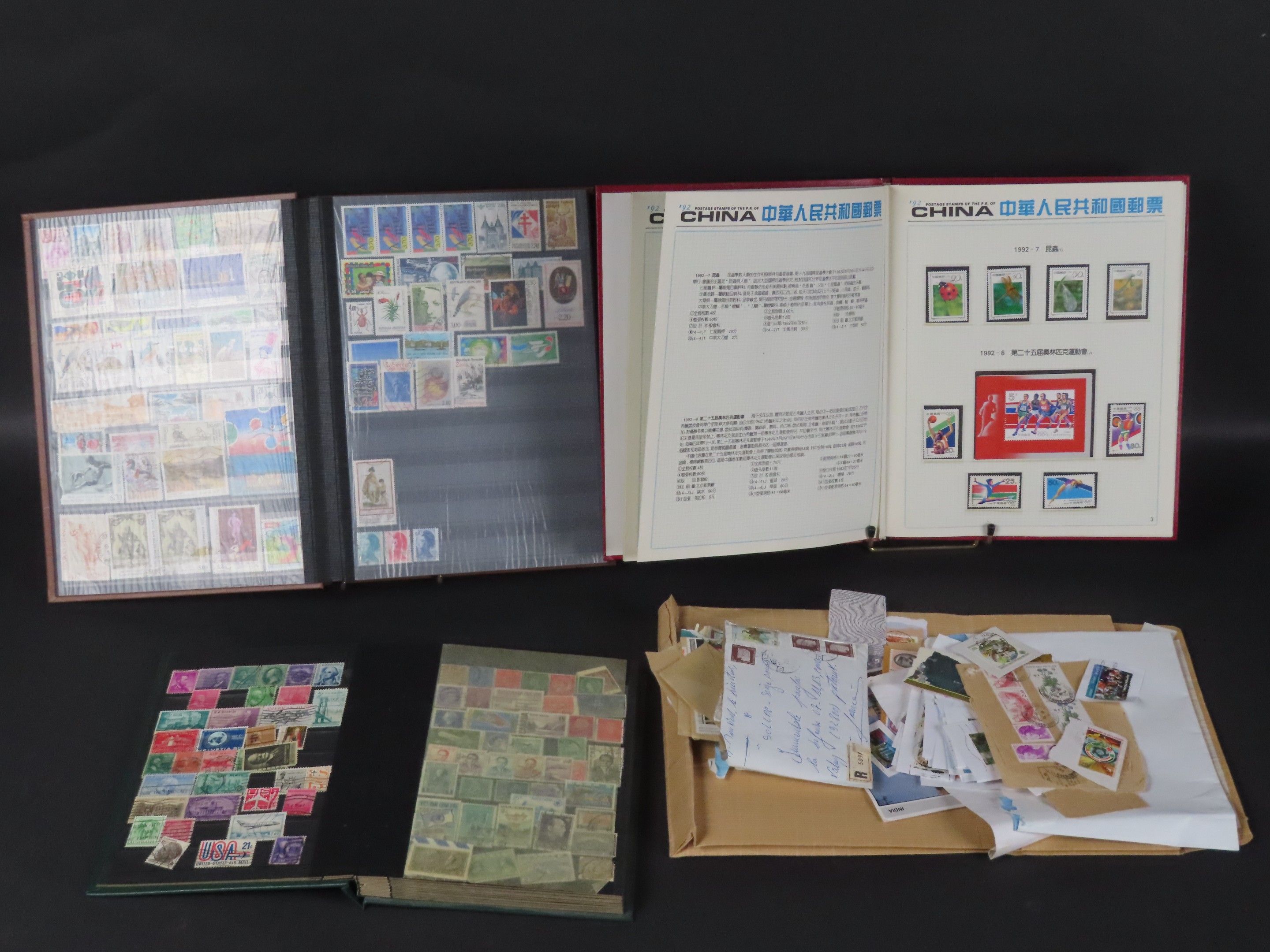 Lot of stamps including a bulk envelope of cancelled French and foreign stamps, a People's Republic of China album dated 1992, and two albums of French and foreign stamps, mainly Africa, incomplete.