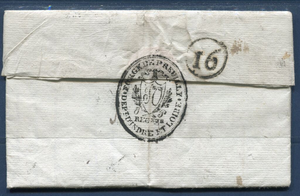 On the back, a very attractive "coat of arms" closing stamp "REGISSEUR FORGE de PREUILLY - DEPt D'INDRE & LOIRE" - also a date mark for the month of the Paris post office "16" in an 18 mm circle, indicating the day of arrival in Paris on the back of letters from the provinces.