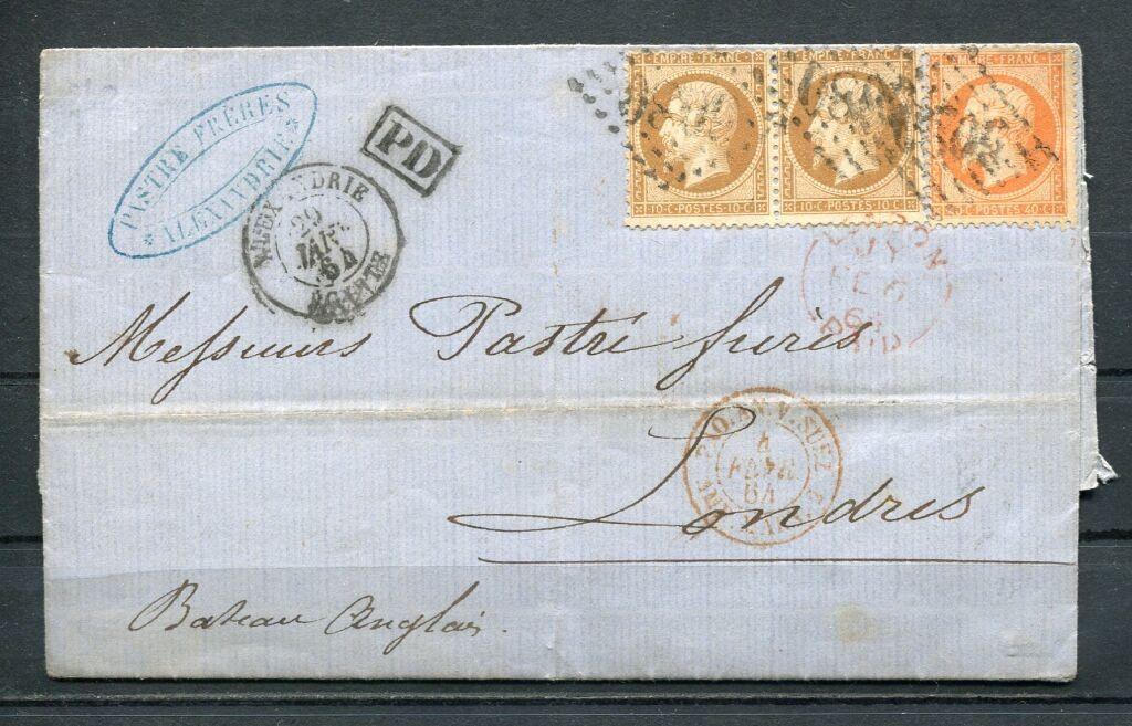 Date stamp from Alexandria 20 January 1864 + English liner to Suez (struck in red) 4 February. Obliteration large figures on stamps 5080 and framed claw PD -.