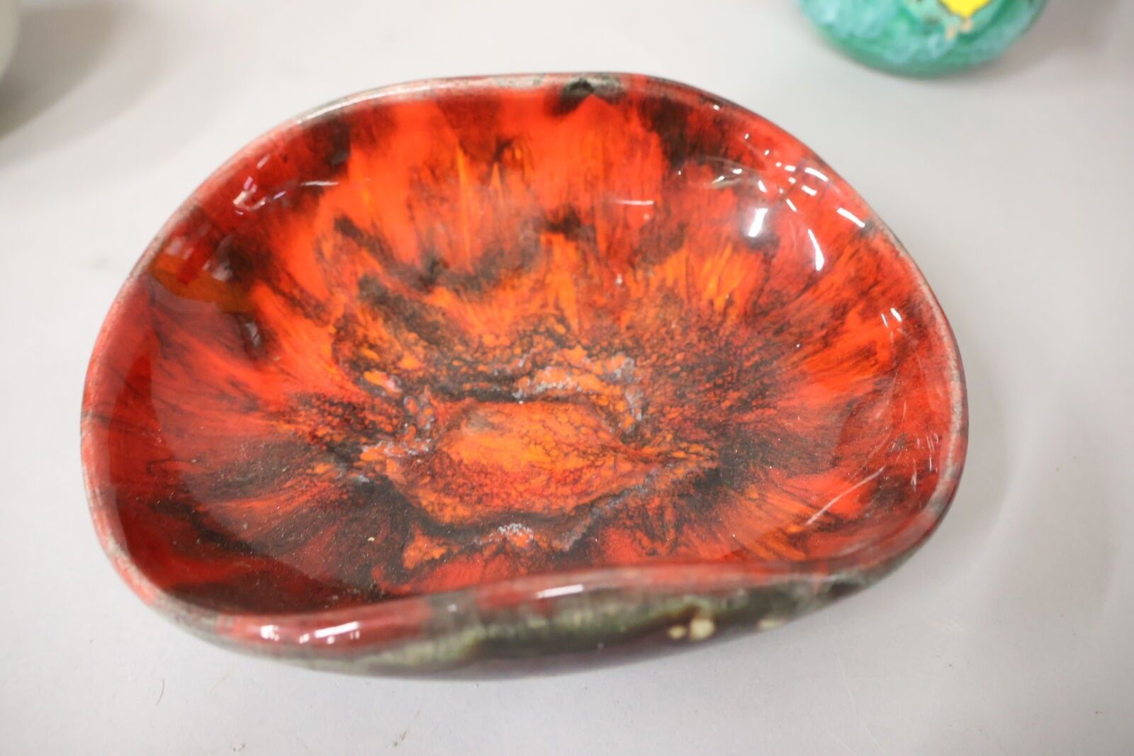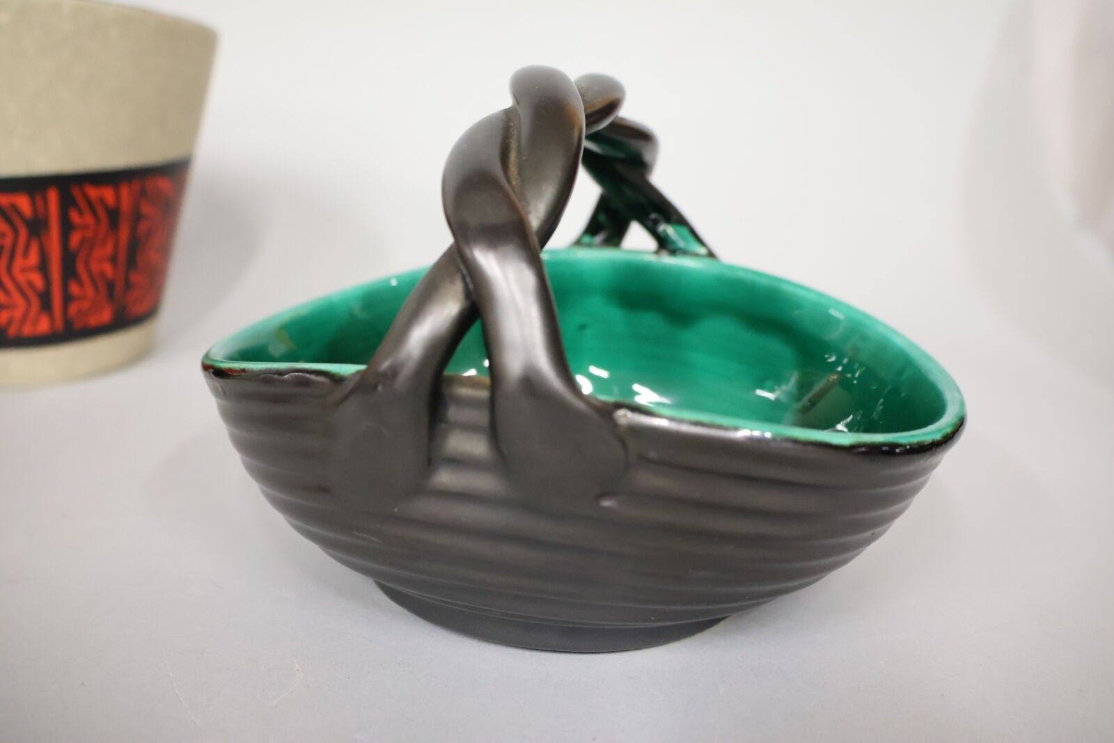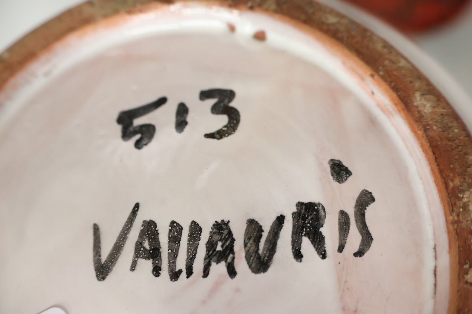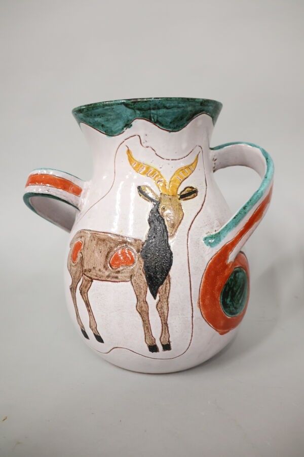 Plant-pot holder, saucer, dishes and a 2-handled pot signed Vallauris