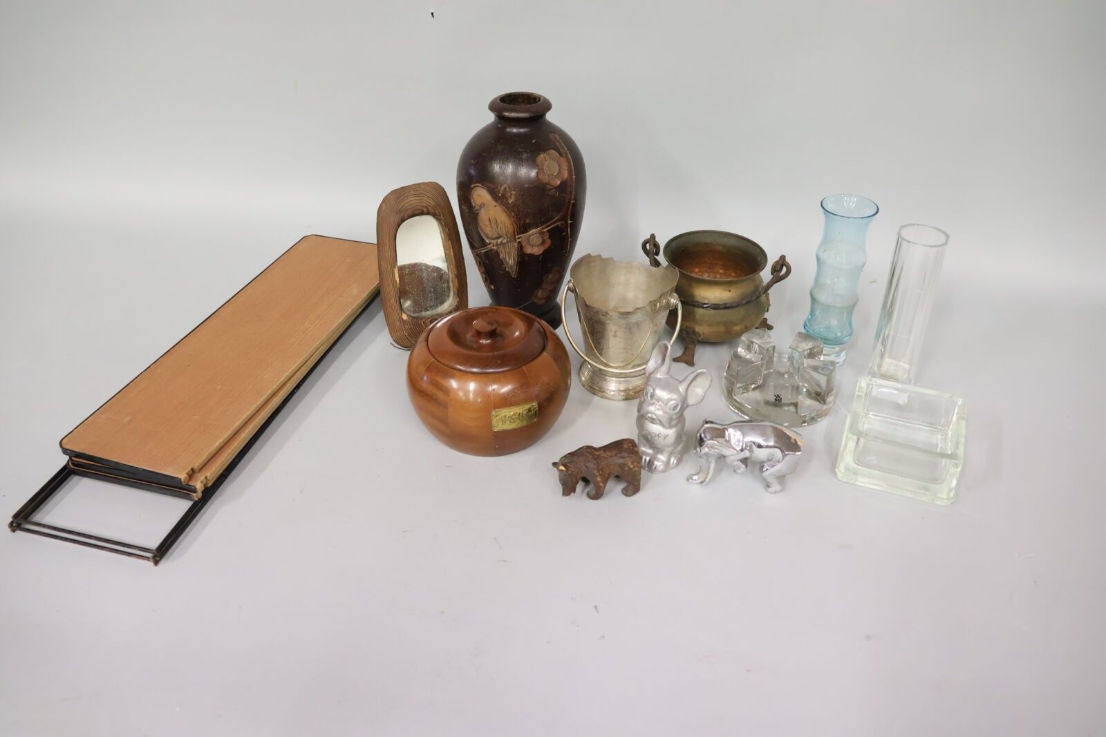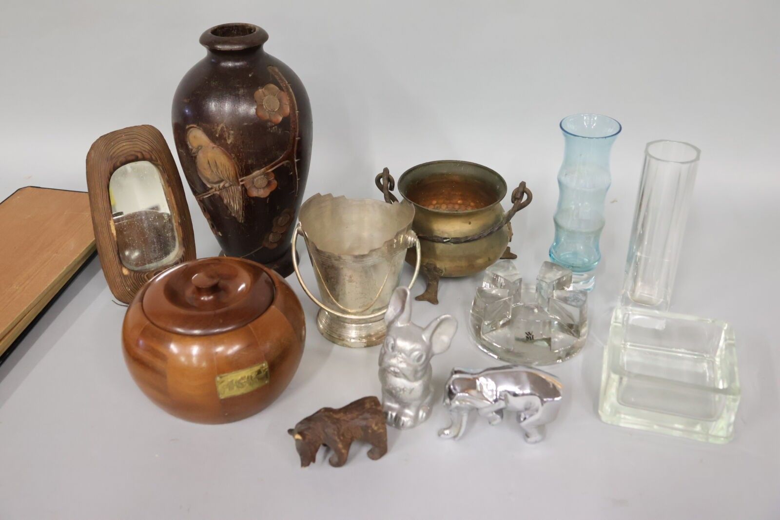 Mixed lot consisting of a small 3-tier shelf in wood and metal, a small cauldron, an ice bucket in metal and one in wood, a wooden vase decorated with a trendy bird, glassware, a free-standing mirror and small subjects in metal and wood.