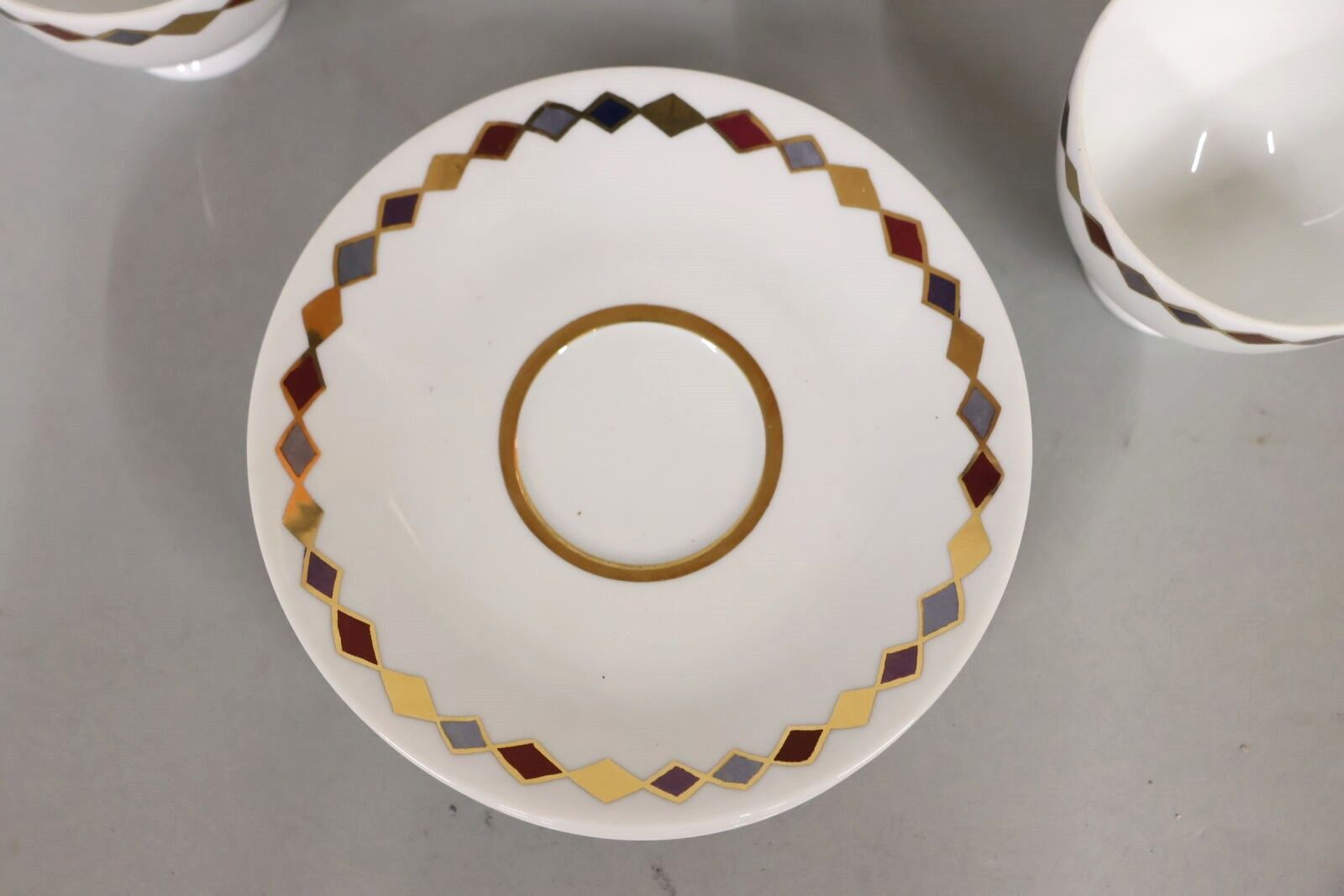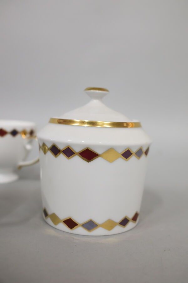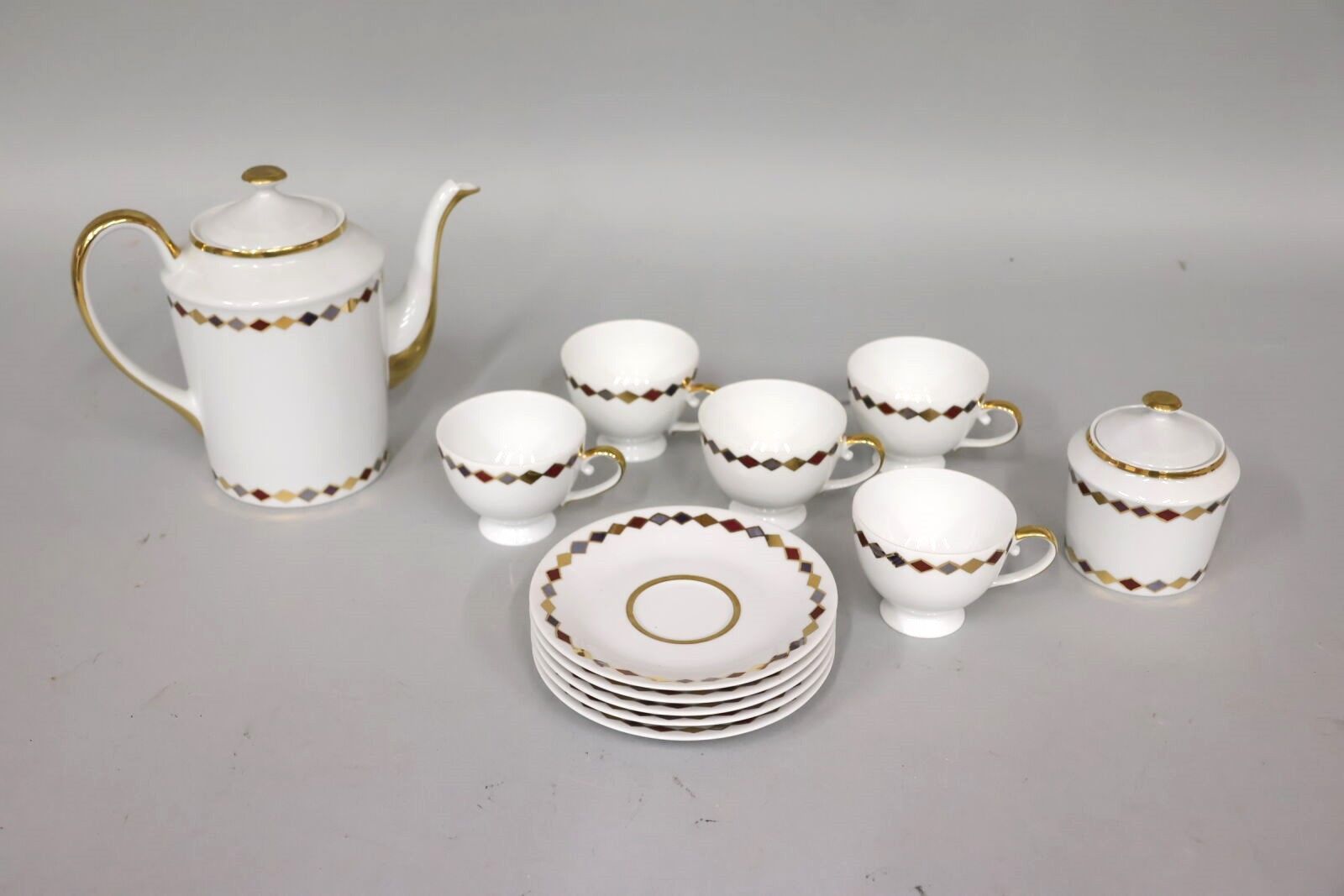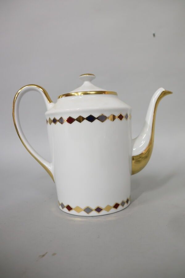 Gilded porcelain coffee set decorated with a frieze of lozenges comprising: