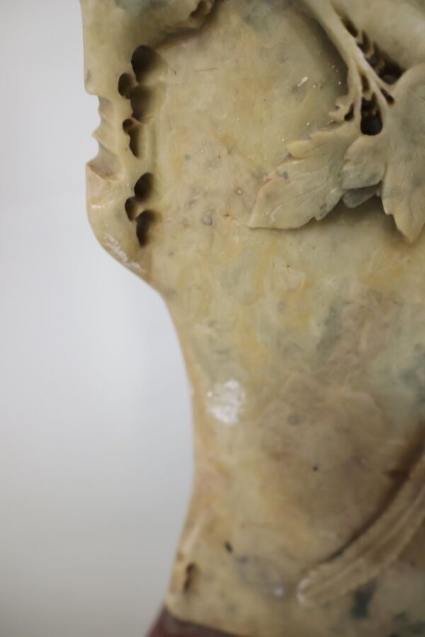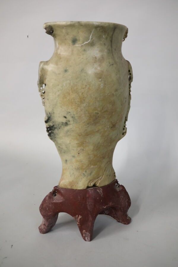 Hard stone vase with rose and peacock motifs in low relief on a cherry-coloured stone base