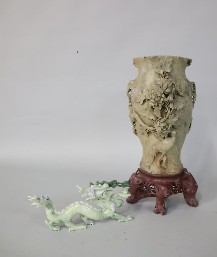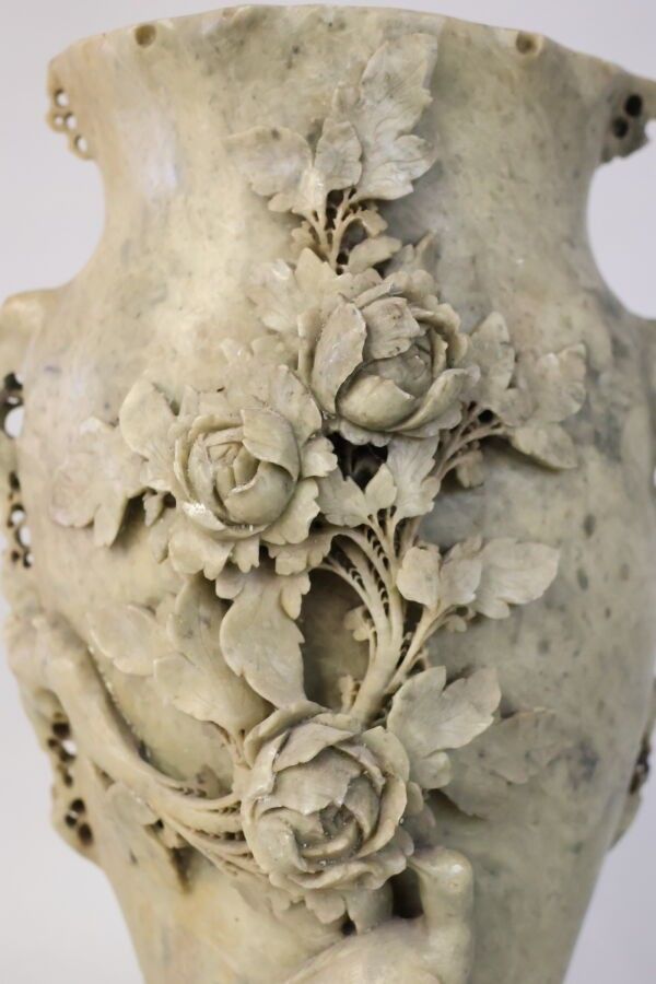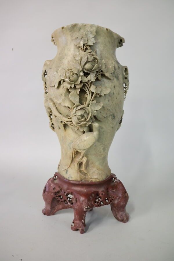 CHINA Hard stone vase with rose and peacock motifs in low re…
