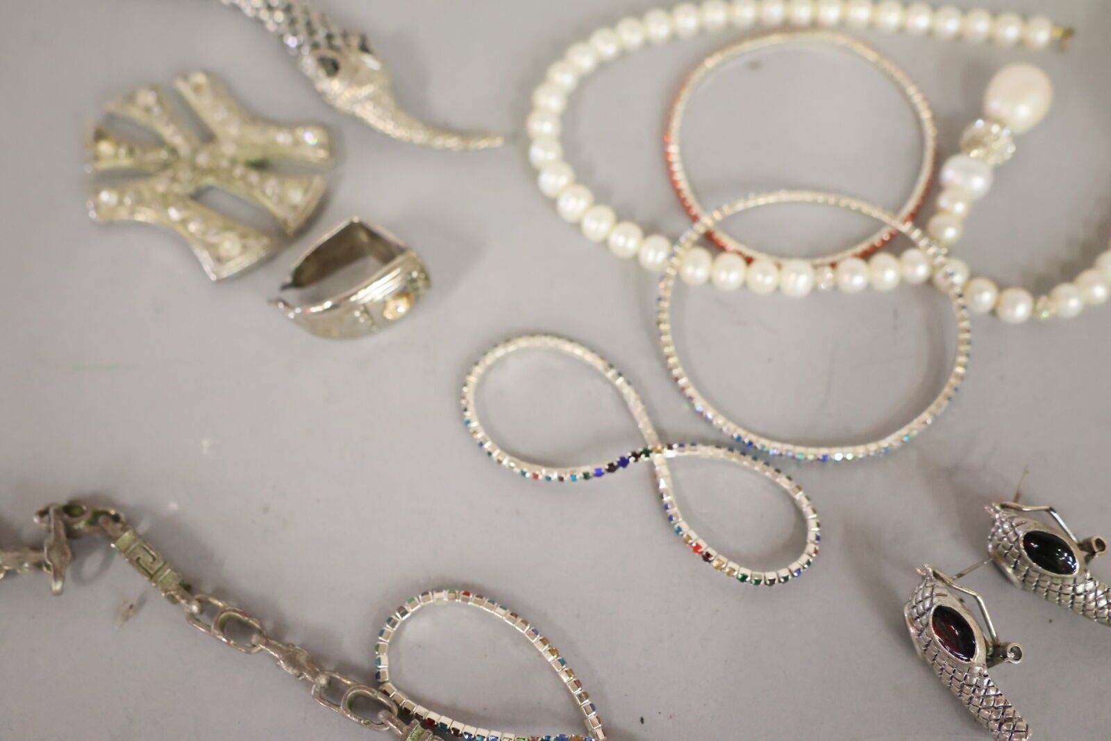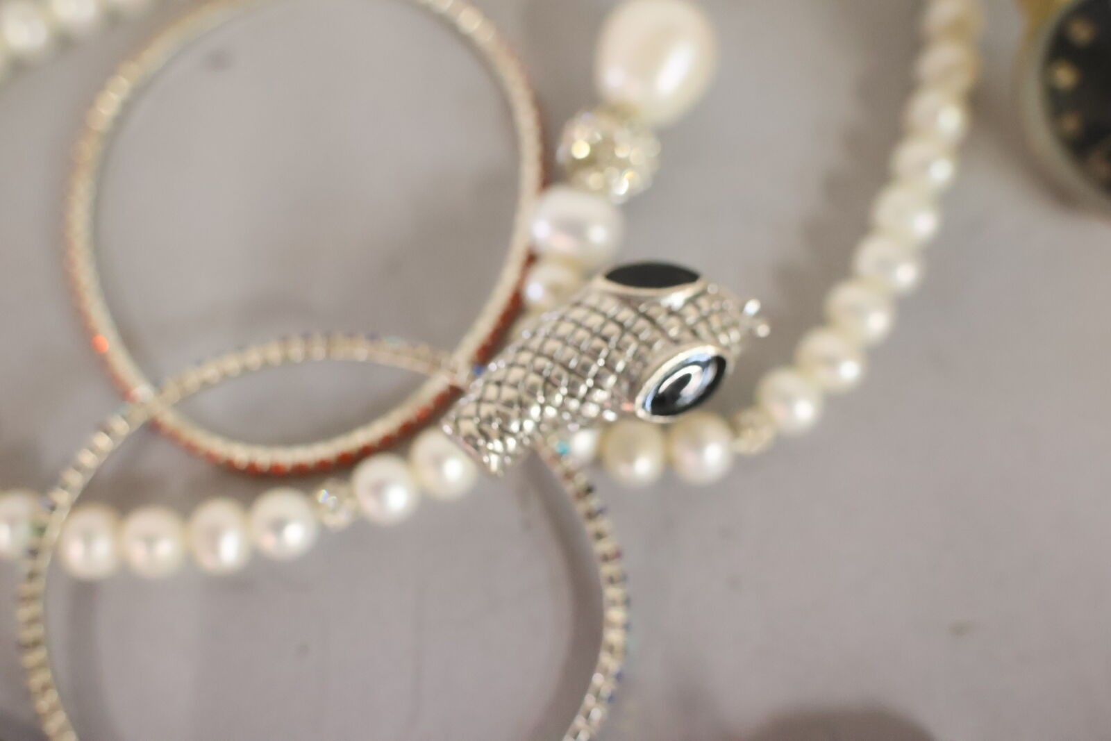 Lot of jewellery including: a gold-plated LVO lady's watch, four costume bracelets, a long necklace with Greek decoration, a costume pearl necklace, a necklace and earring set with snake decoration, a wooden cow key ring.