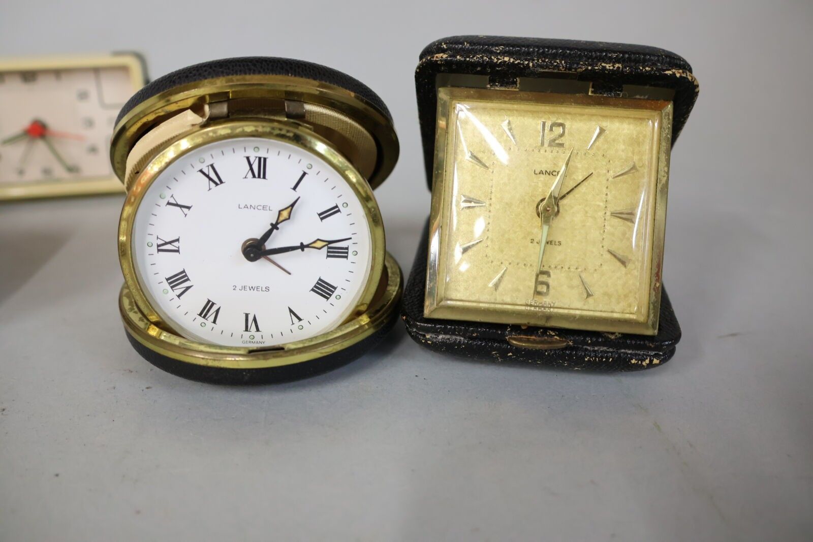 Set of about ten hand-wound alarm clocks, including 2 LANCEL travel alarm clocks