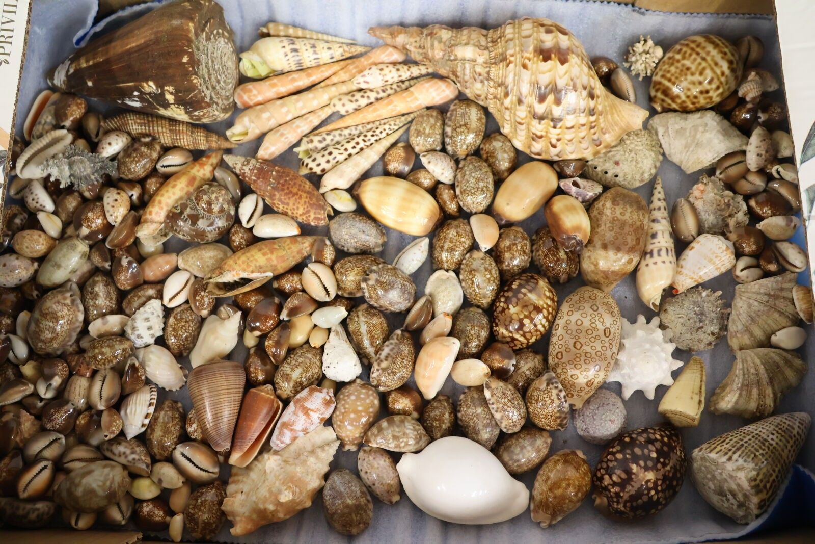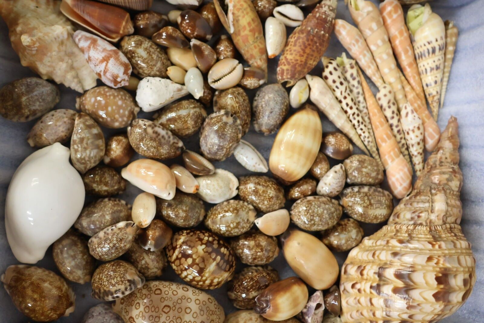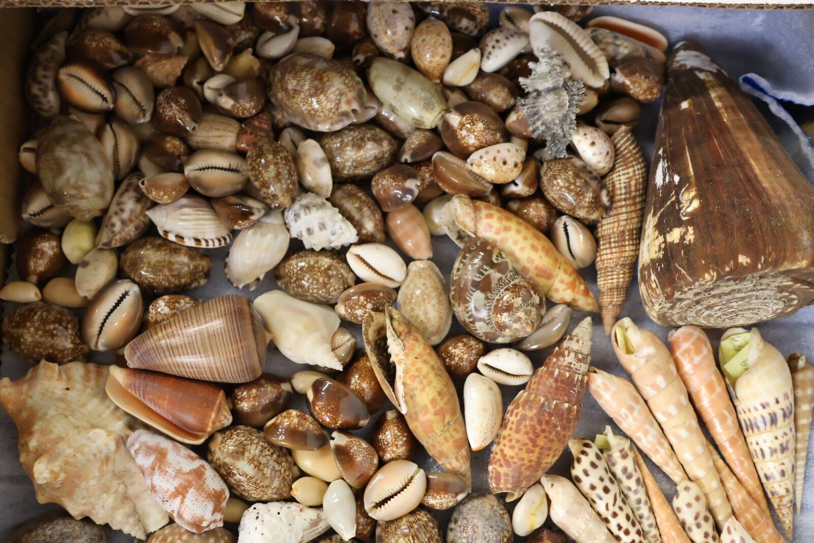 A batch of shellfish, mainly Cauris and Terebra Maculata