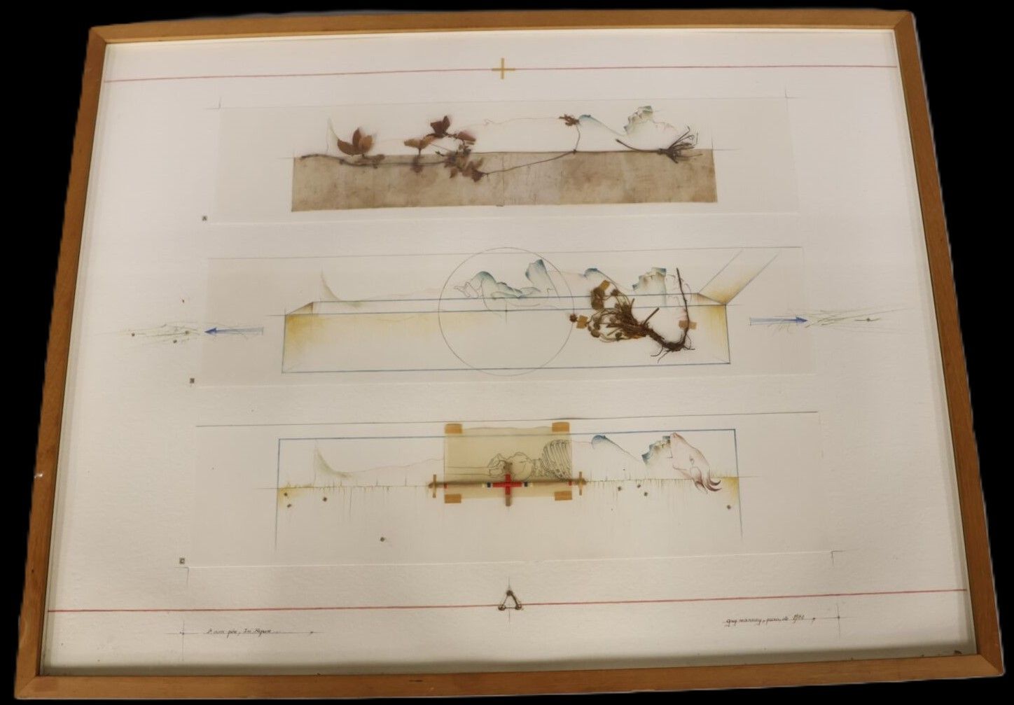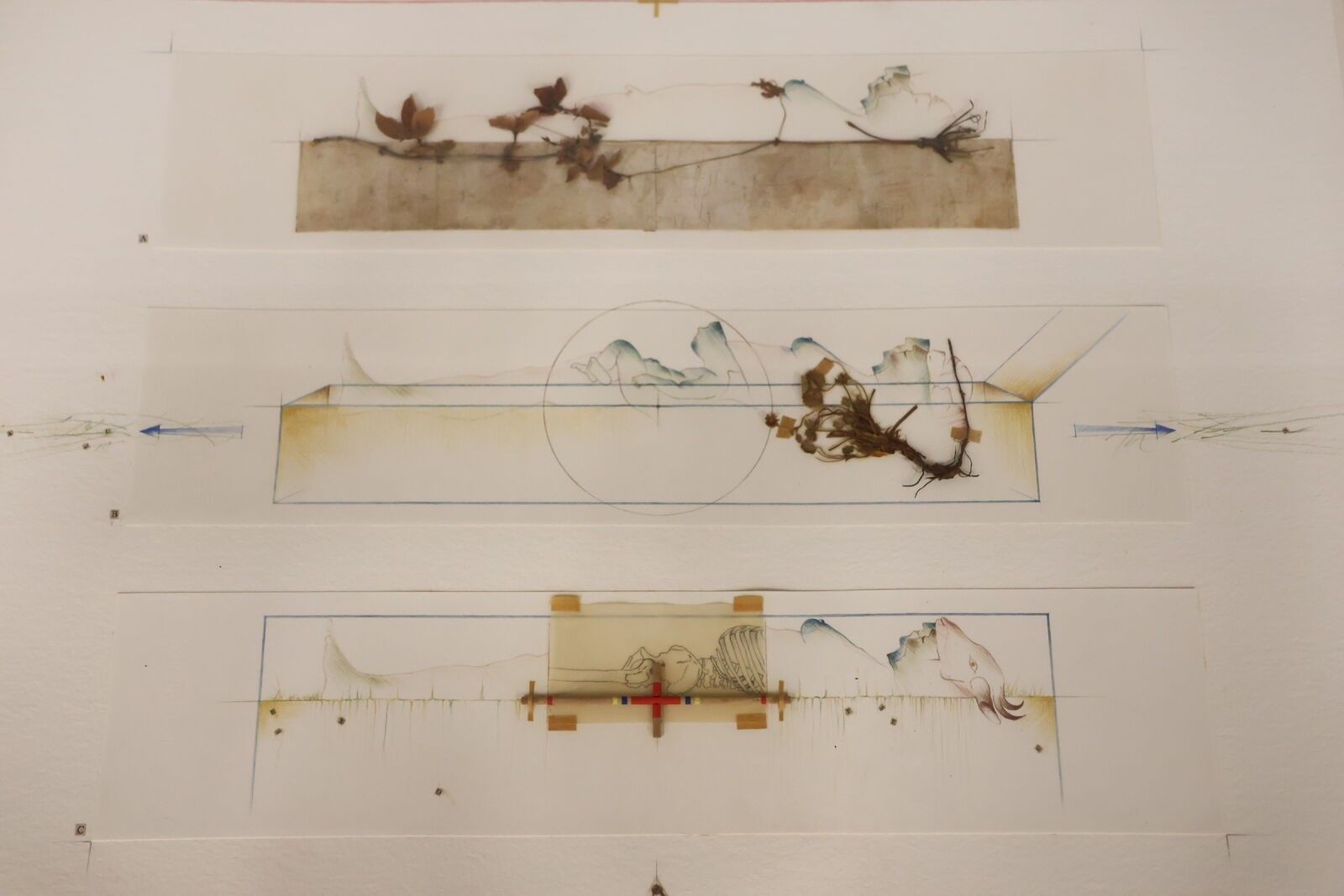 Pencils, leaves and wood on canson and tracing paper in three vignettes