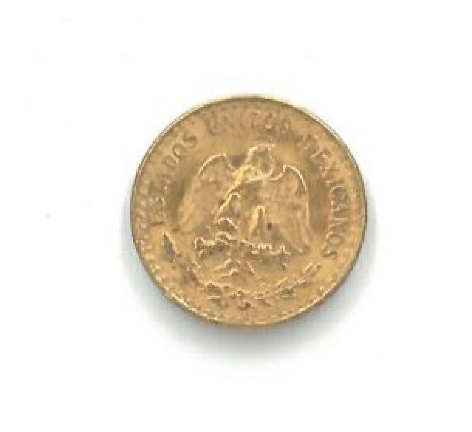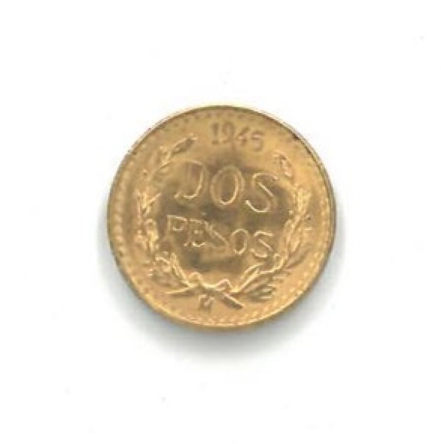 1 gold coin 900/1000 DOS PESOS 1945, reverse showing an eagle on a cactus striking down a snake and bearing the legend "ESTADOS UNIDOS MEXICANOS".
