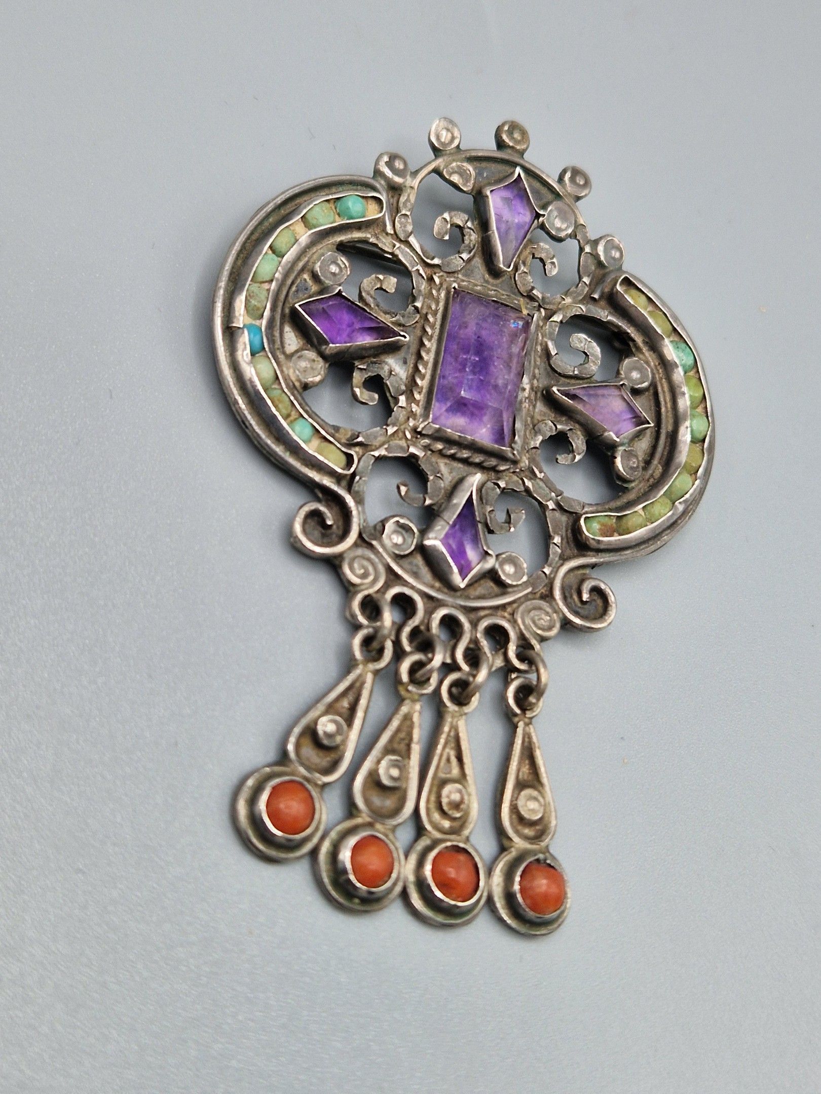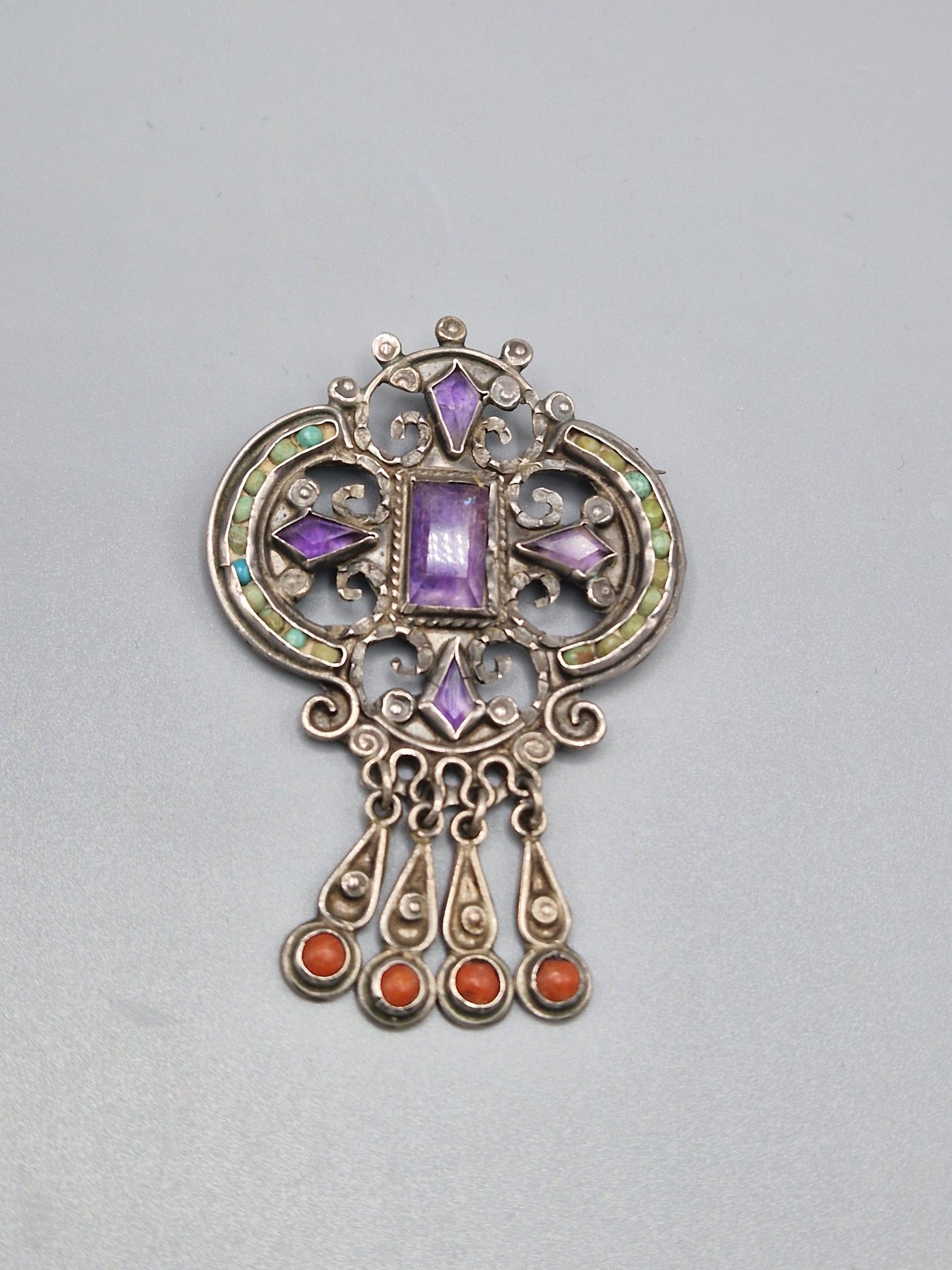 Four-drop openwork silver brooch (Mexican work, 14 g, weight tolerance) with a central cruciform motif of faceted amethysts surrounded by turquoise and coral beads. Height: 70 mm