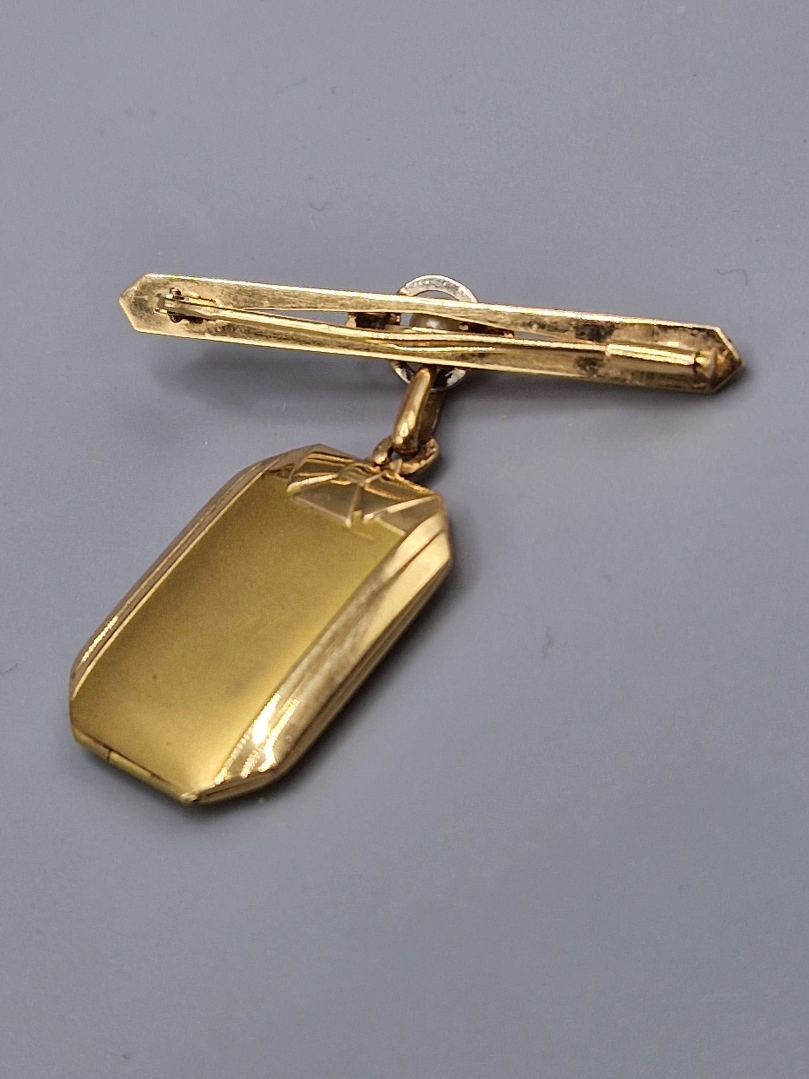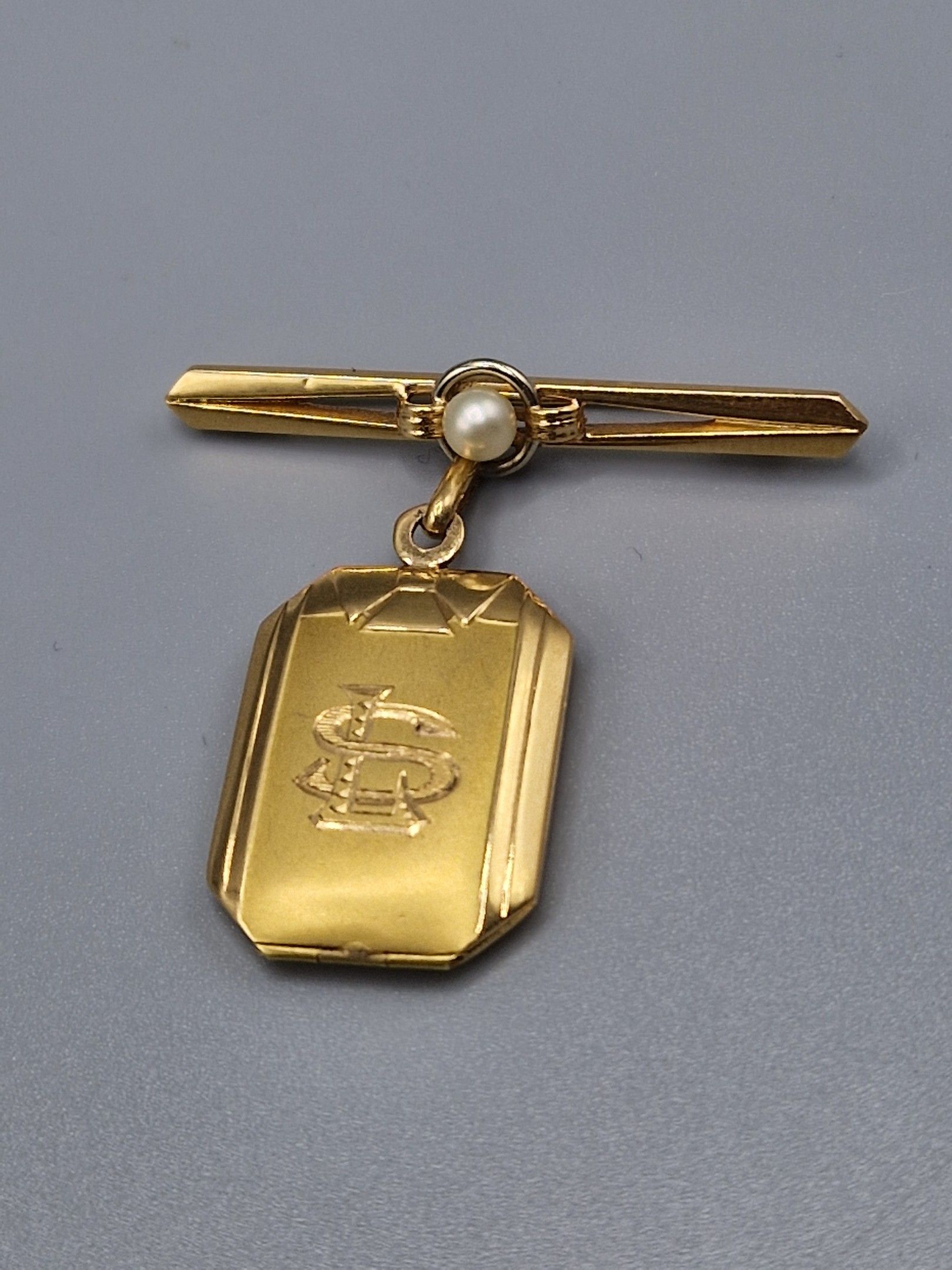Gold pin (in good standing) holding a souvenir pendant as a charm. It is enhanced by a small white pearl. 5.7 gr