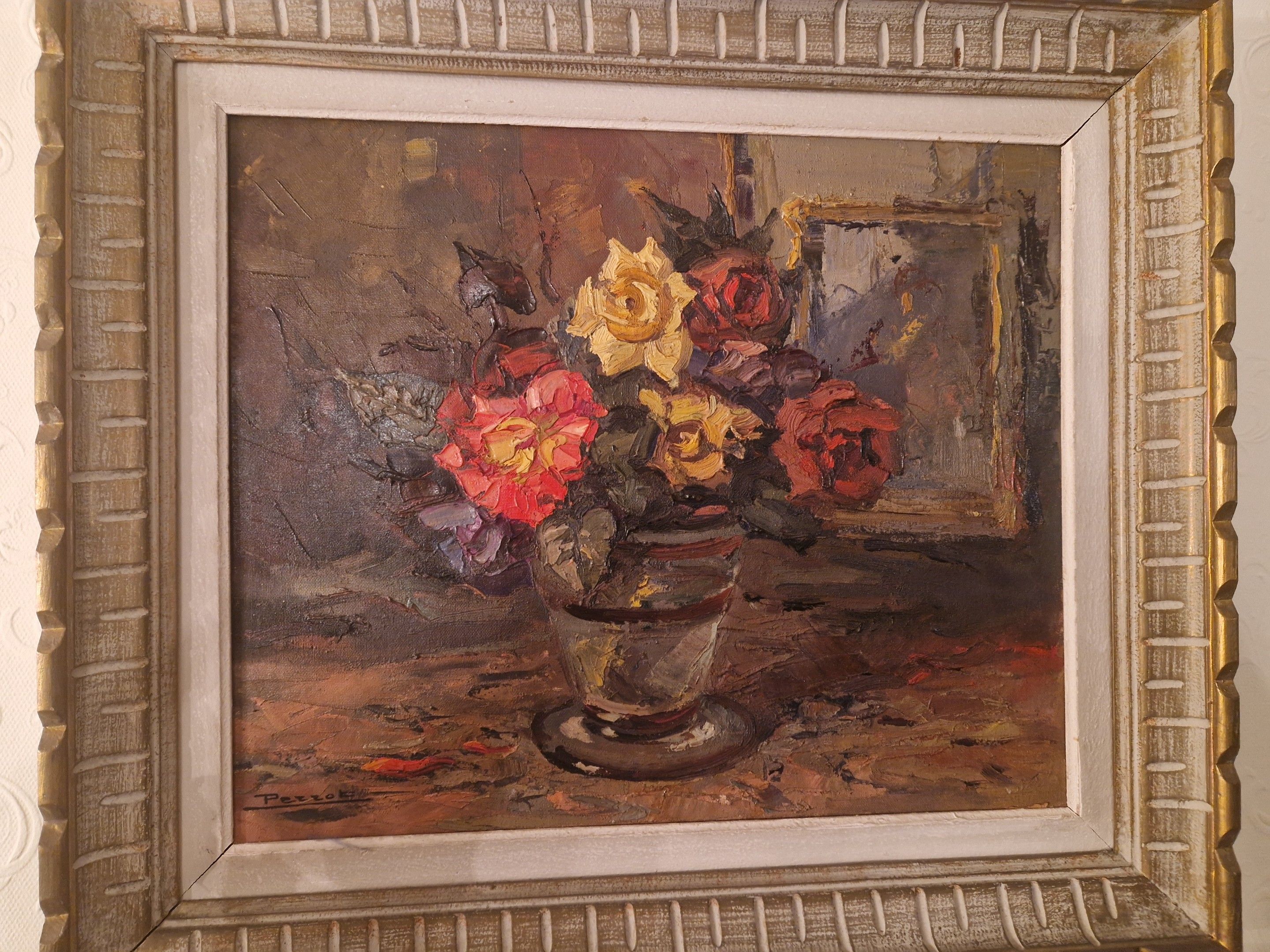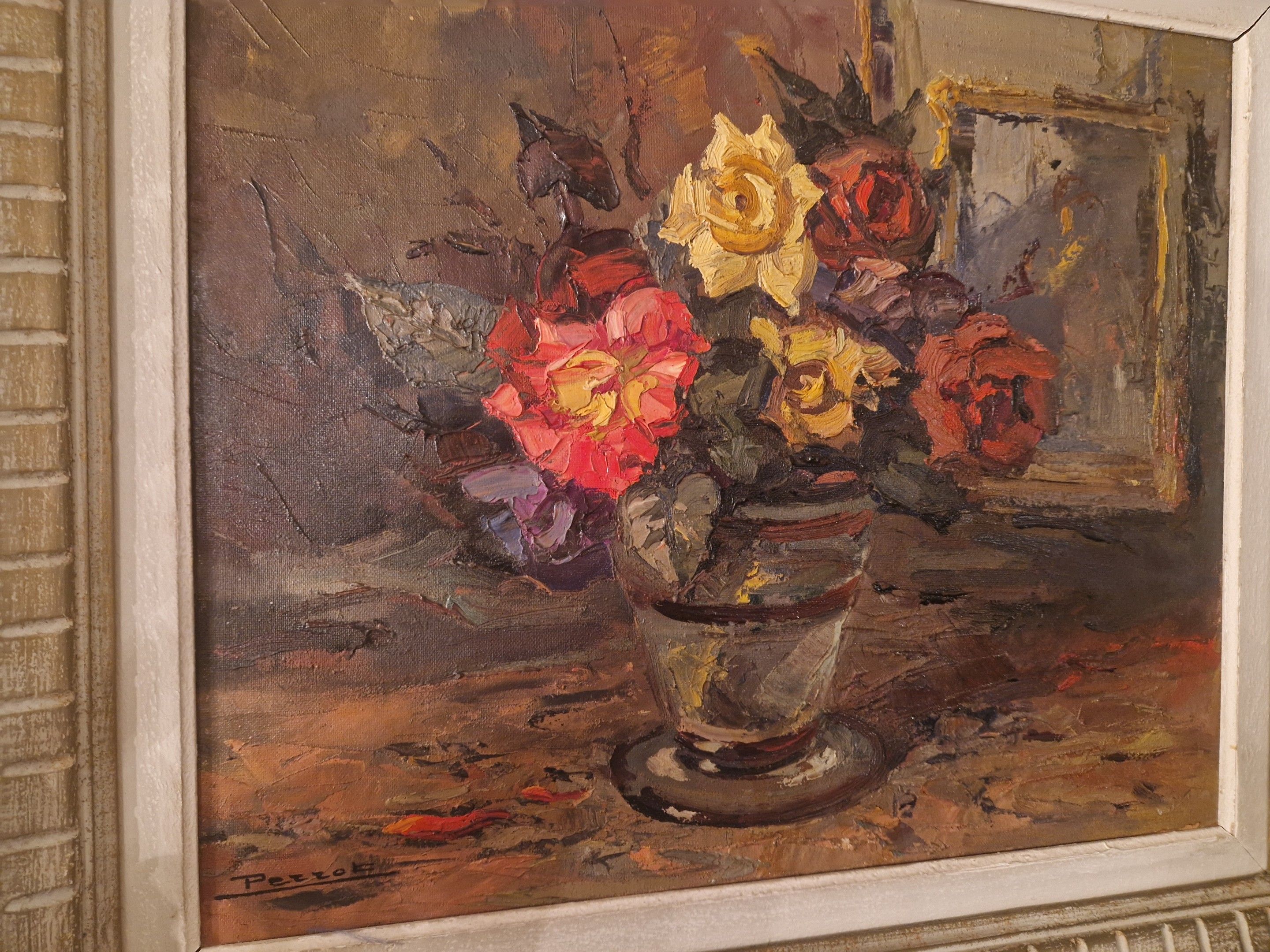 PERROT: "Bouquet of roses". Small oil on canvas, SBG, 38 x 4…