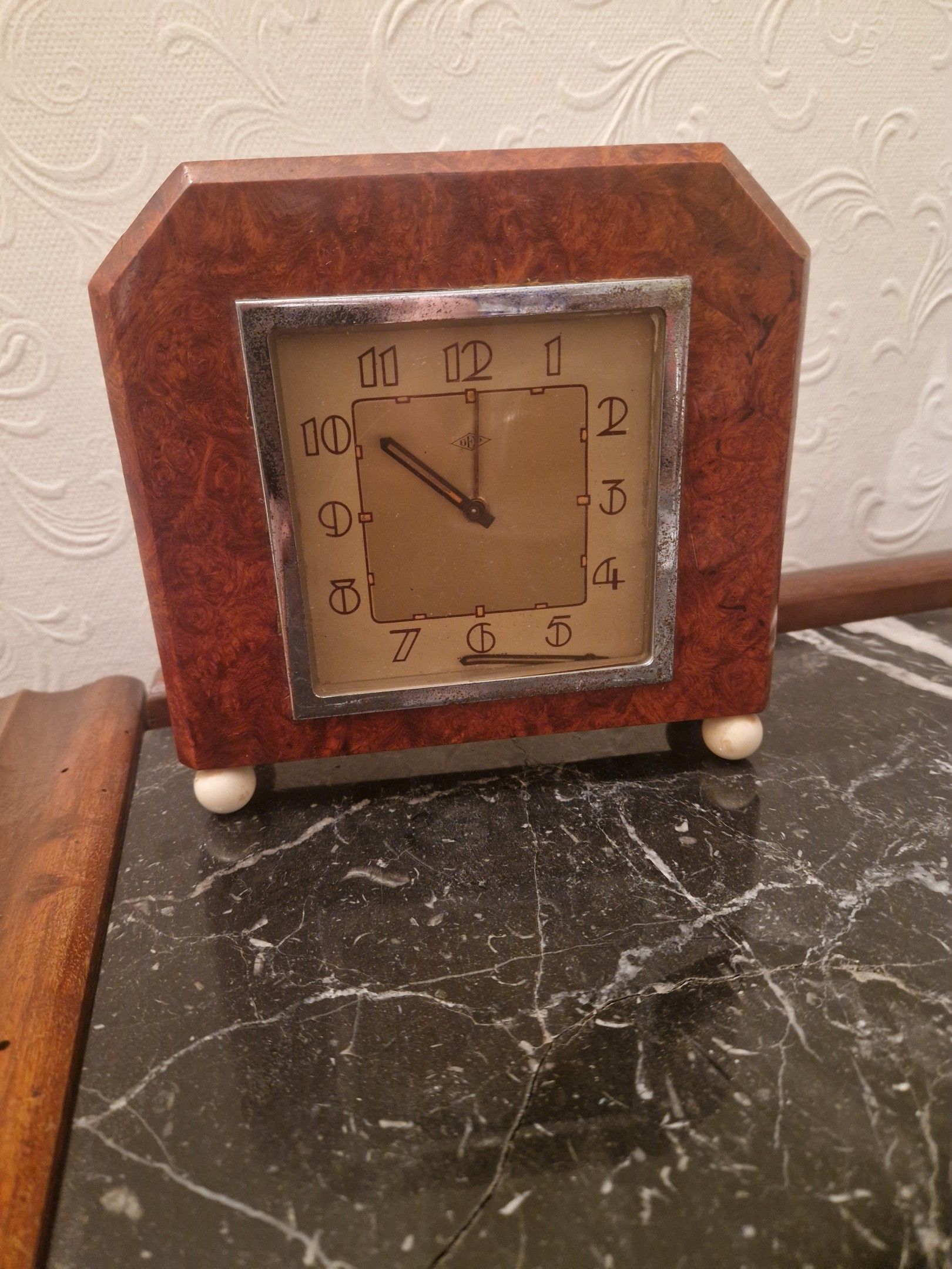 Art Deco burr and composite table clock, mechanical movement, one sweeping hand. 16.5 x 17.5 cm