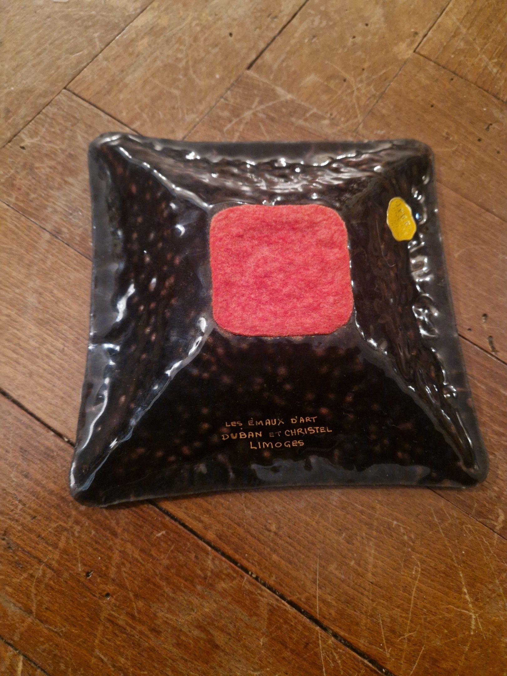 Square enamelled pocket dish by Dubau and Christel in Limoges. 17.5 cm