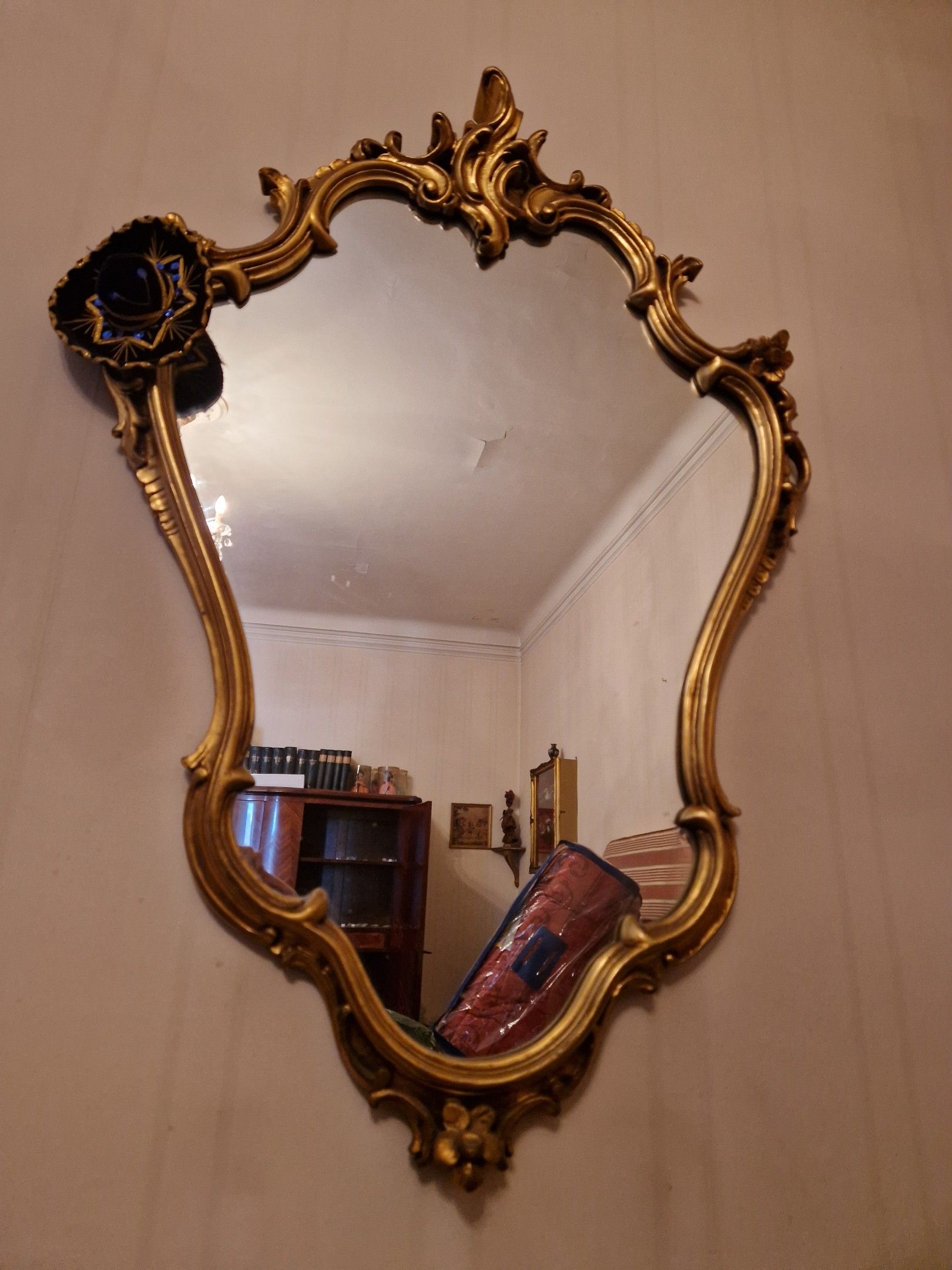 Escutcheon mirror in gilded composition. Height: 98 cm