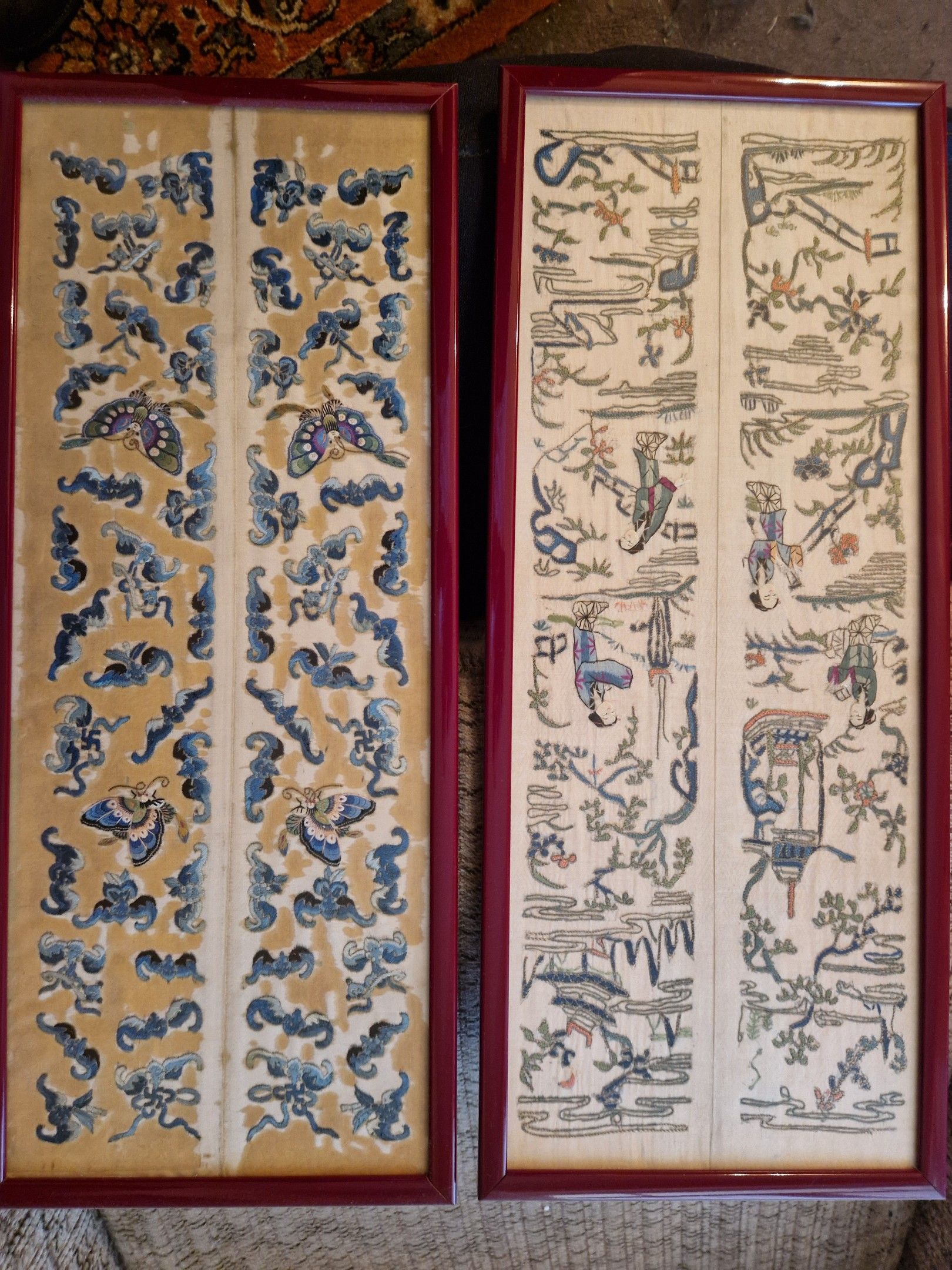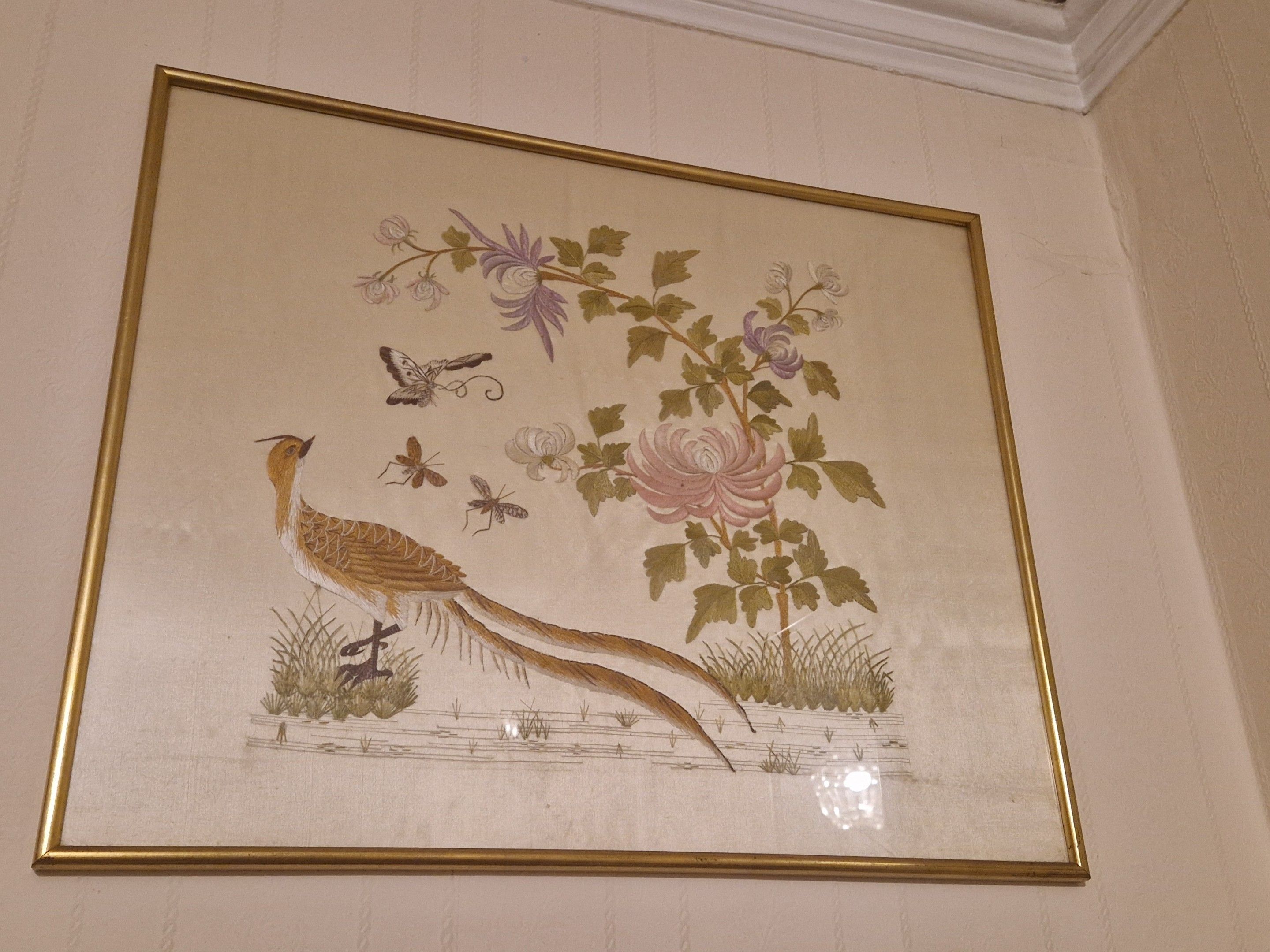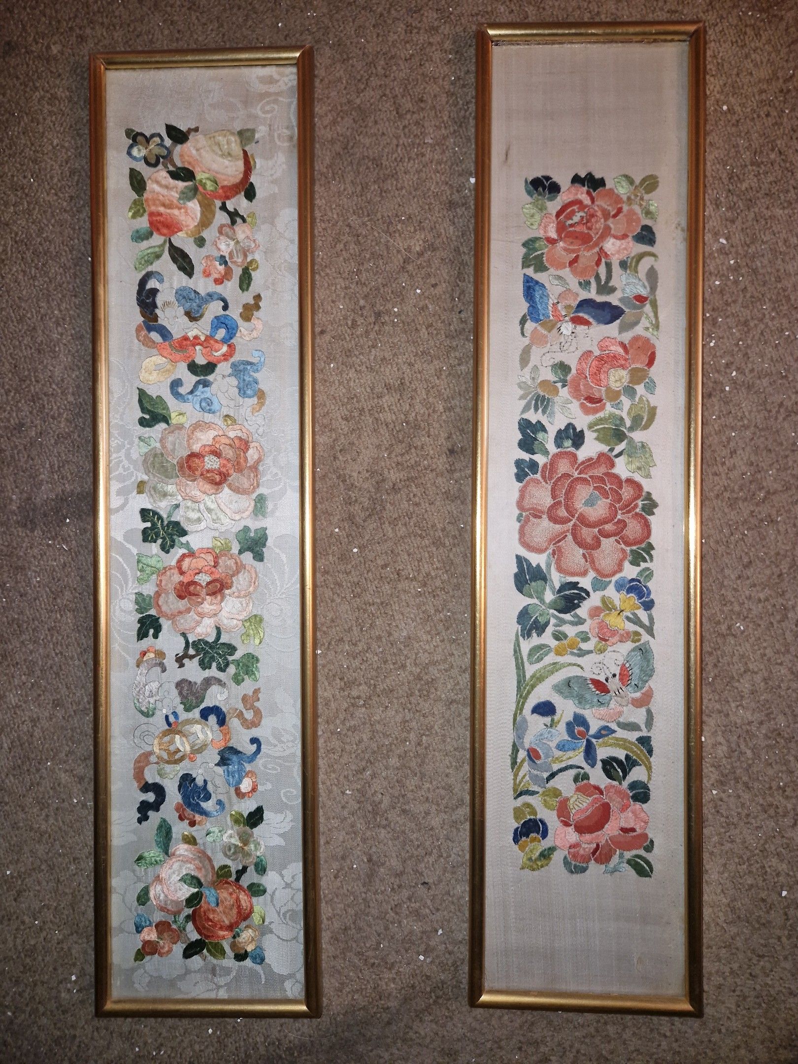 A group of seven small Far Eastern embroideries with floral motifs and furnishings, including a pair with pheasants and one with cranes.