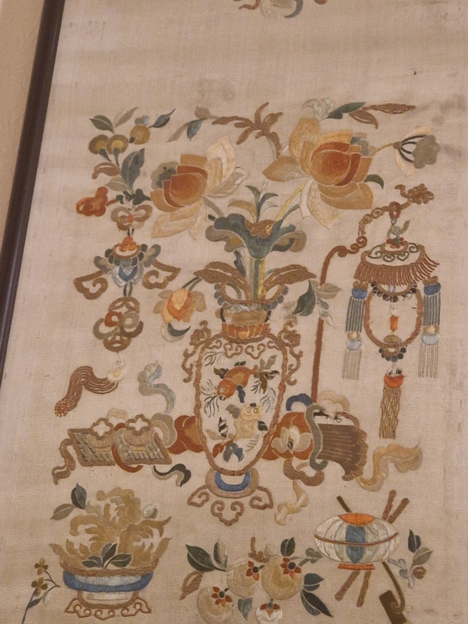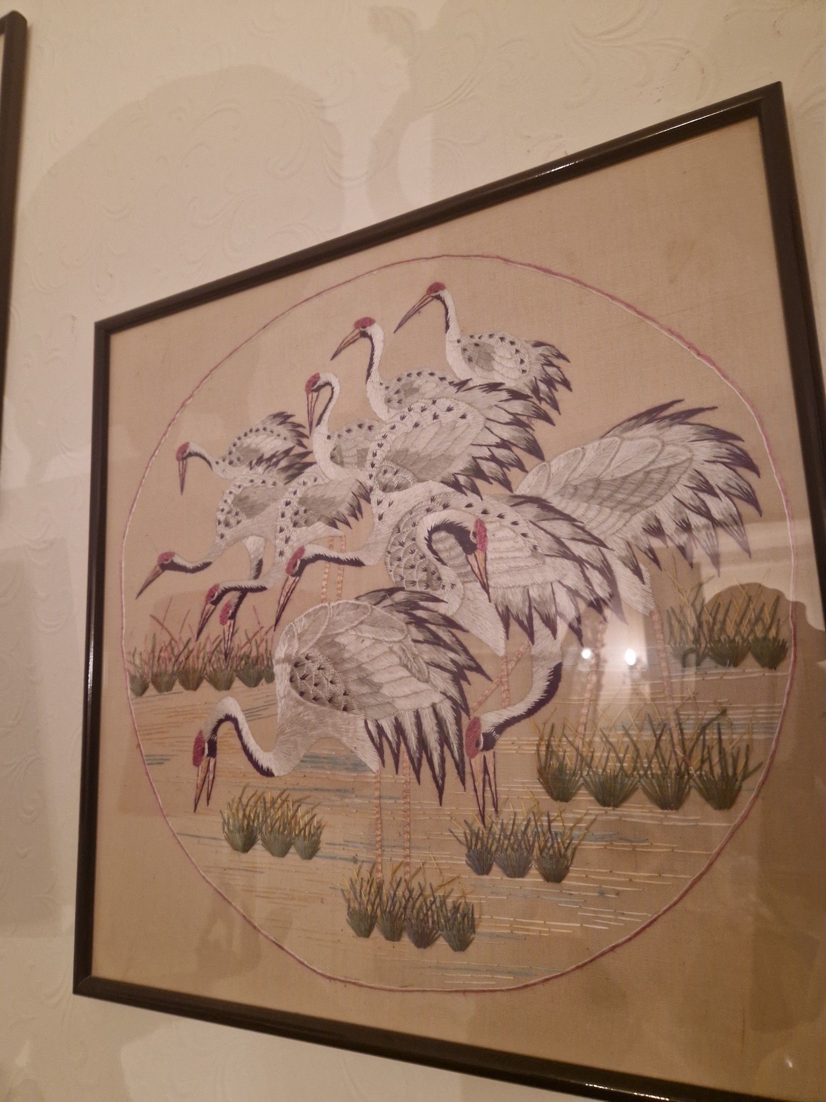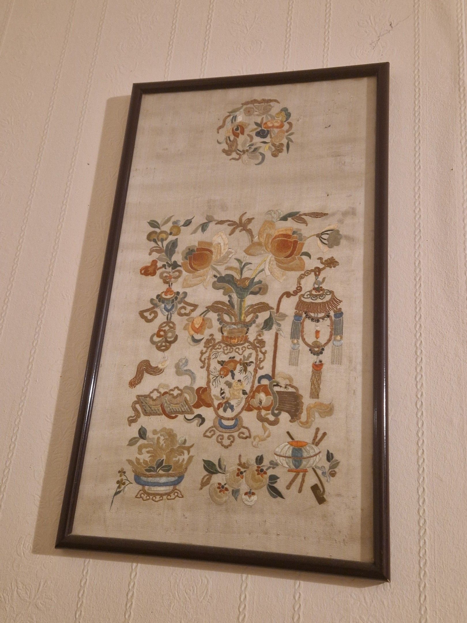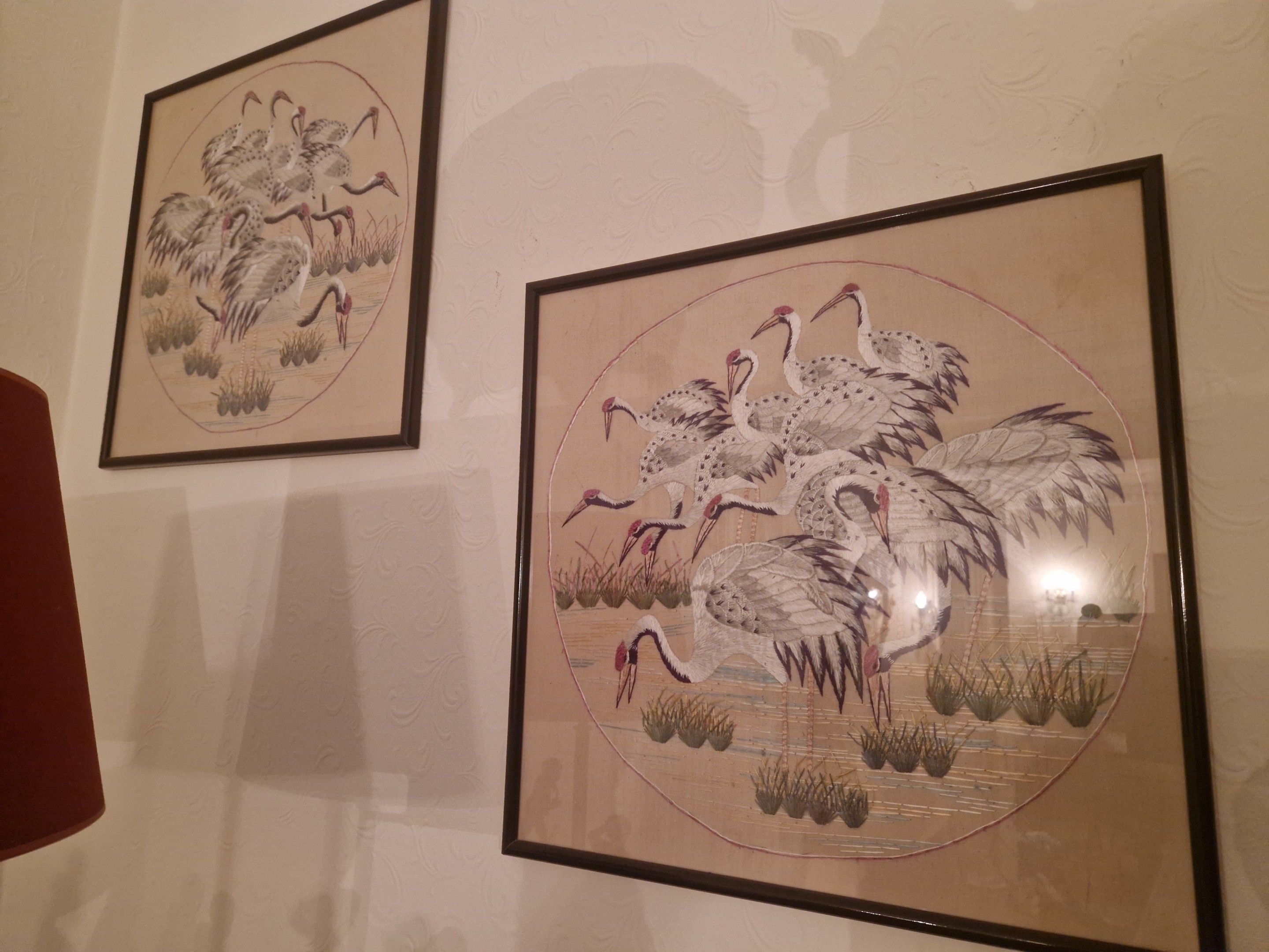 A group of seven small Far Eastern embroideries with floral motifs and furnishings, including a pair with pheasants and one with cranes.