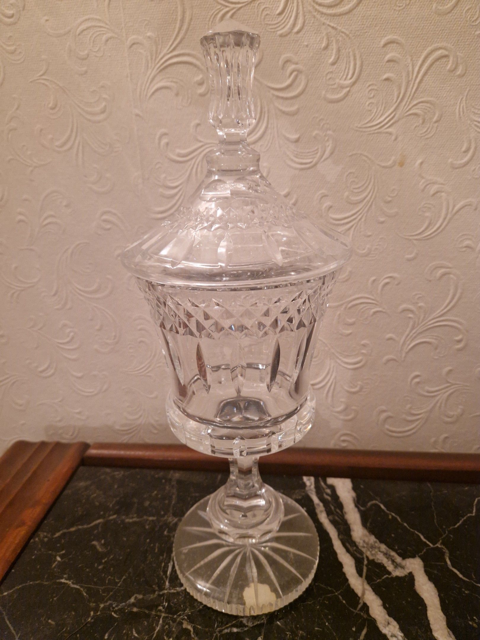 Large covered drageur on pedestal in translucent cut crystal