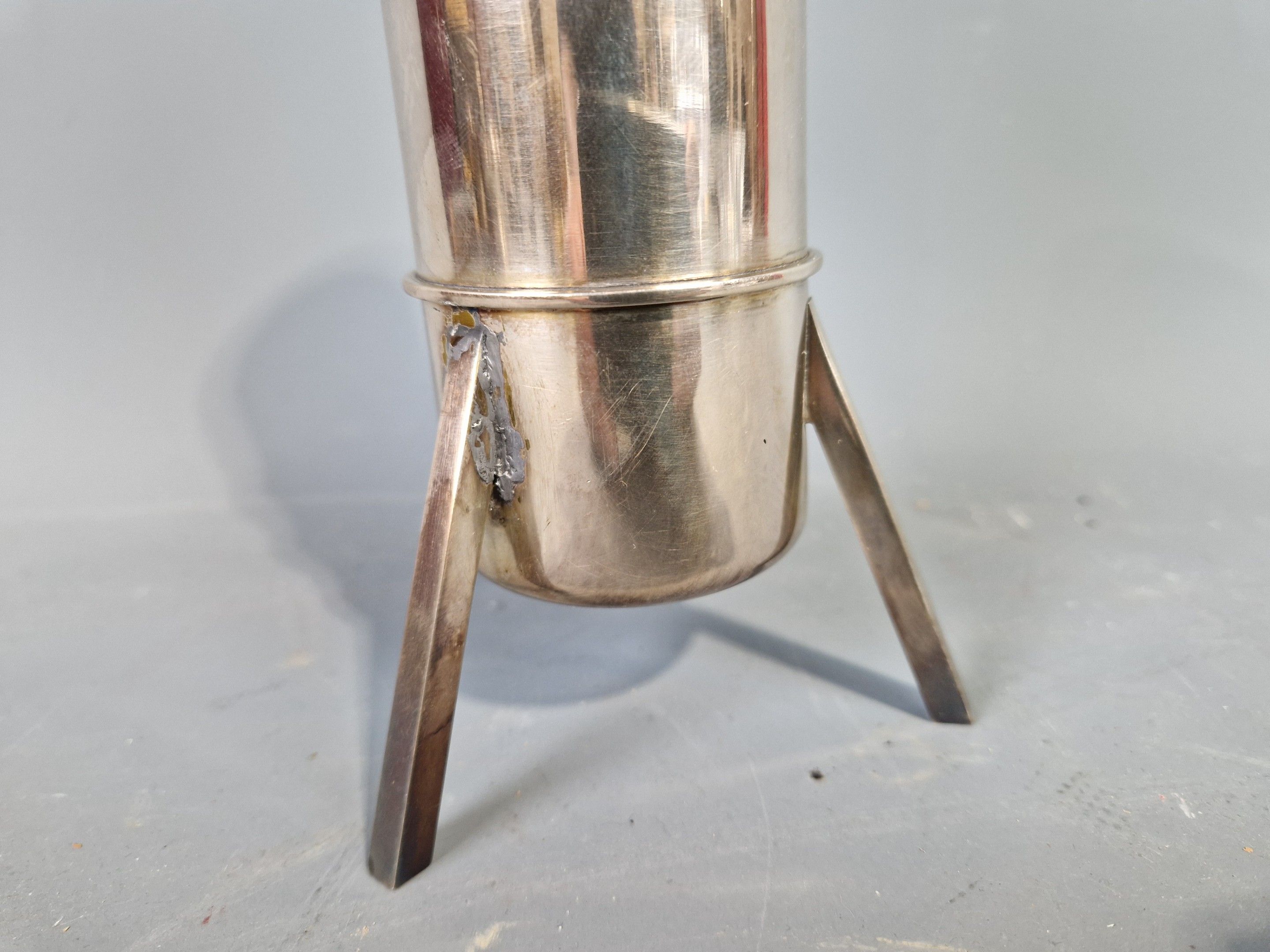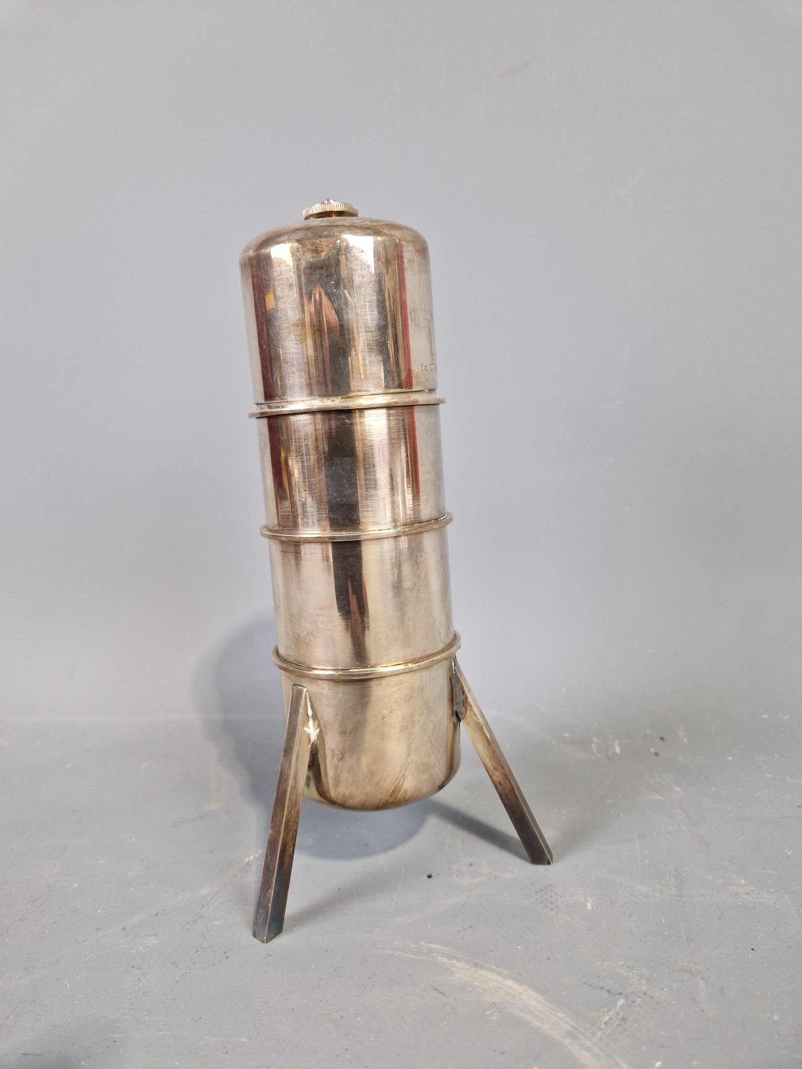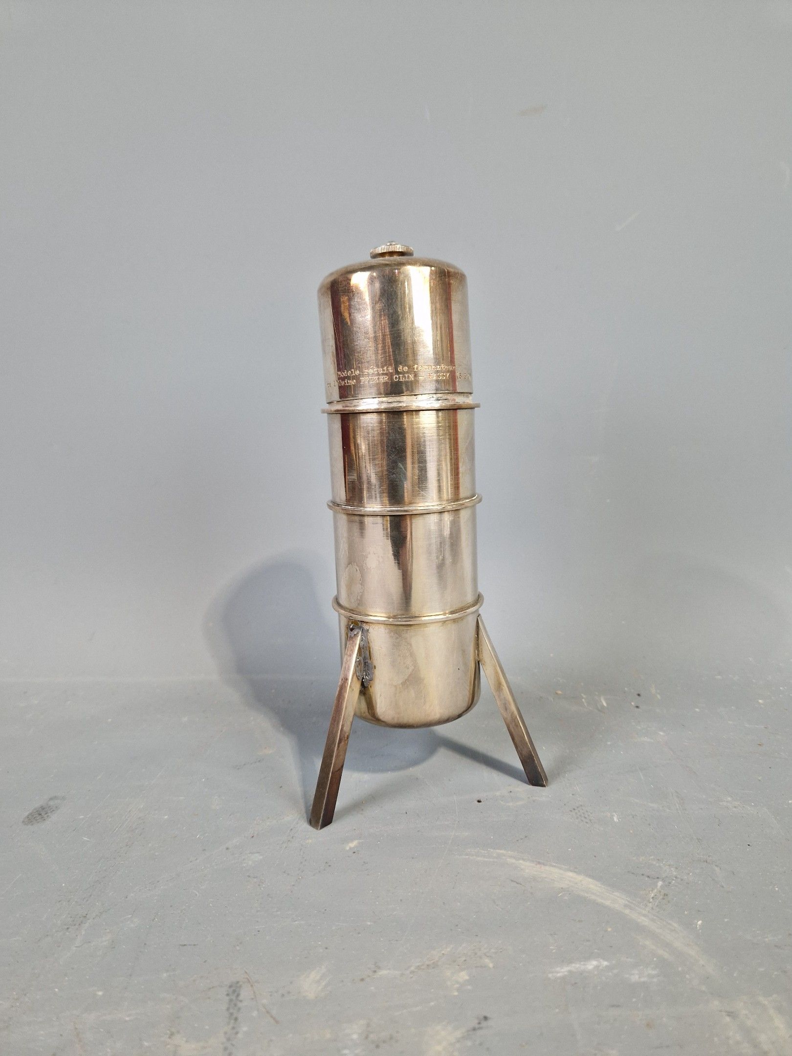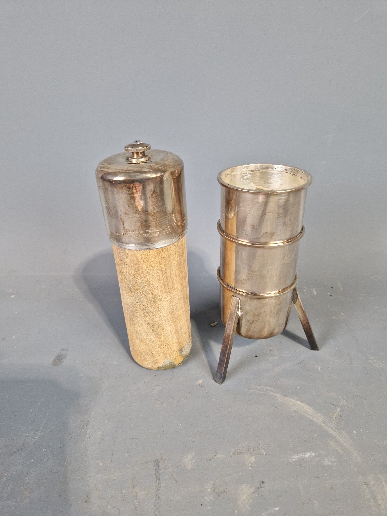 Original three-legged wooden and silver-plated metal pepper mill. It is inscribed "Modèle de fermenteur de l'usine PFIZER CLIN - Massy (S&O)". Height 20 cm. One foot resoldered.