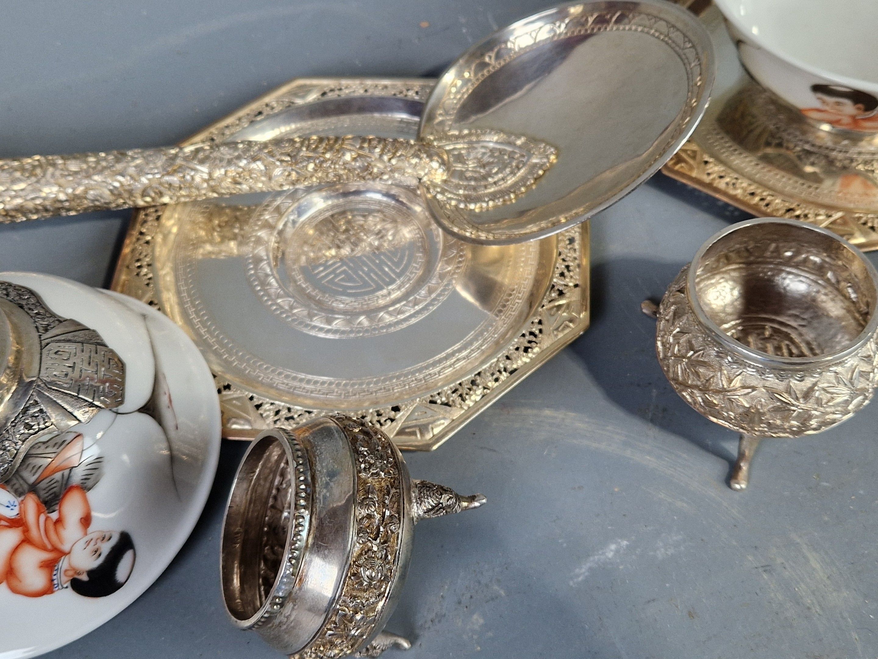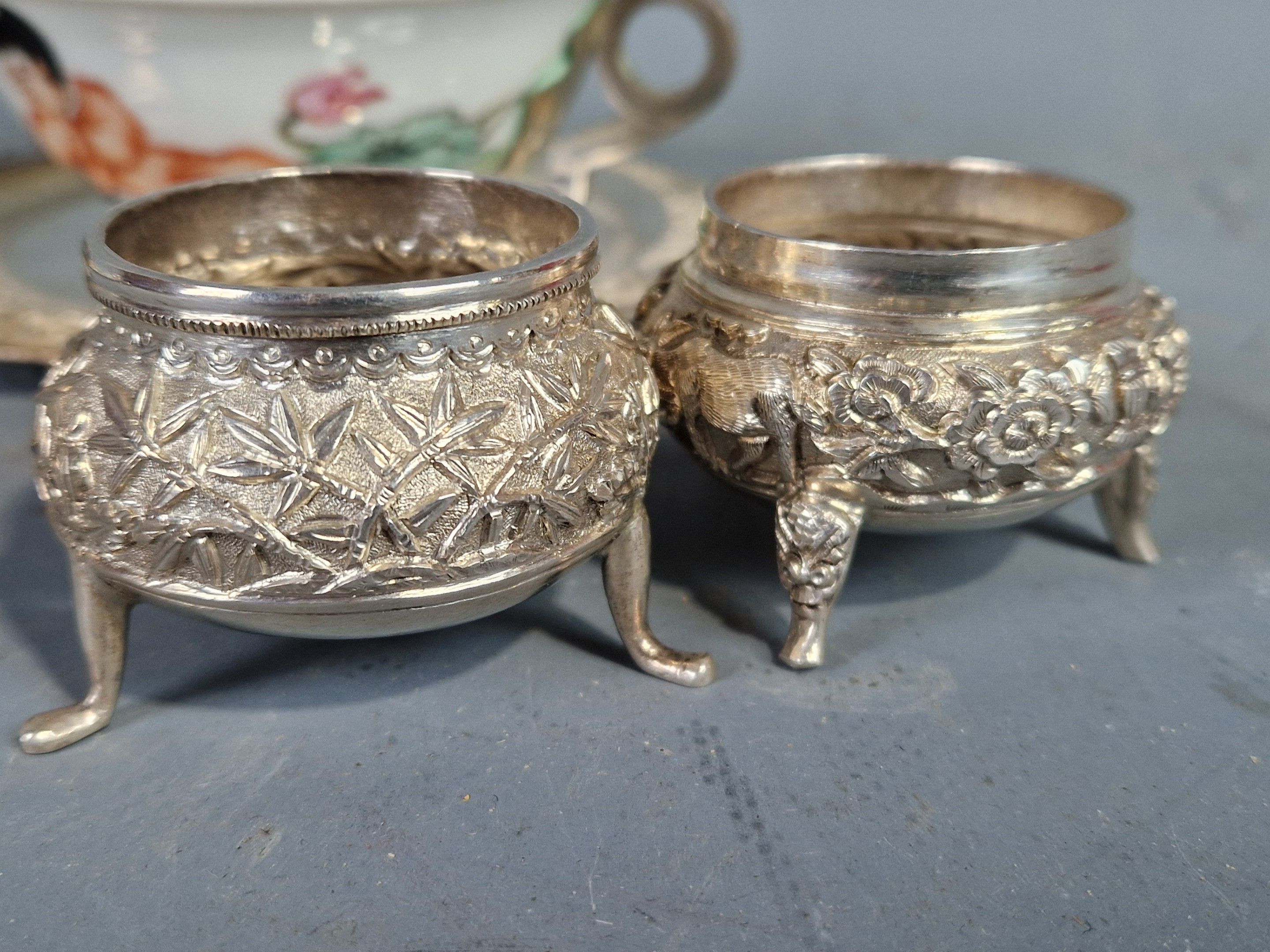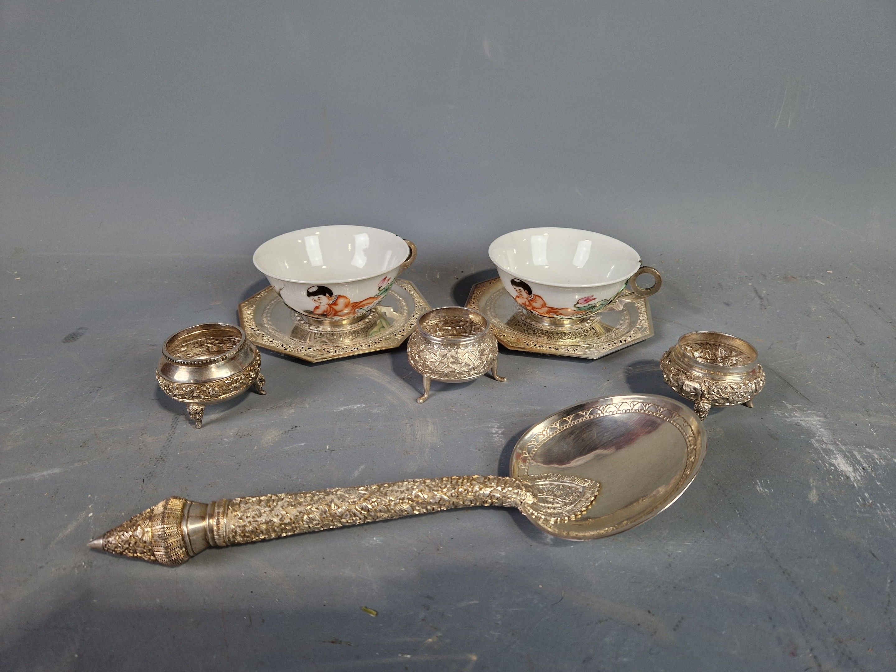 A small set of Chinese and Oriental tableware in alloy and silver-plated metal with rich engraved and openwork plant decoration. It includes two porcelain cups painted with a figure with mounts and saucers, 3 tripod salt shakers and a cream spoon.