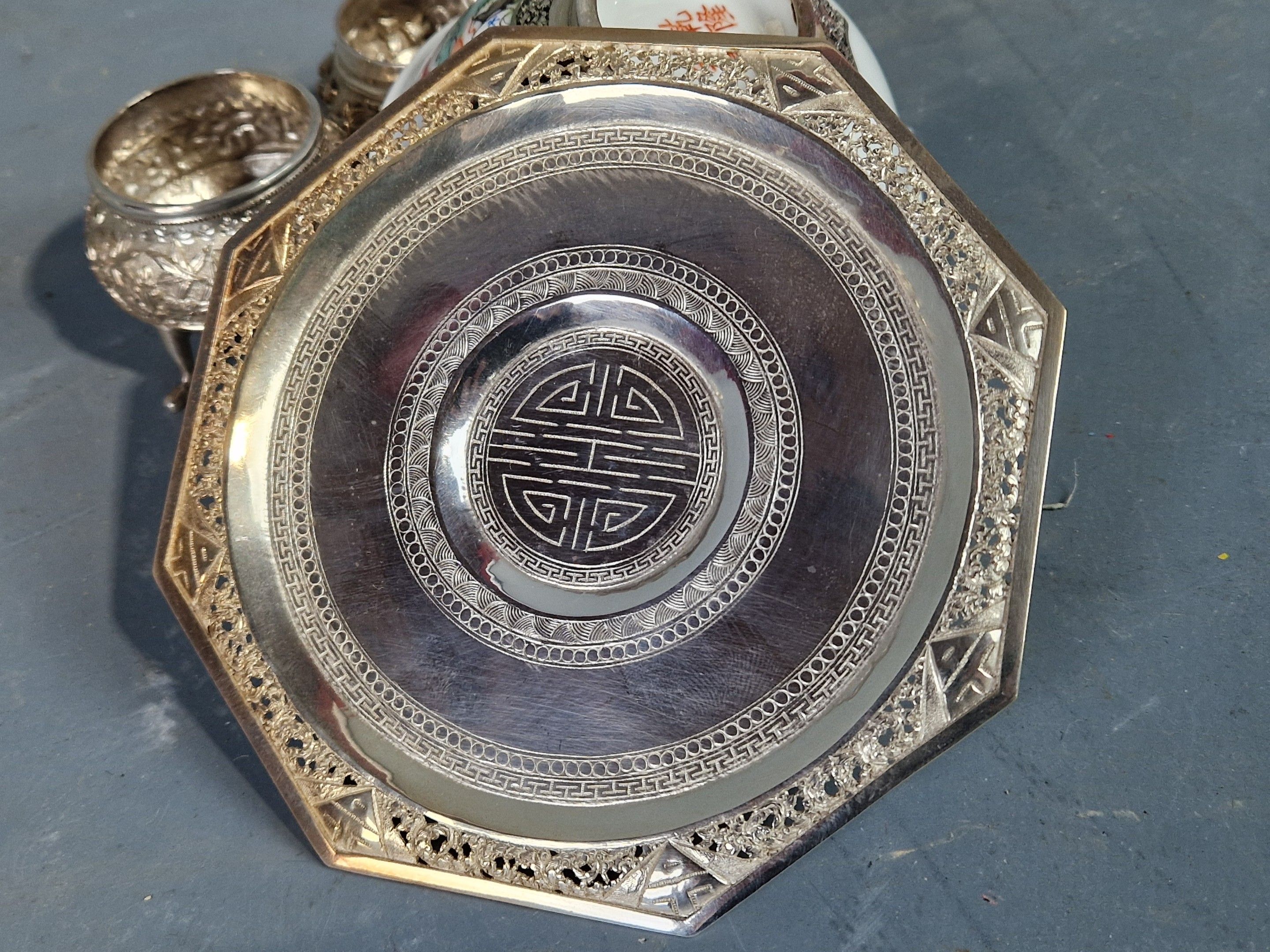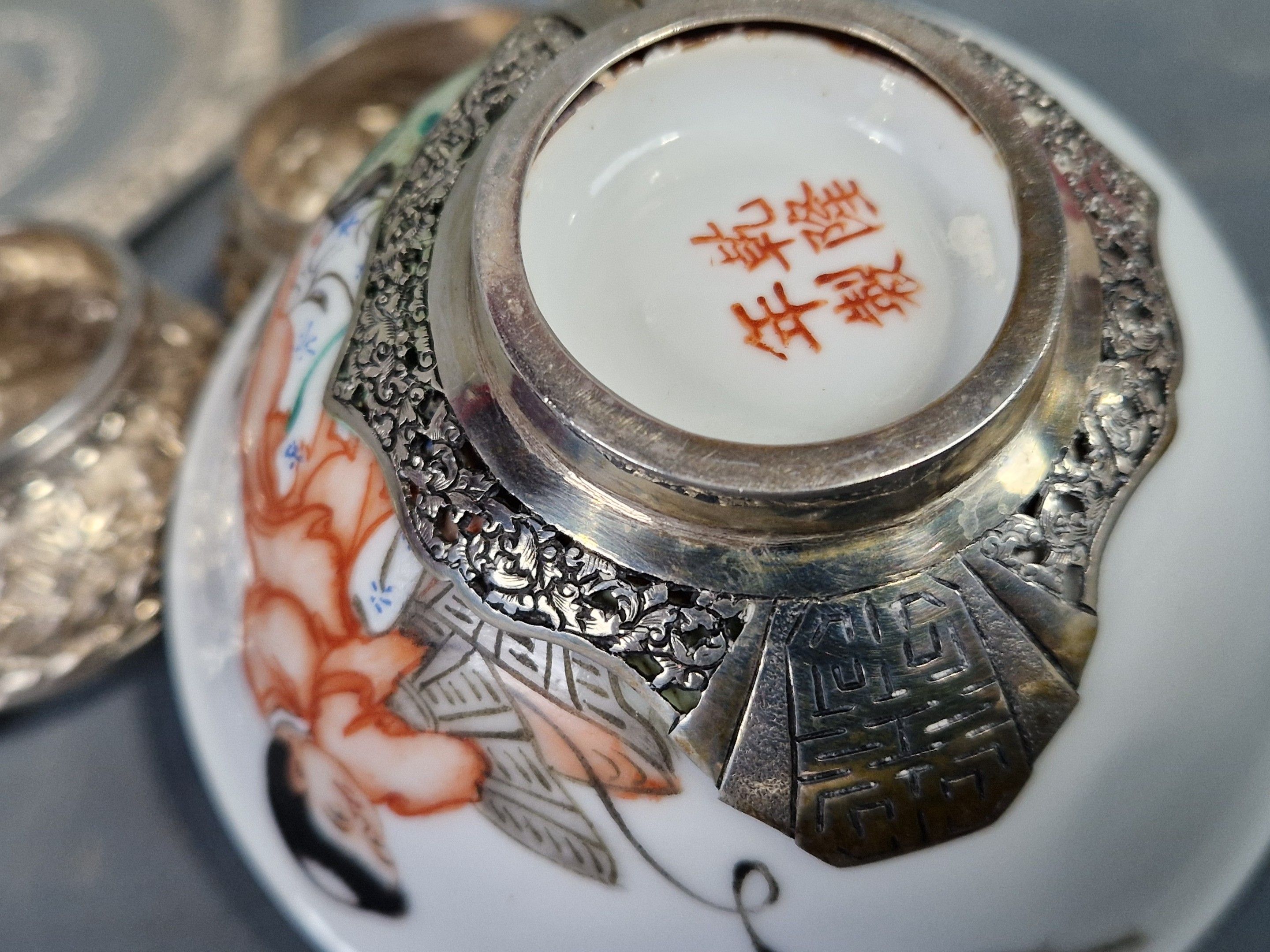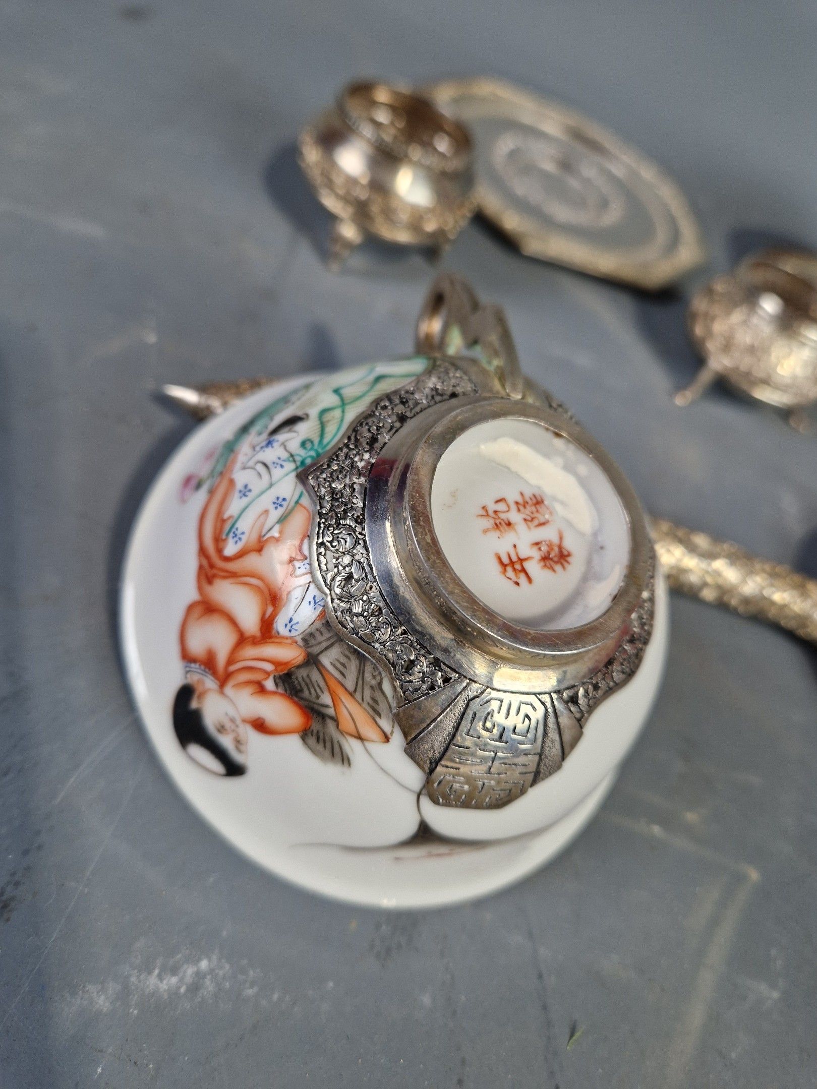 A small set of Chinese and Oriental tableware in alloy and silver-plated metal with rich engraved and openwork plant decoration. It includes two porcelain cups painted with a figure with mounts and saucers, 3 tripod salt shakers and a cream spoon.