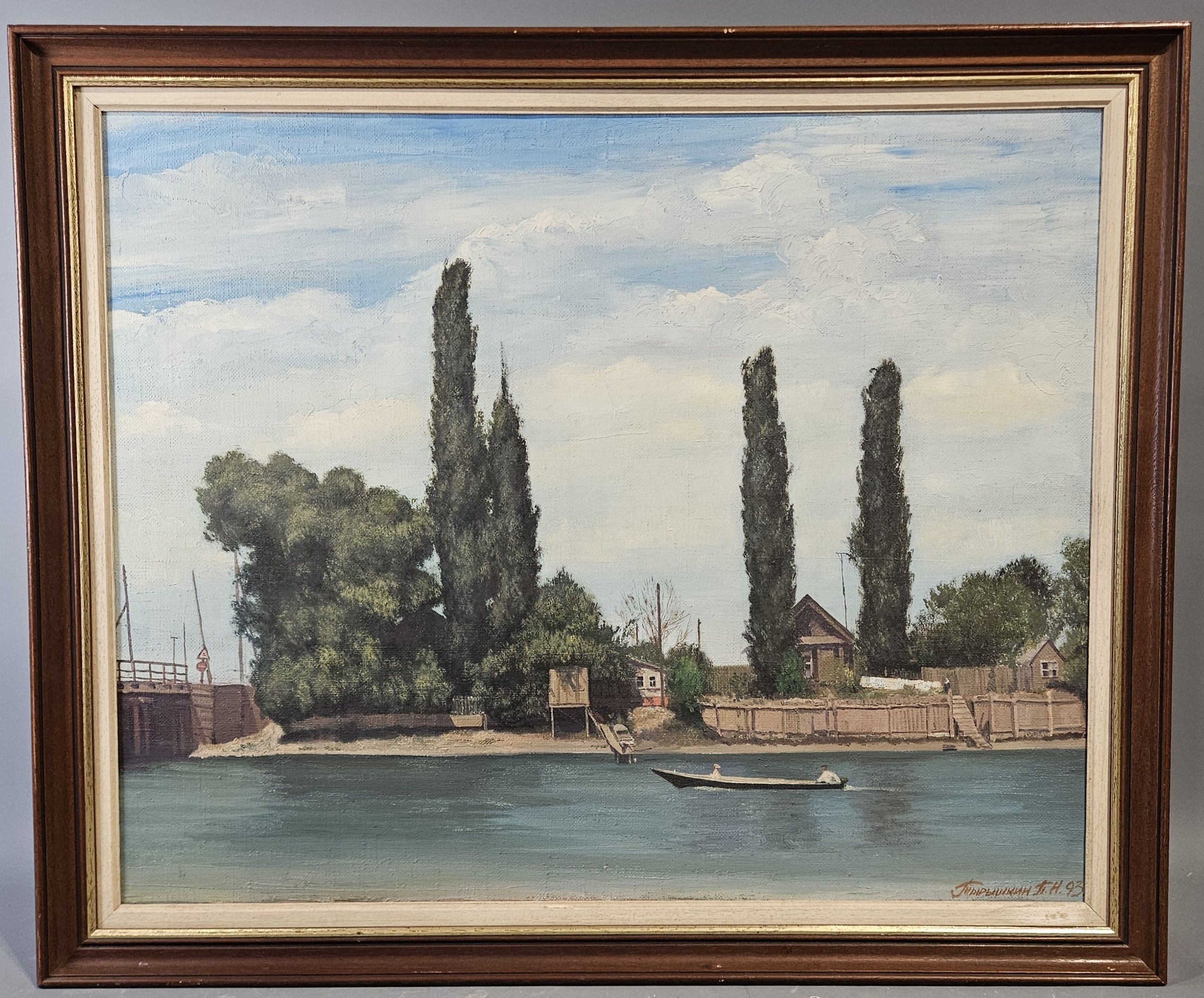 Pavel TYRYSHKIN, Contemporary Russian School: "House on the Volga". Oil on canvas, SBD and dated (19)93, annotated in Cyrillic on the back, 65 x 80.5 cm