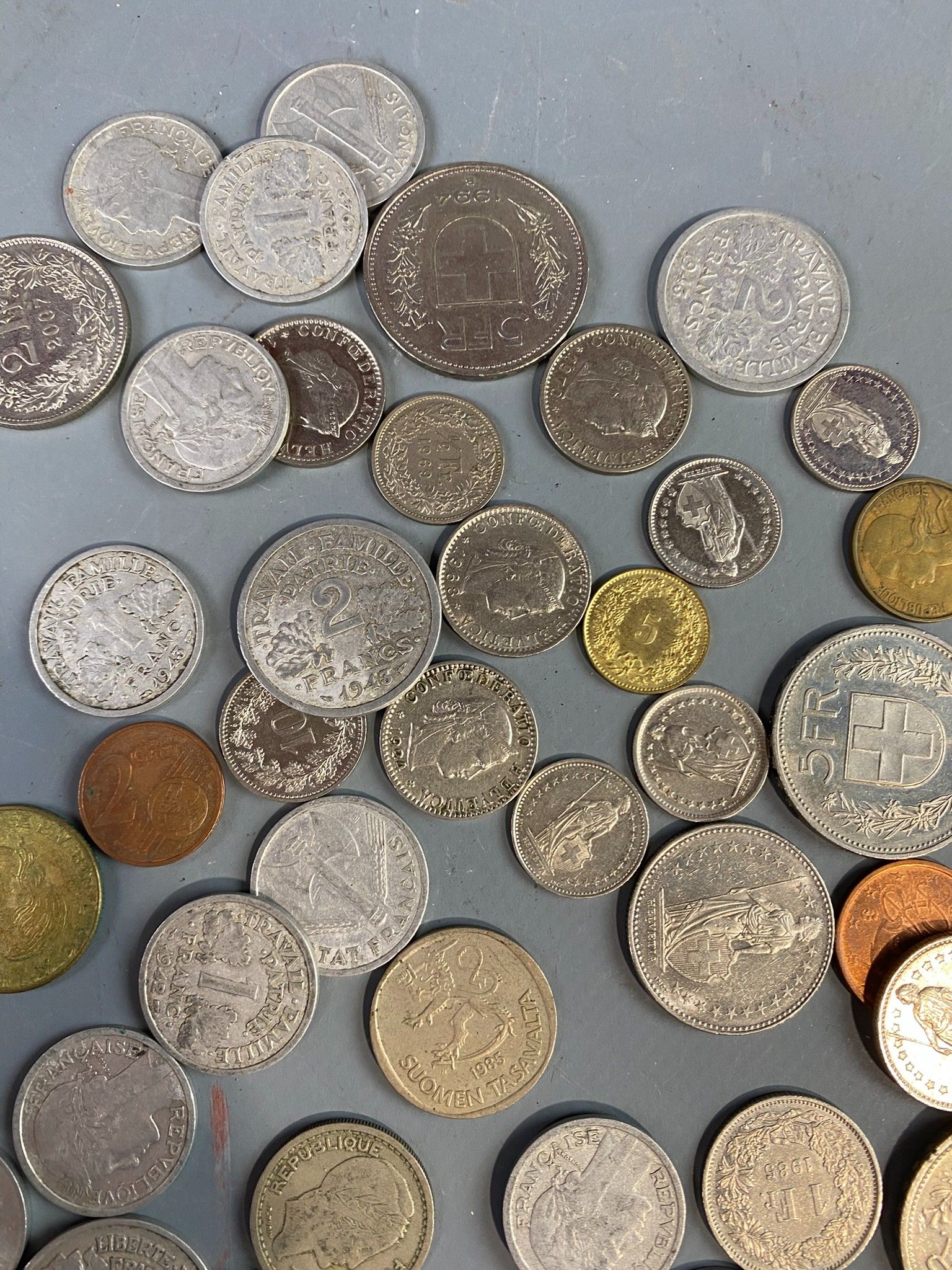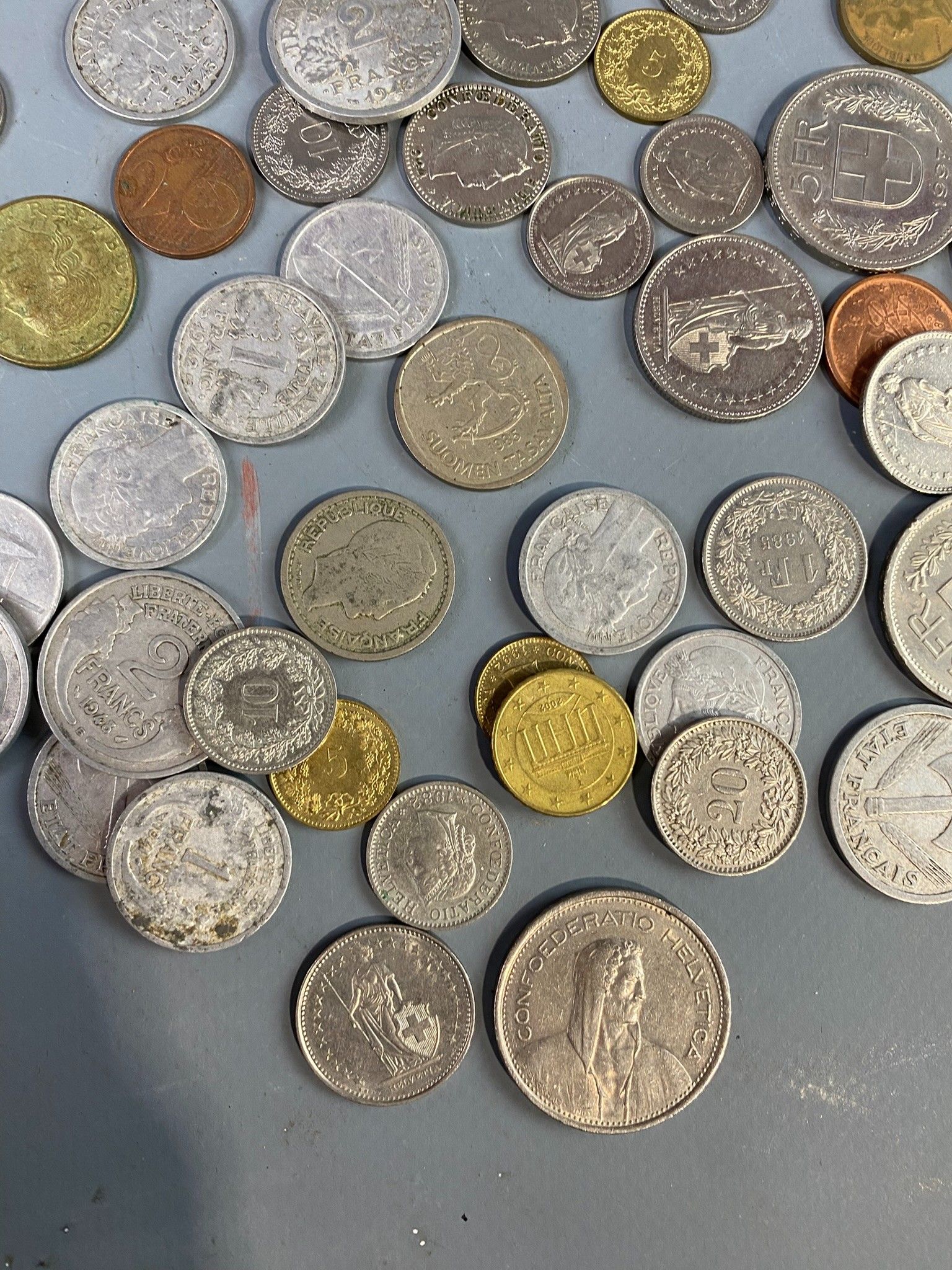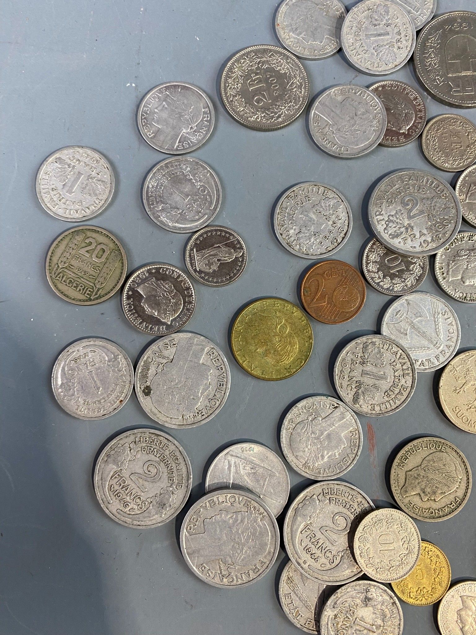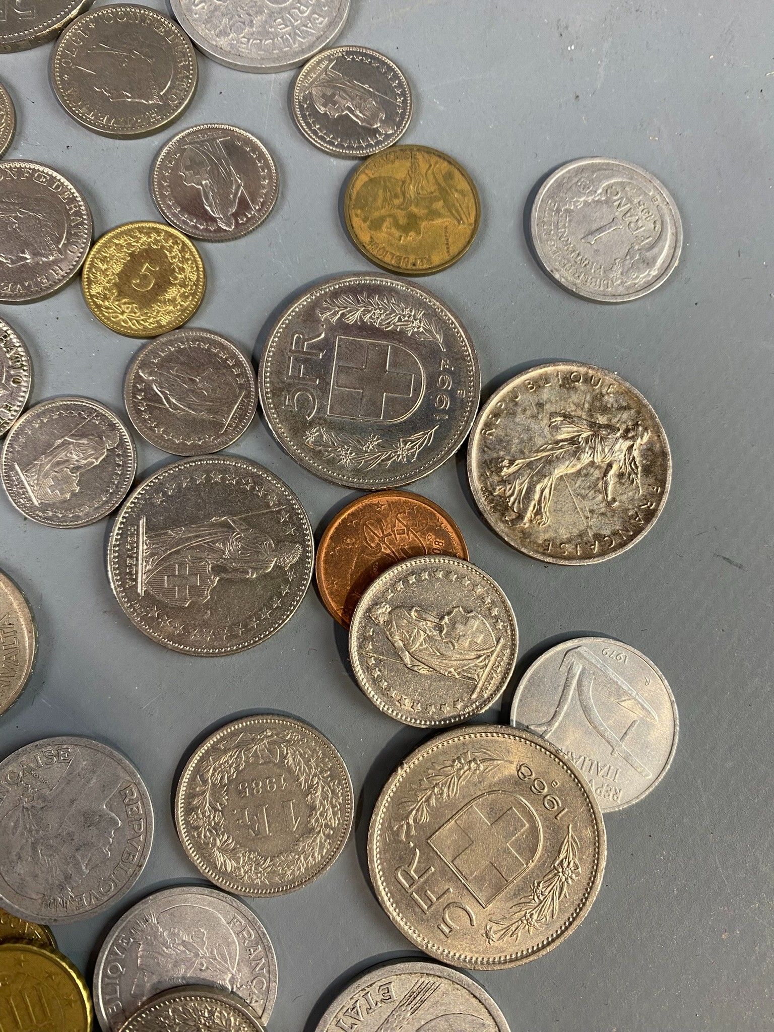 Set of drawer bottoms including a few demonetised current coins from France and Switzerland and a few silver modules.