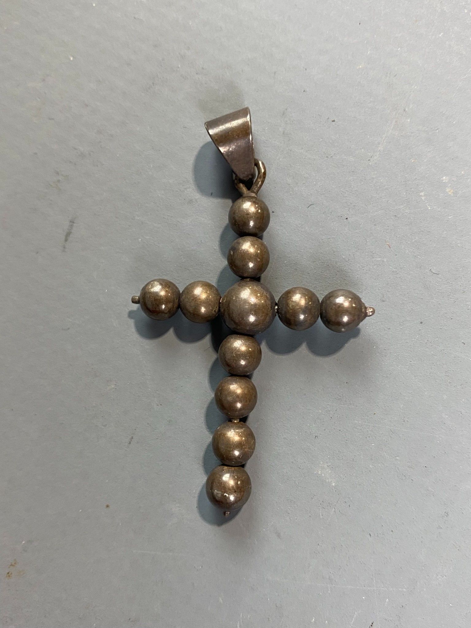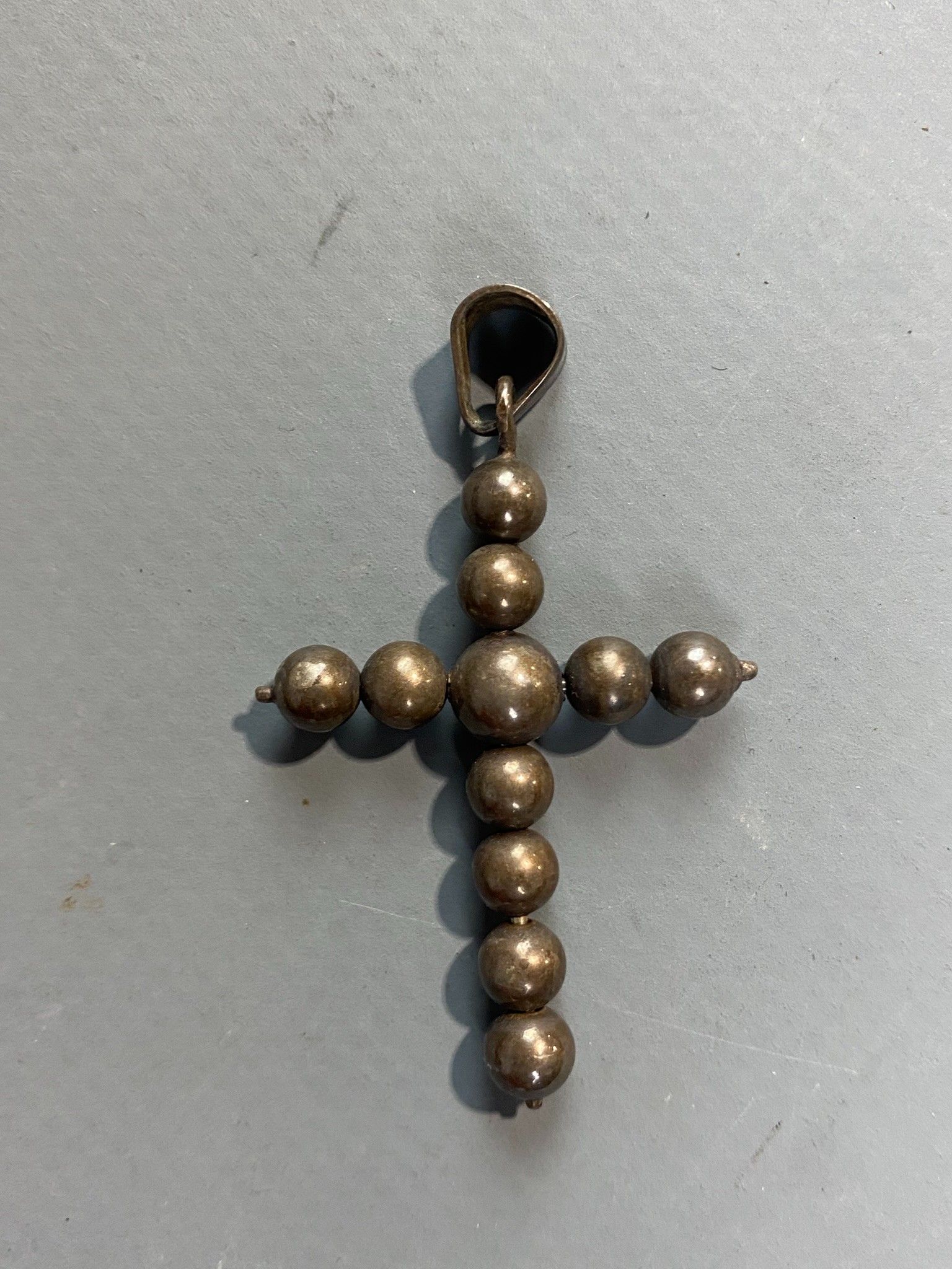 Cross pendant in silver beads, French work (in rules, 5.6 gr). 40 x 30 mm (without clasp)