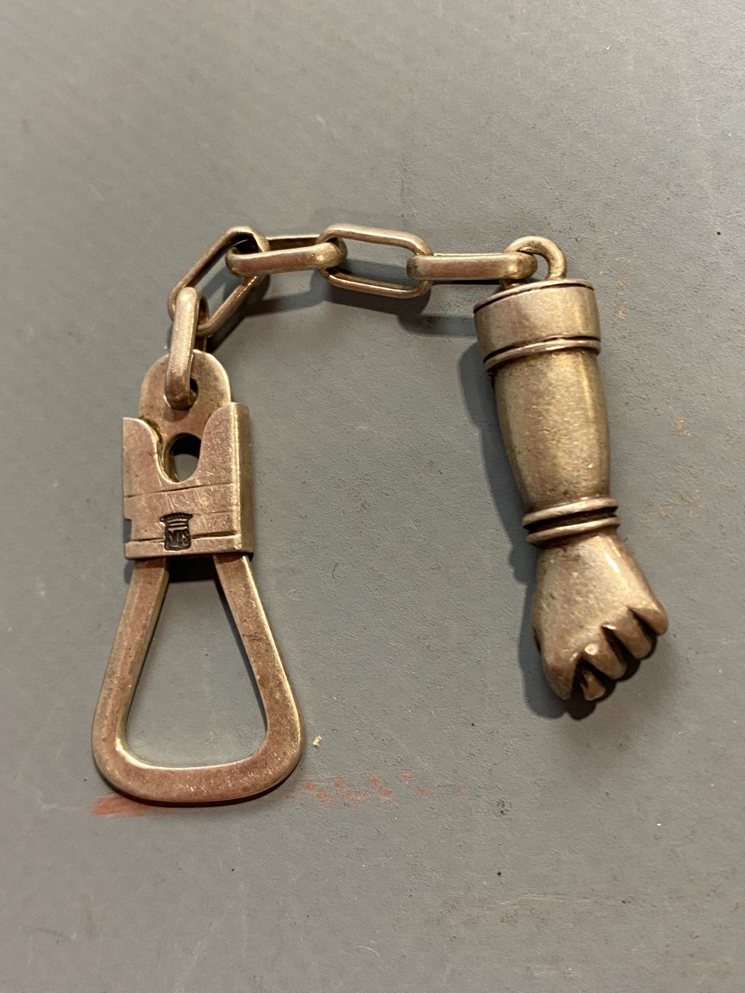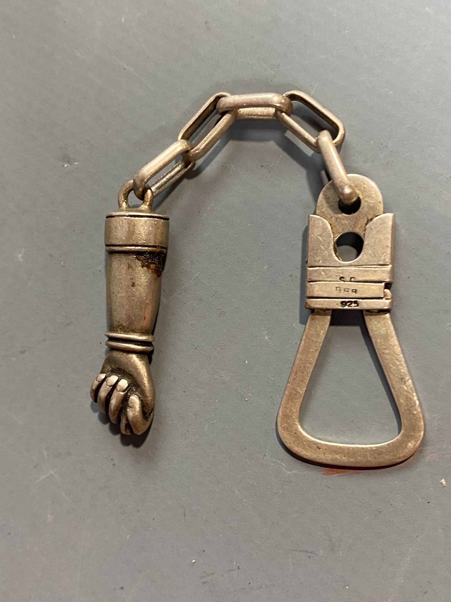 Silver keyring (weight tolerance: 19.2 g) holding a figa. Crowned hallmark and 925 mark. Probably Brazilian work