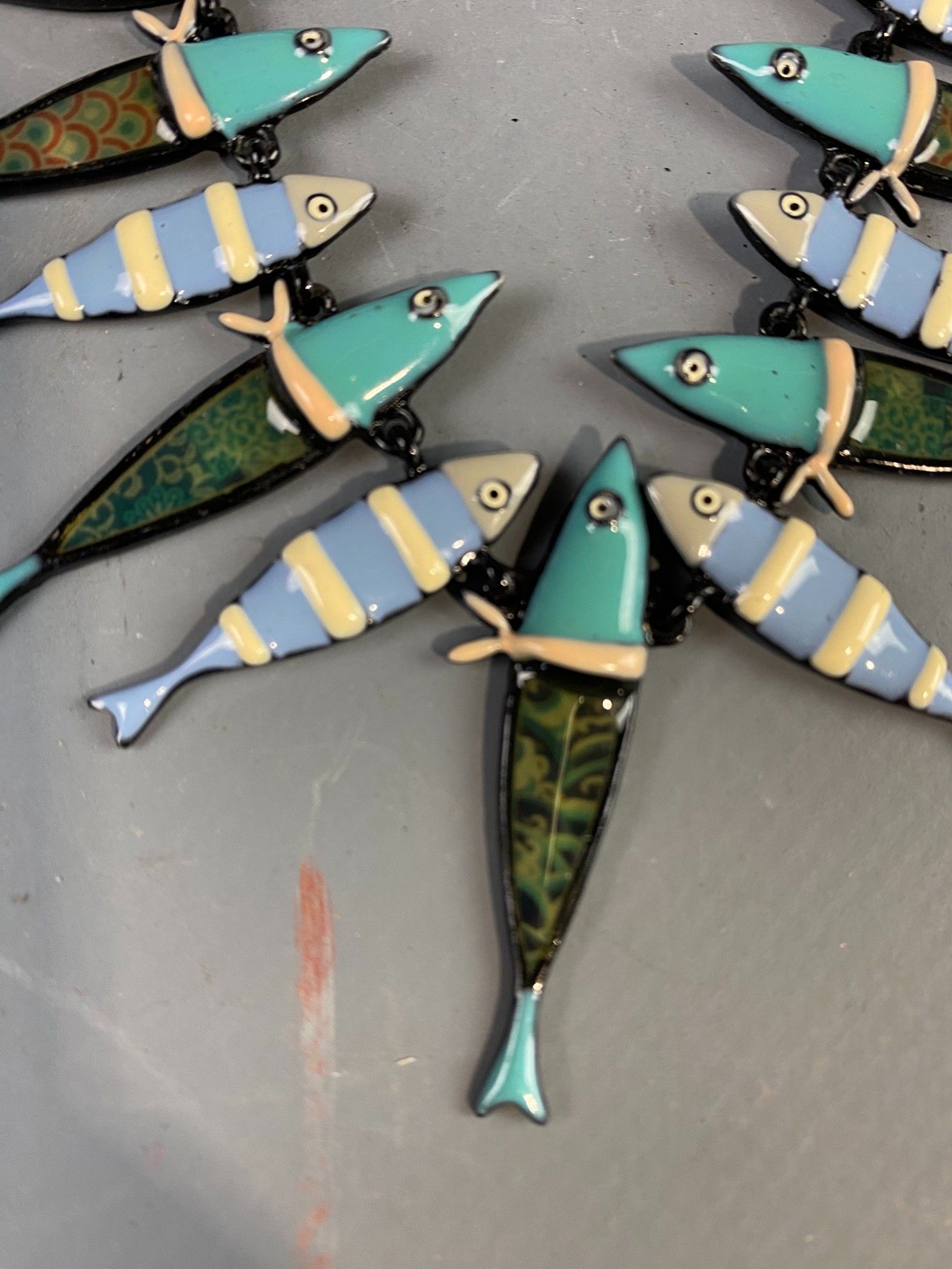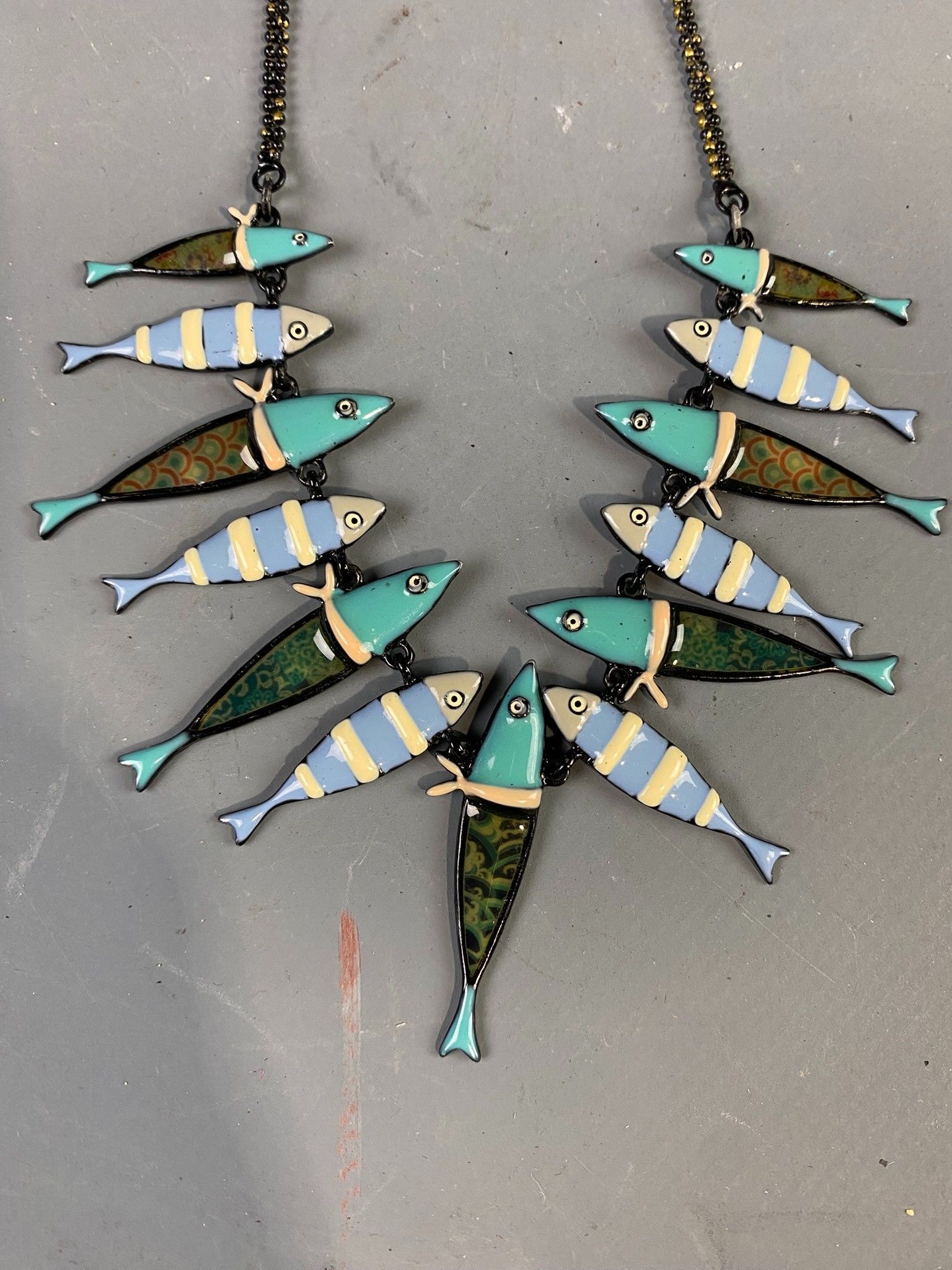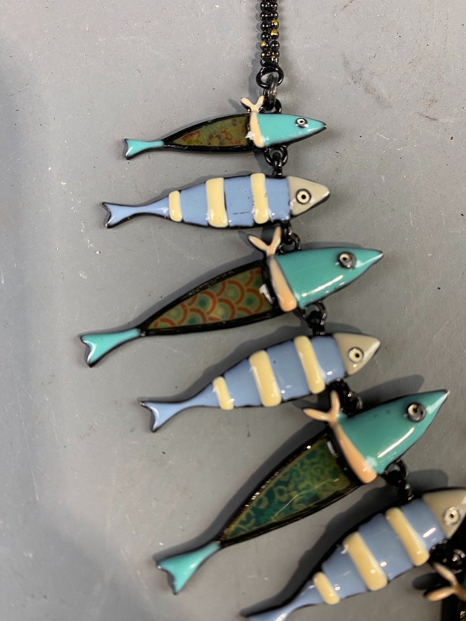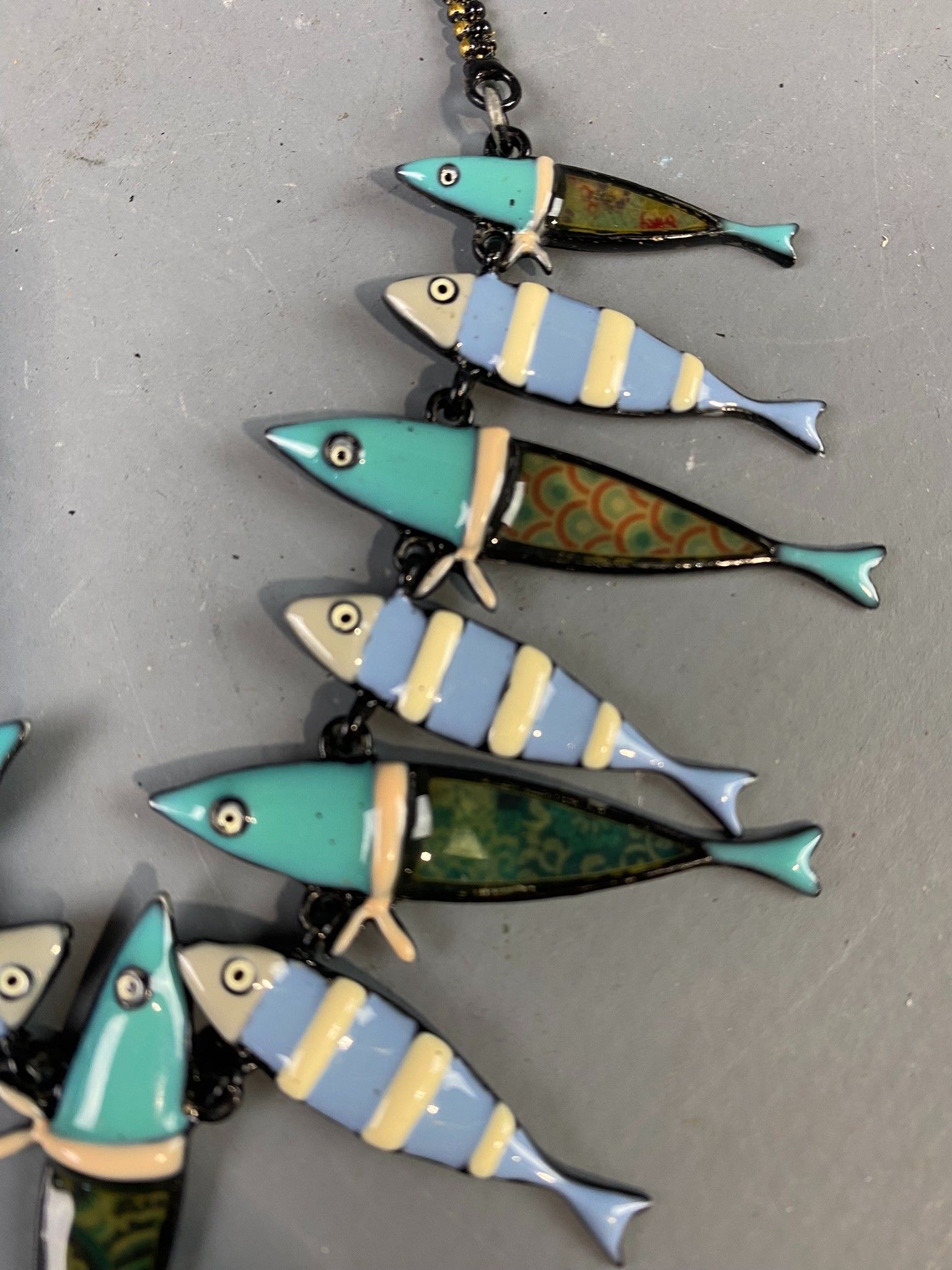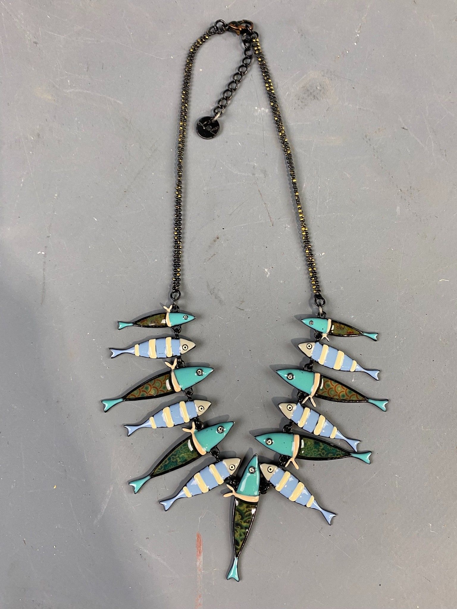 LOL BIJOUX: "Bonne Pêche" necklace in black lacquered metal and enamelled with a drapery motif of thirteen fish in shades of blue. Minimum length: 43 cm