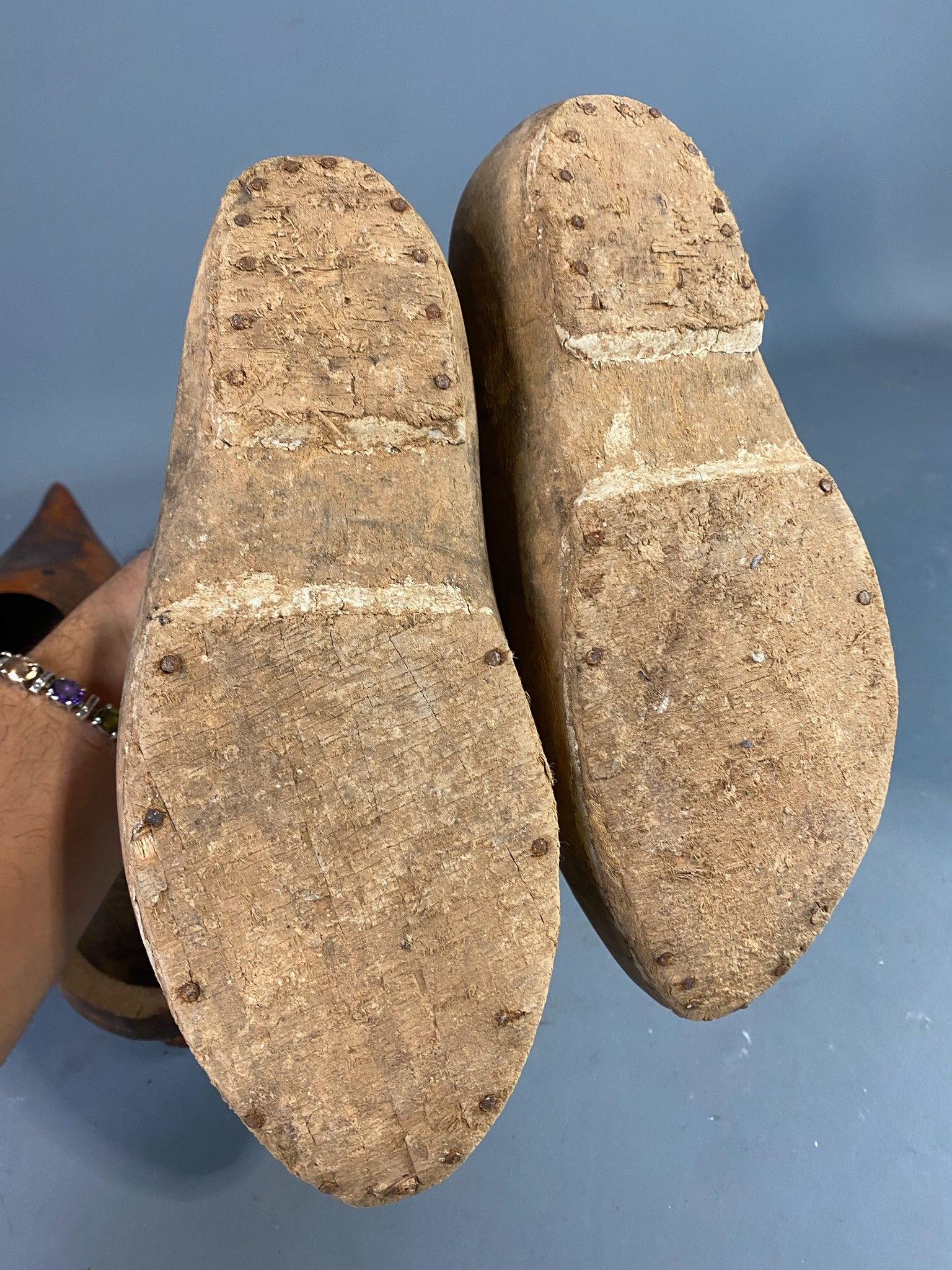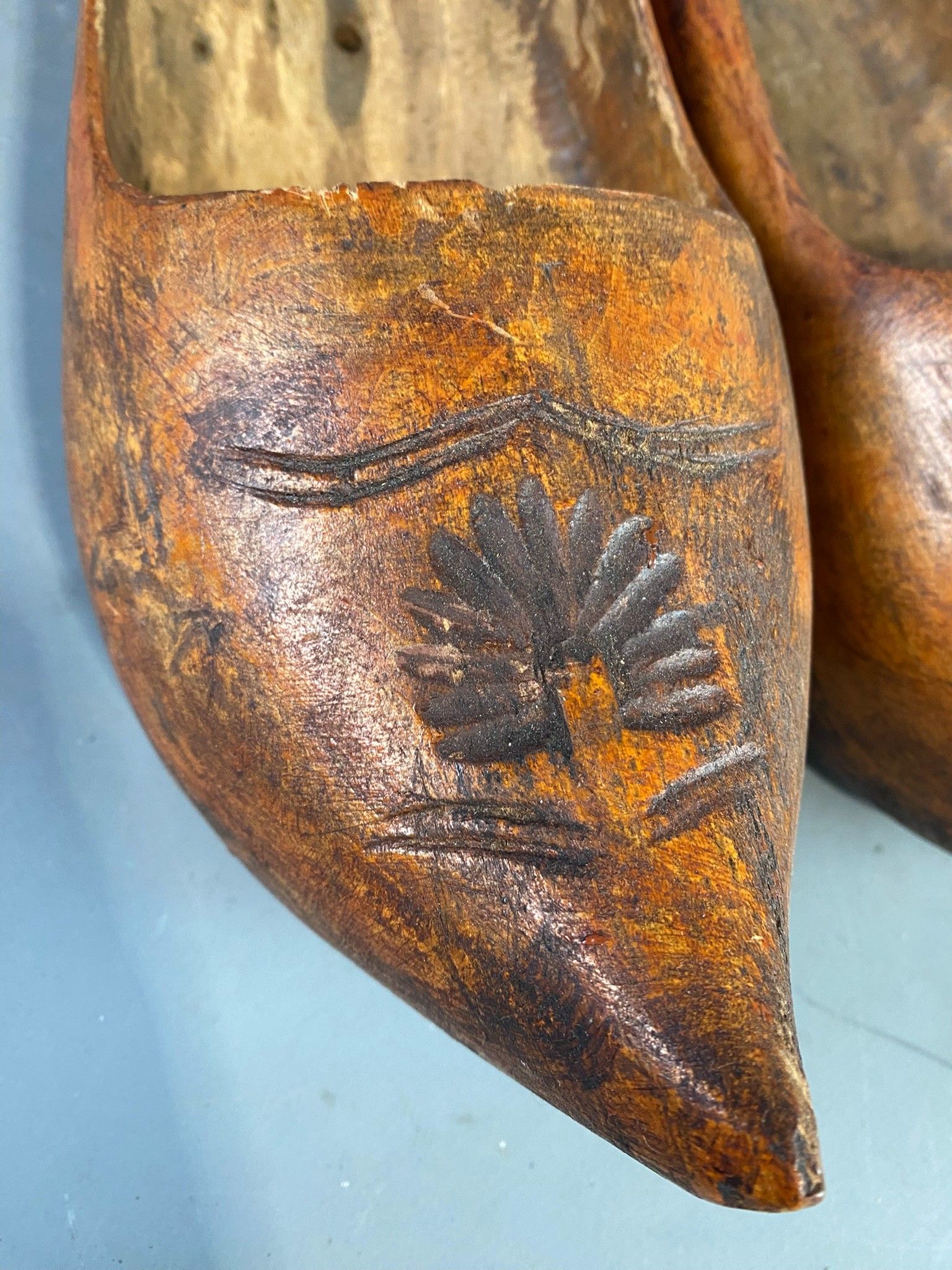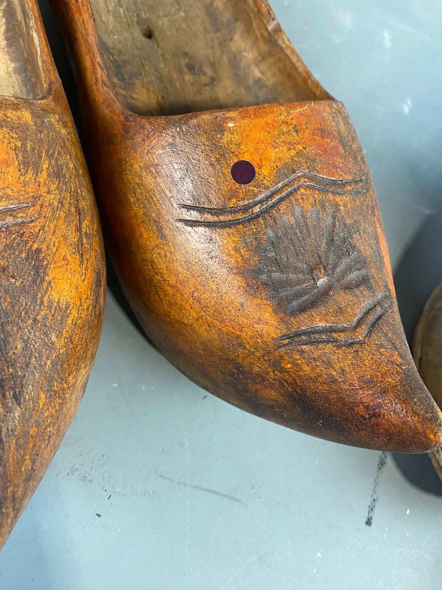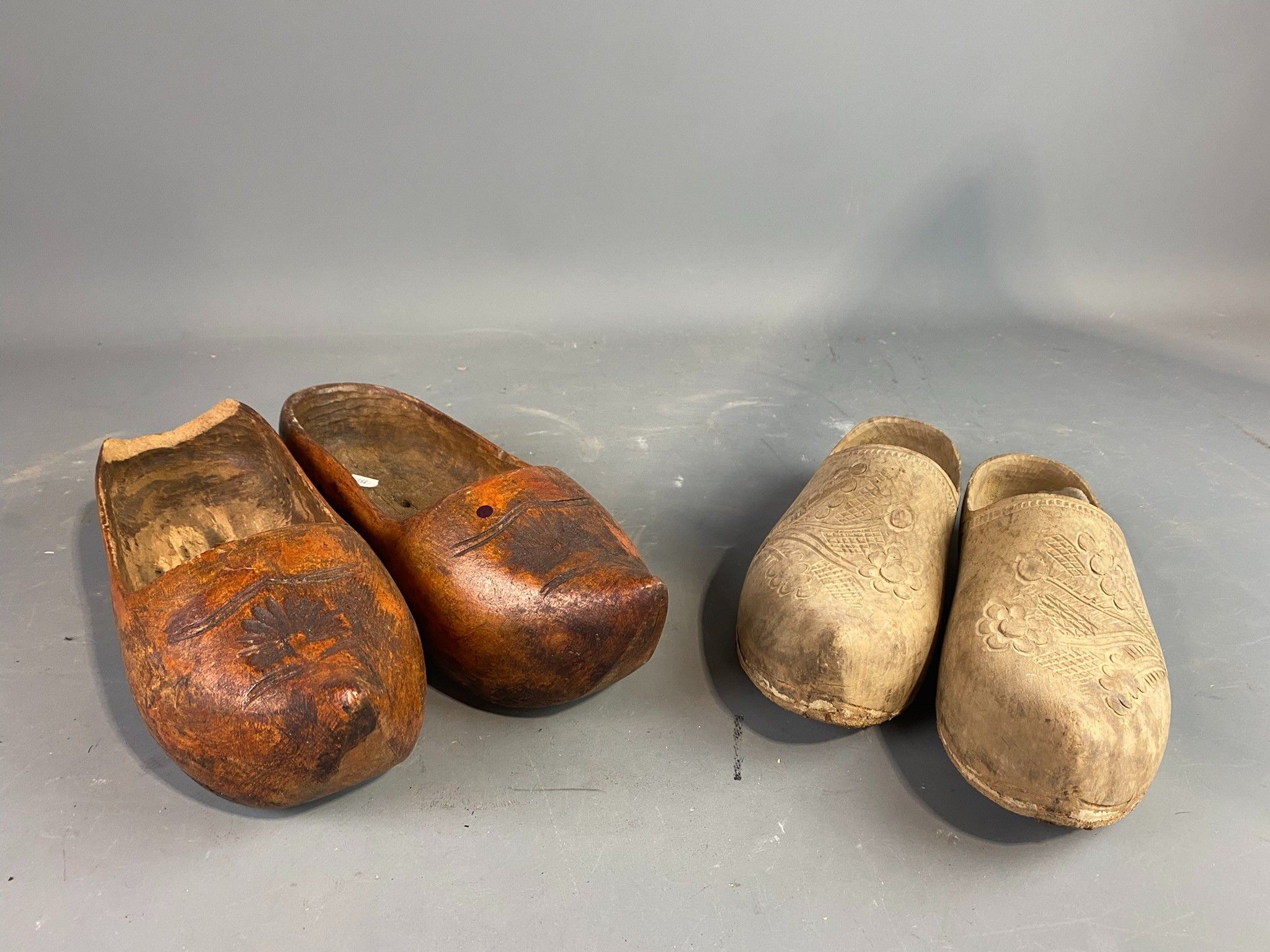 Two pairs of wooden clogs with carved flowers. The heel of one is damaged.