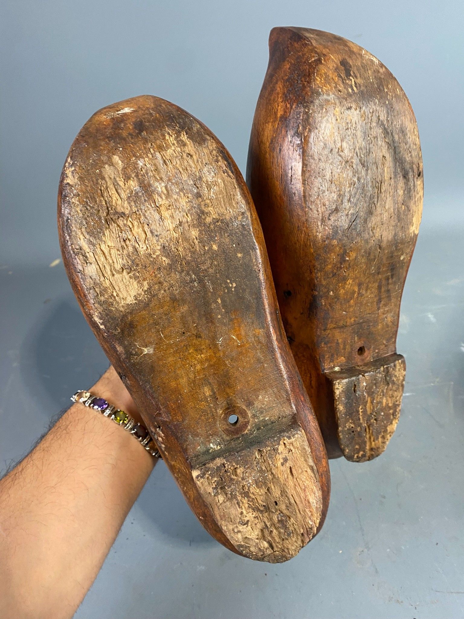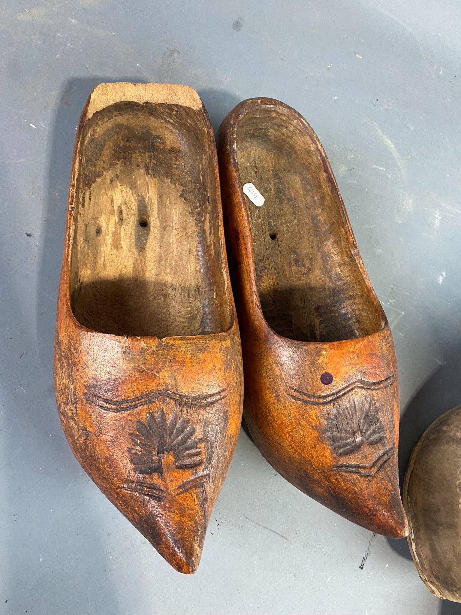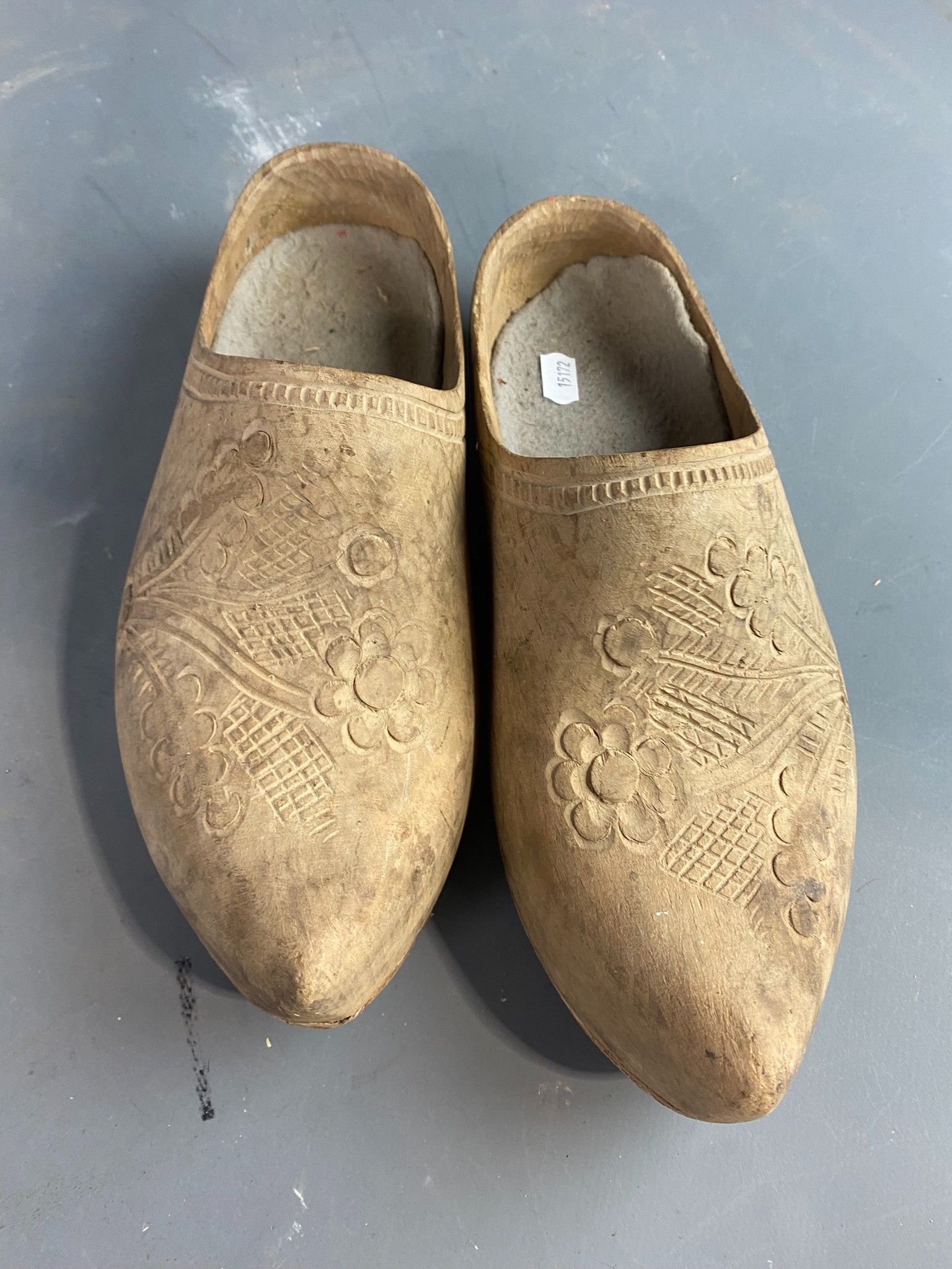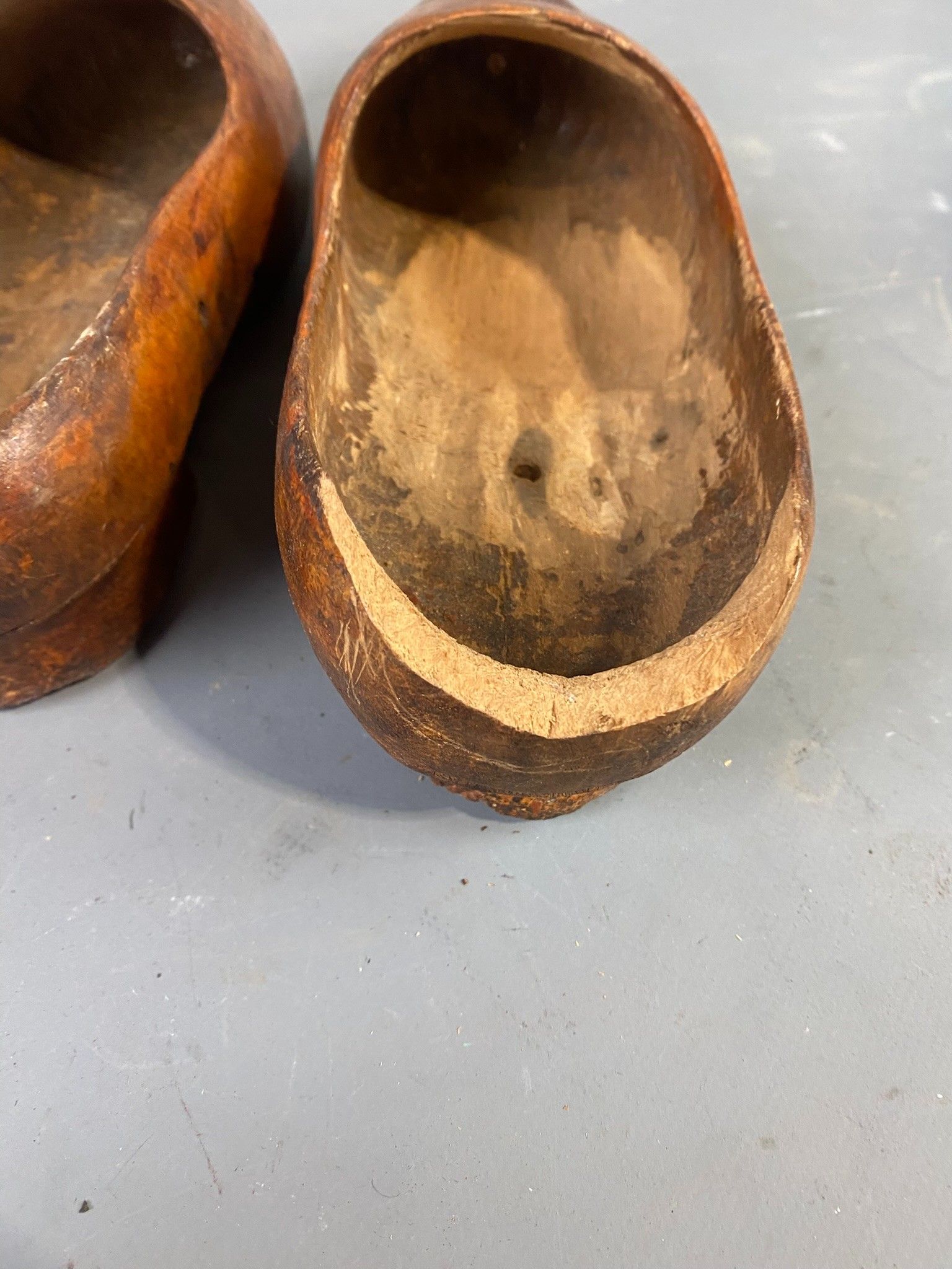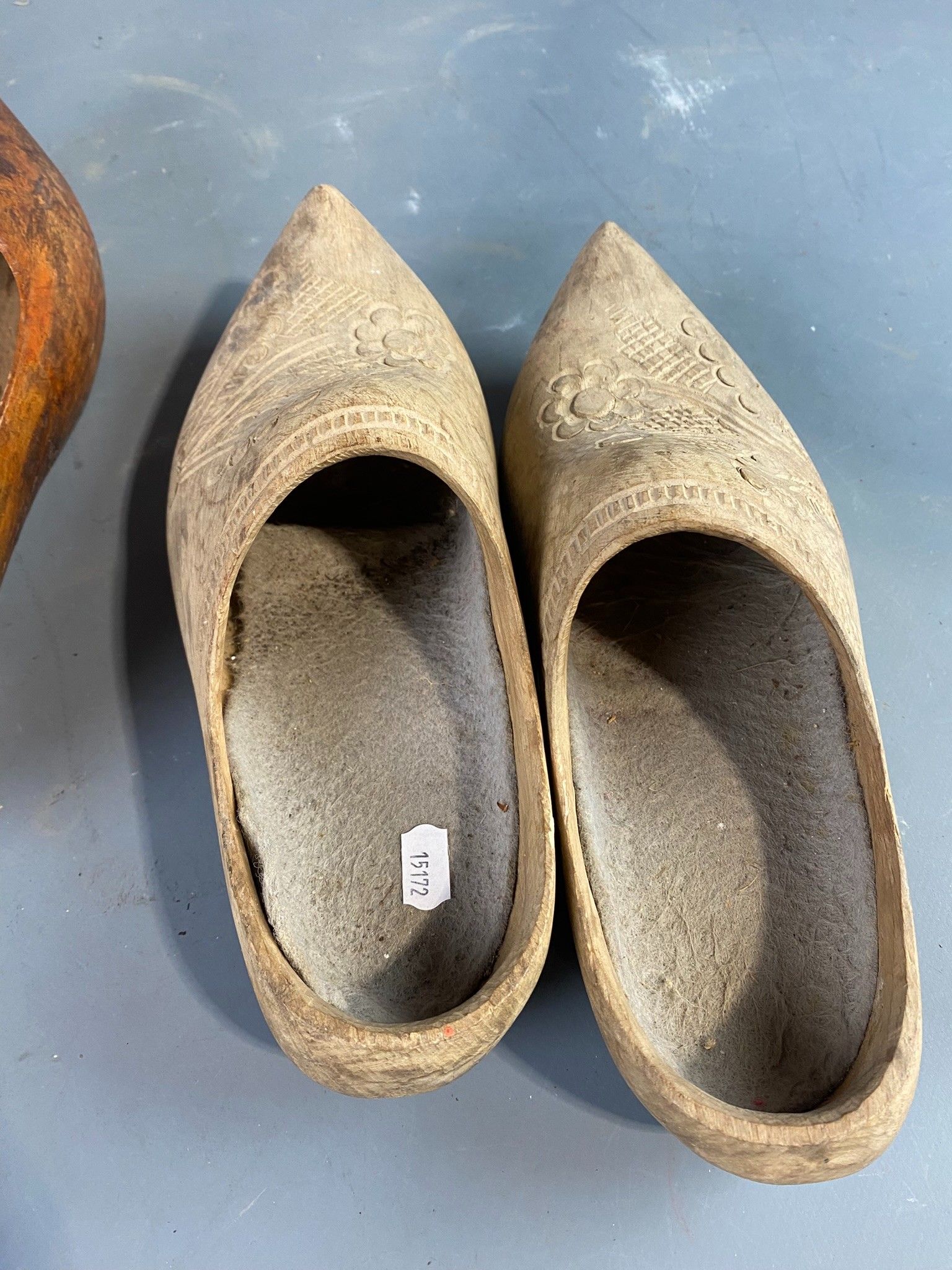 Two pairs of wooden clogs with carved flowers. The heel of one is damaged.