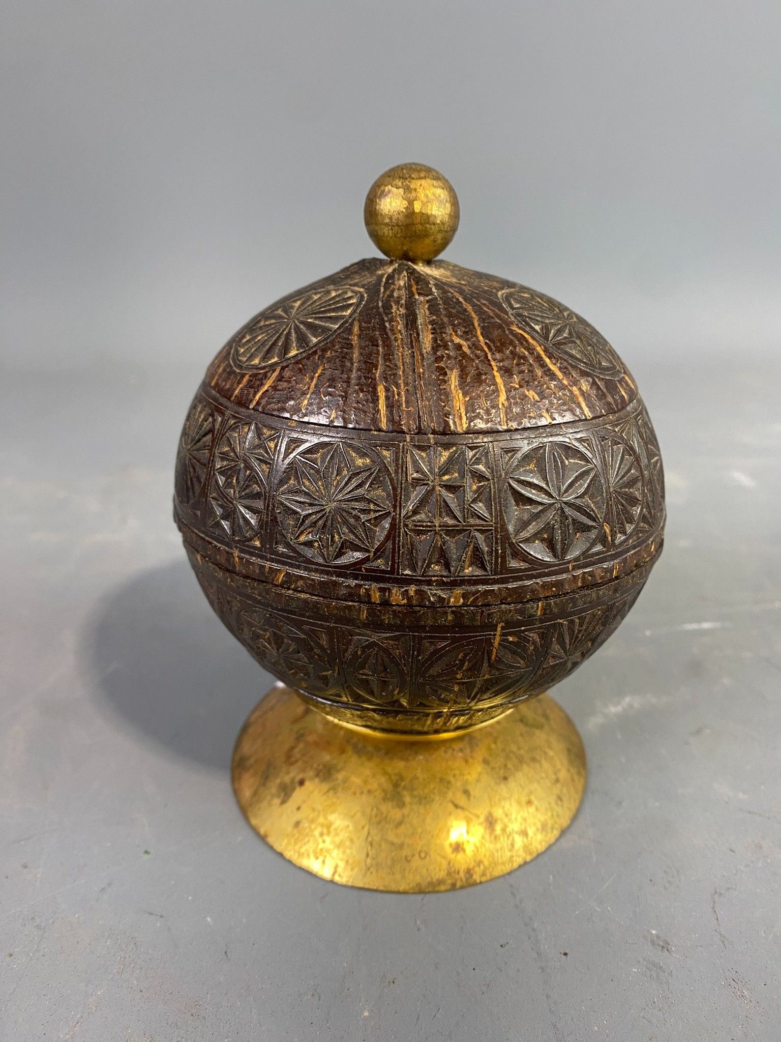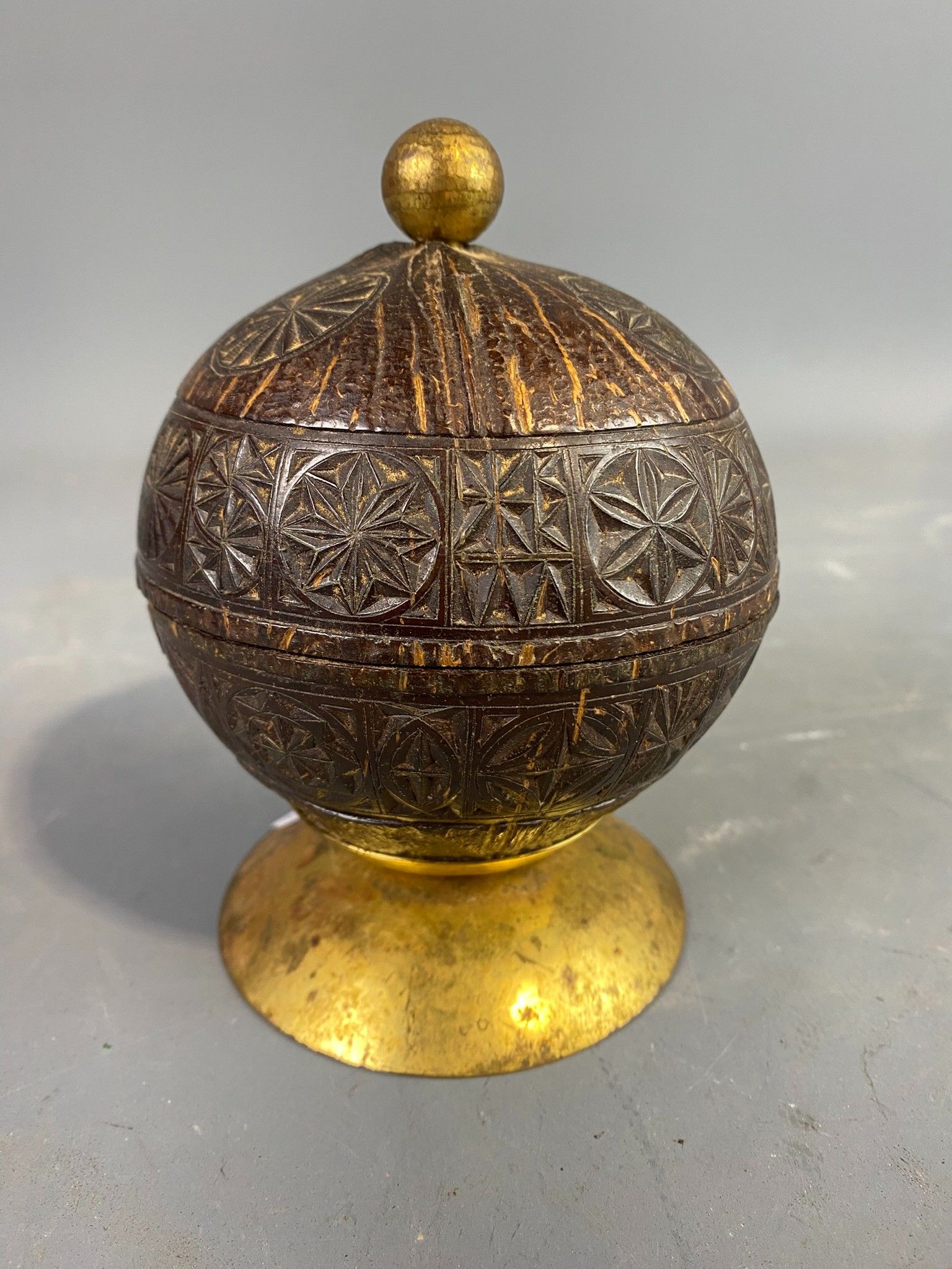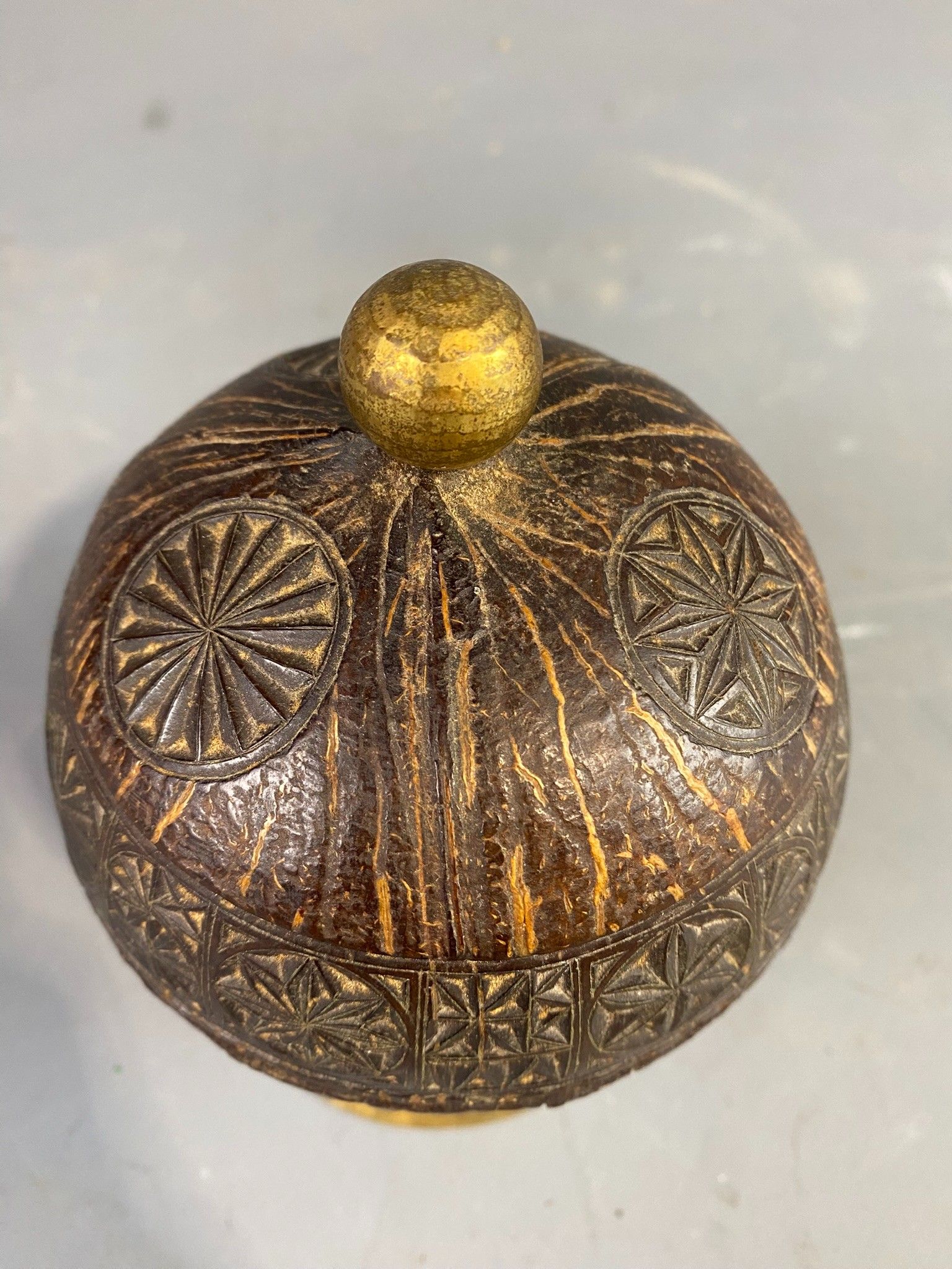 Coconut box with engraved geometric decoration. Brass mounting and handle. Height: 15 cm. An accident to the body