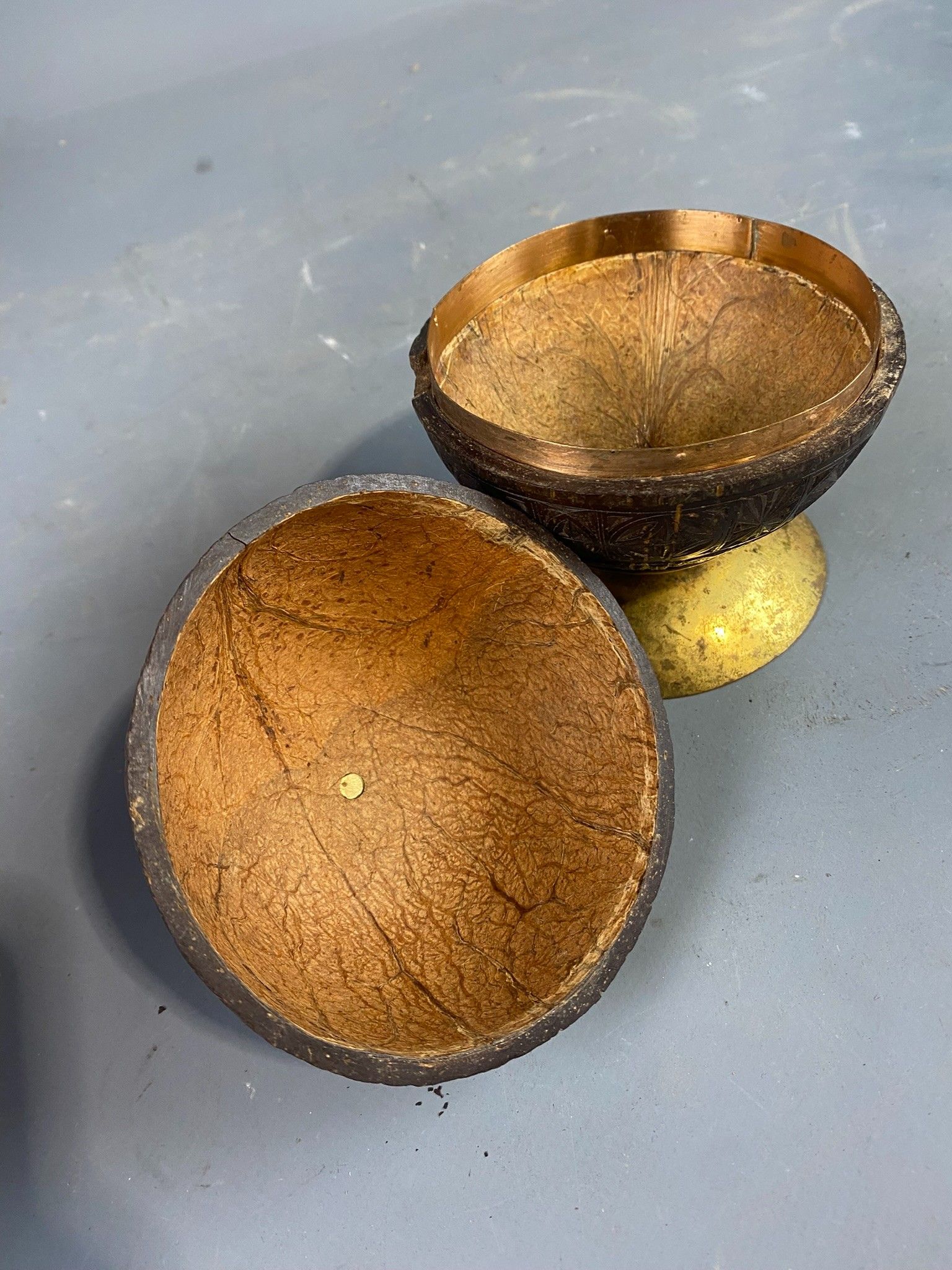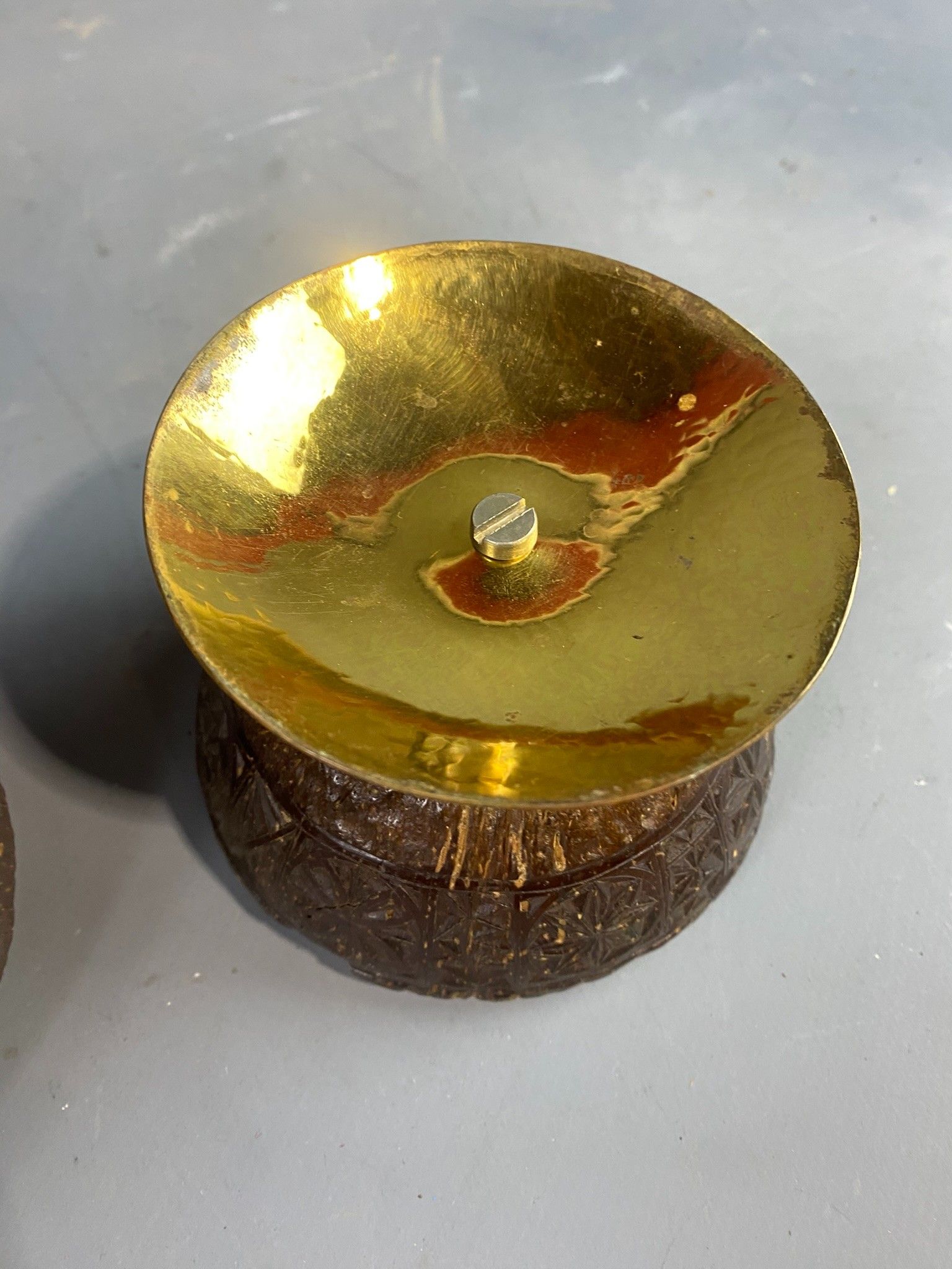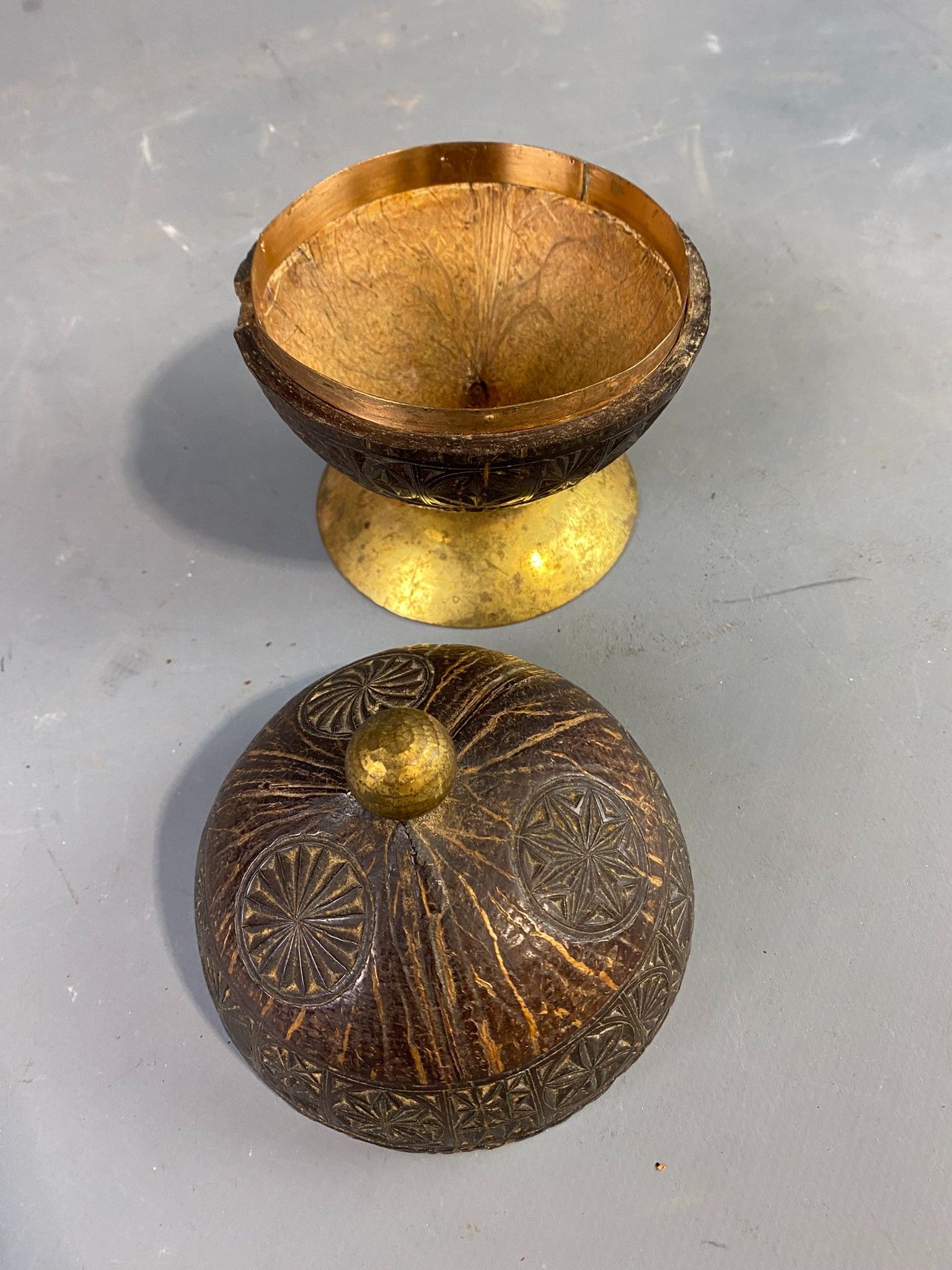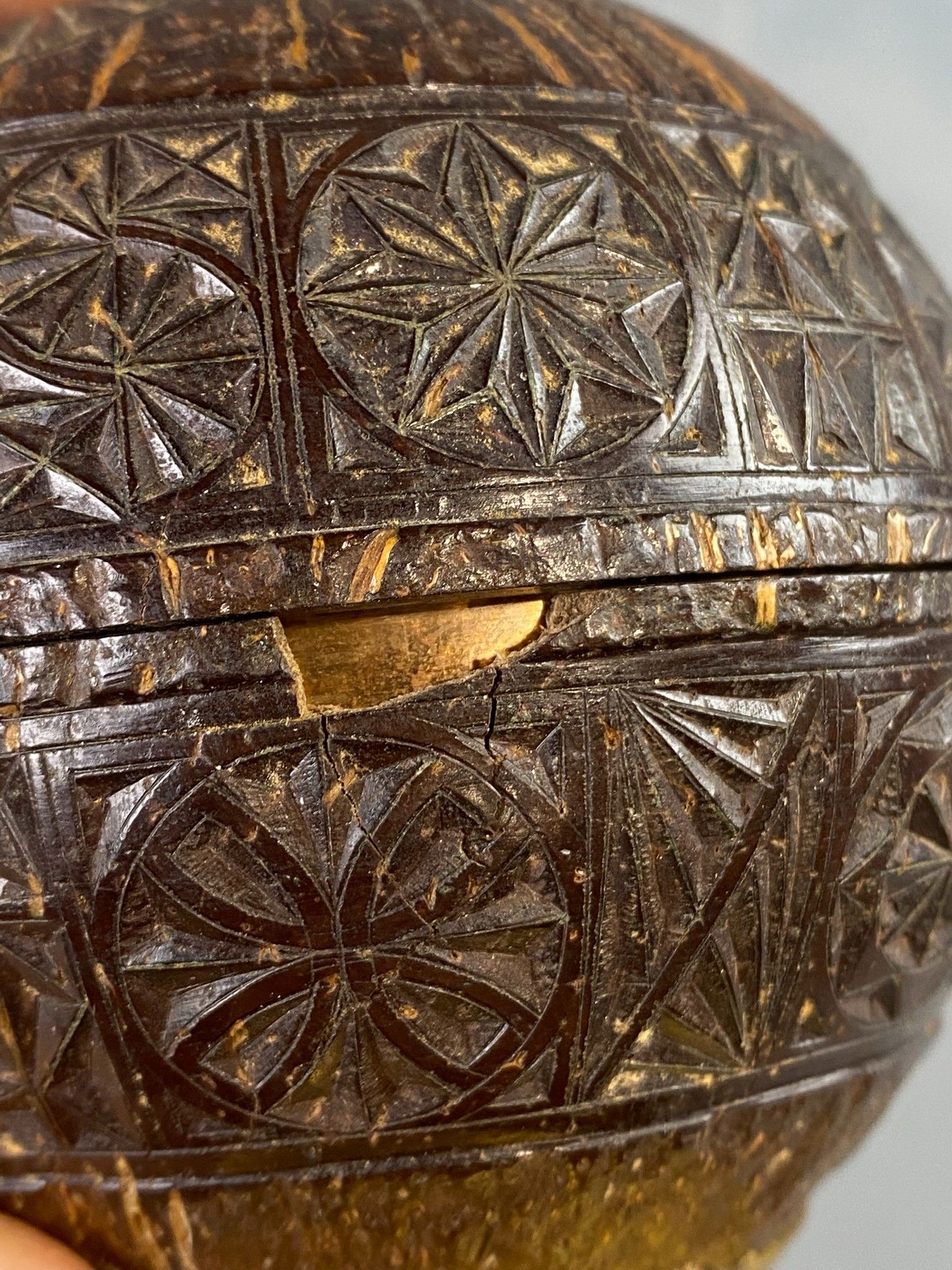 Coconut box with engraved geometric decoration. Brass mounting and handle. Height: 15 cm. An accident to the body