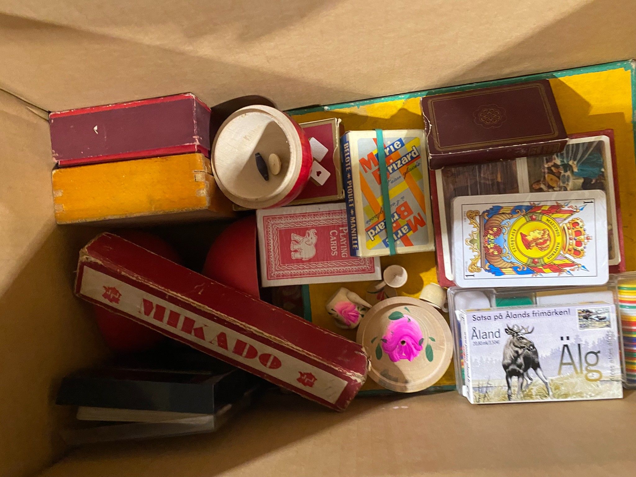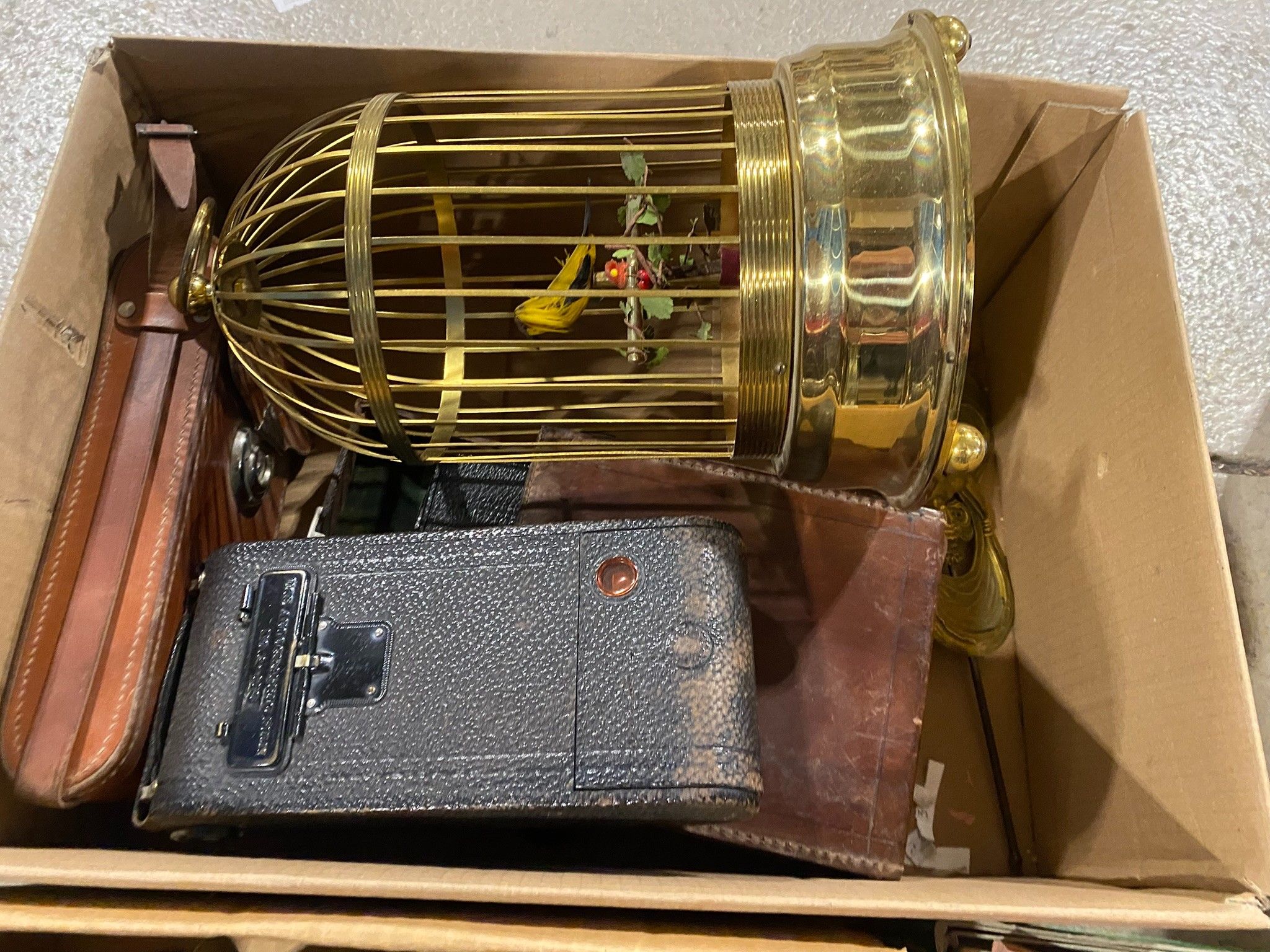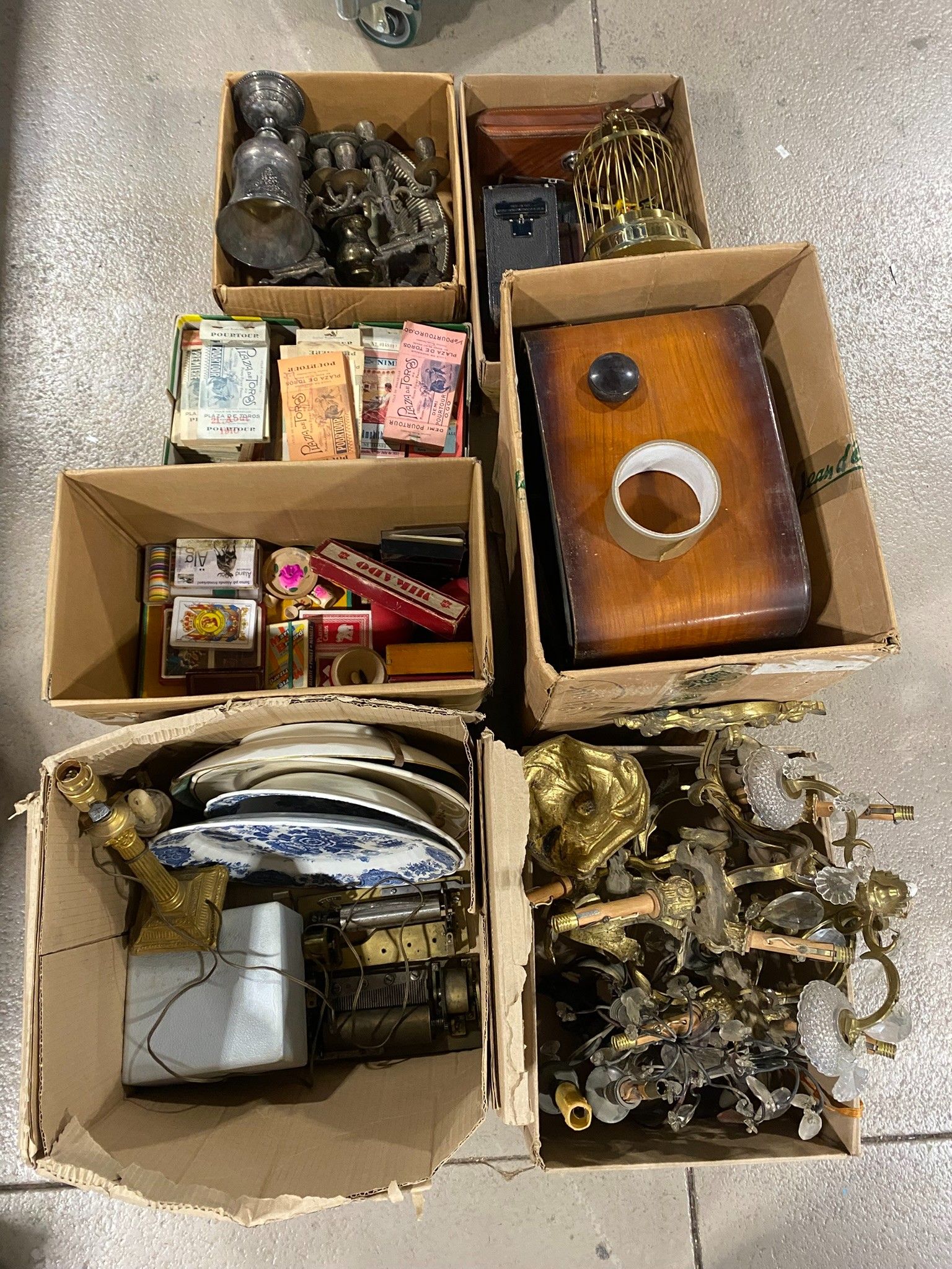 A lot of flat furnishings contained in seven boxes, including framed pieces, engravings in pockets, bronze furnishings including light fittings, cameras, playing cards, a radio...
