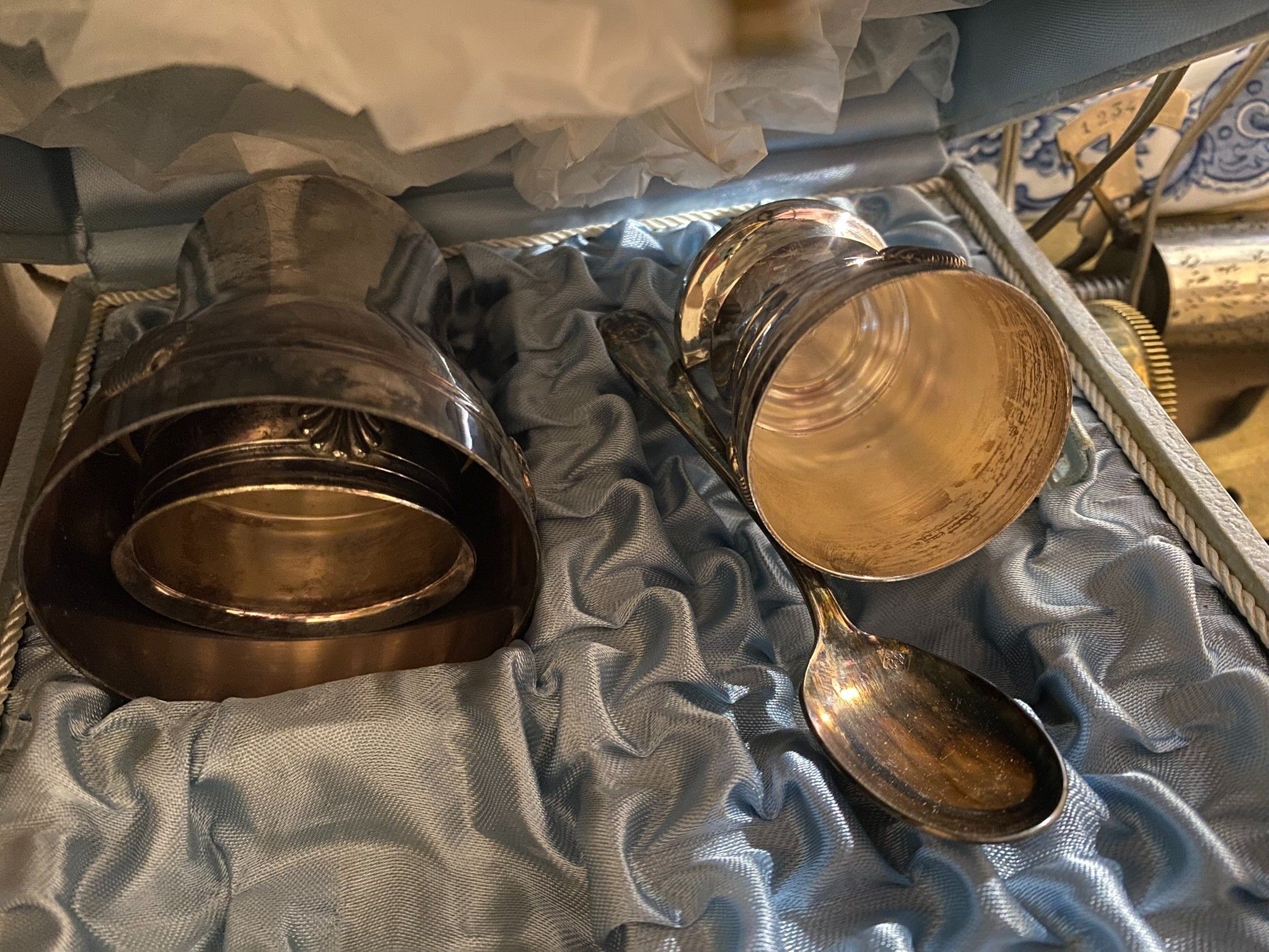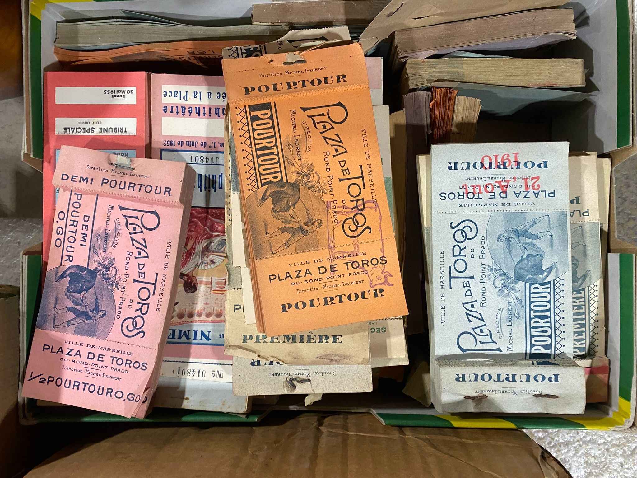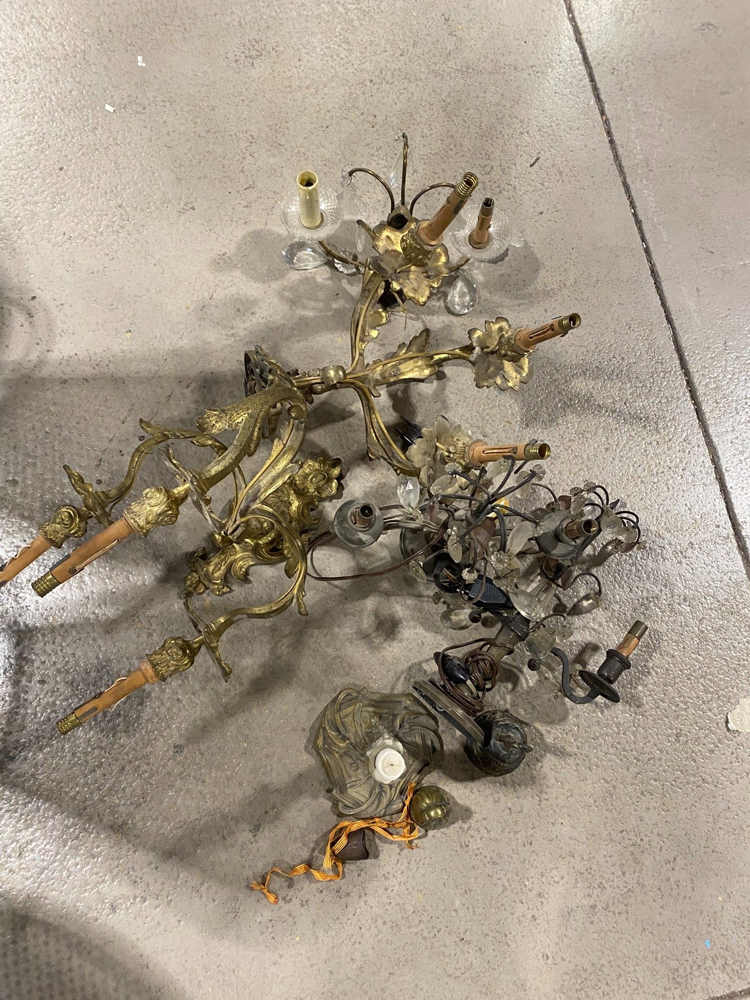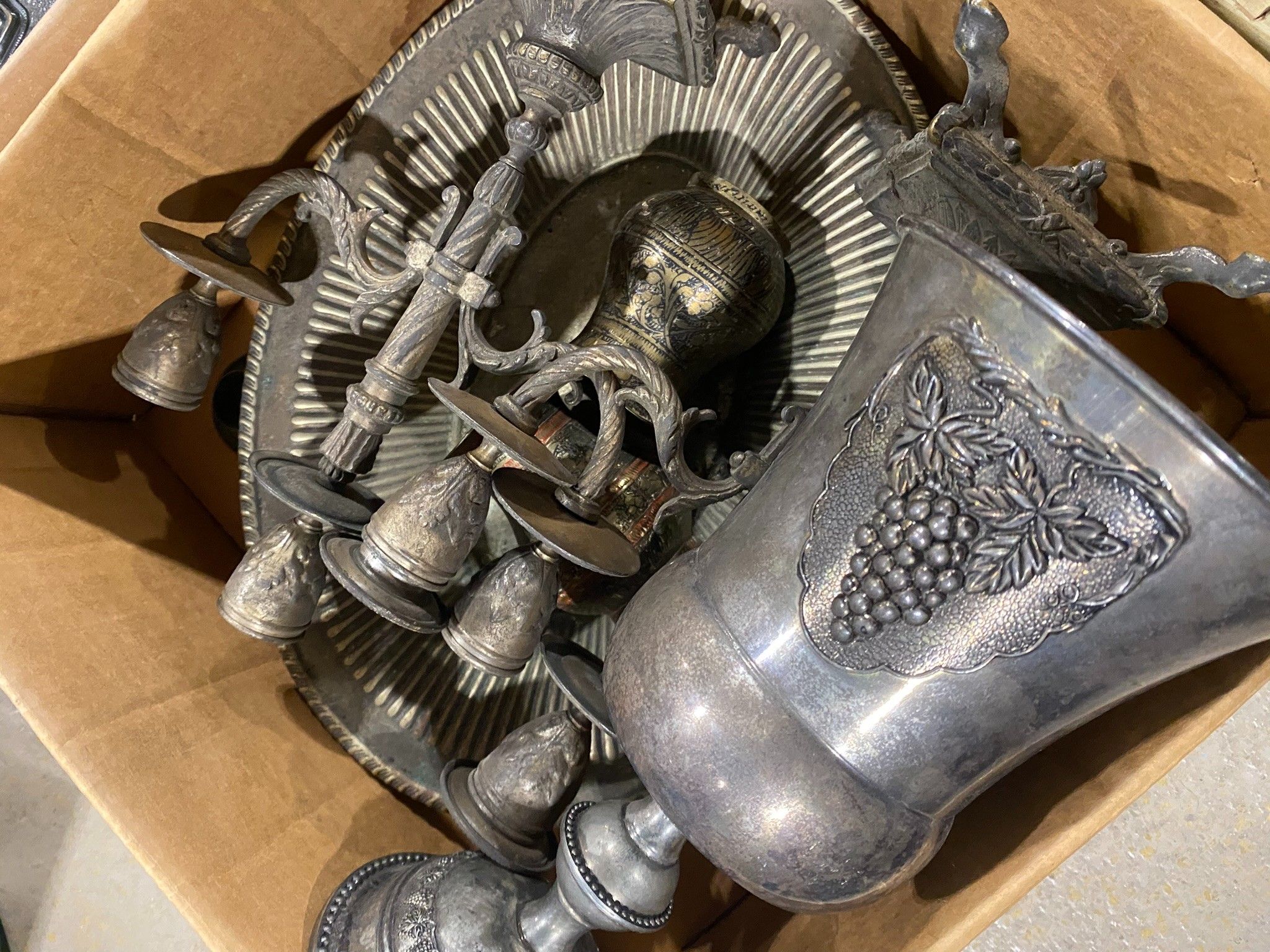 A lot of flat furnishings contained in seven boxes, including framed pieces, engravings in pockets, bronze furnishings including light fittings, cameras, playing cards, a radio...