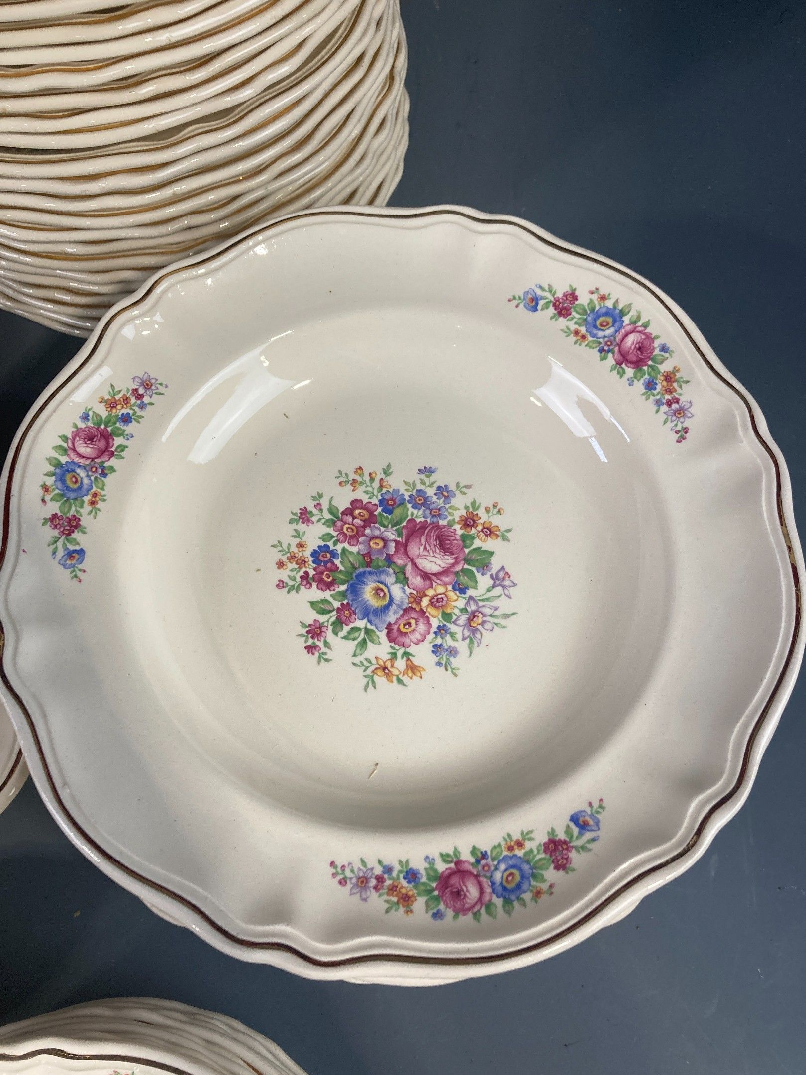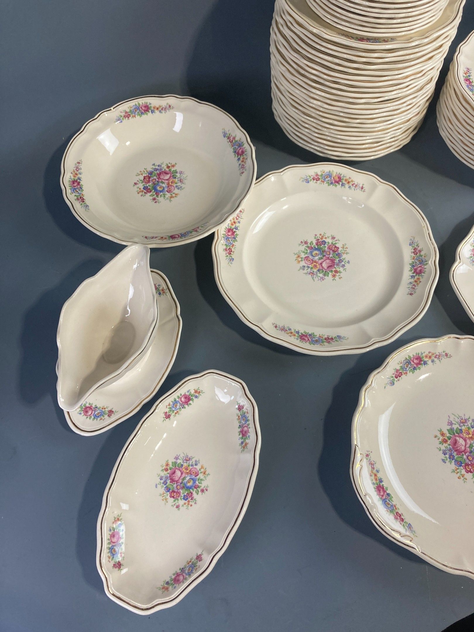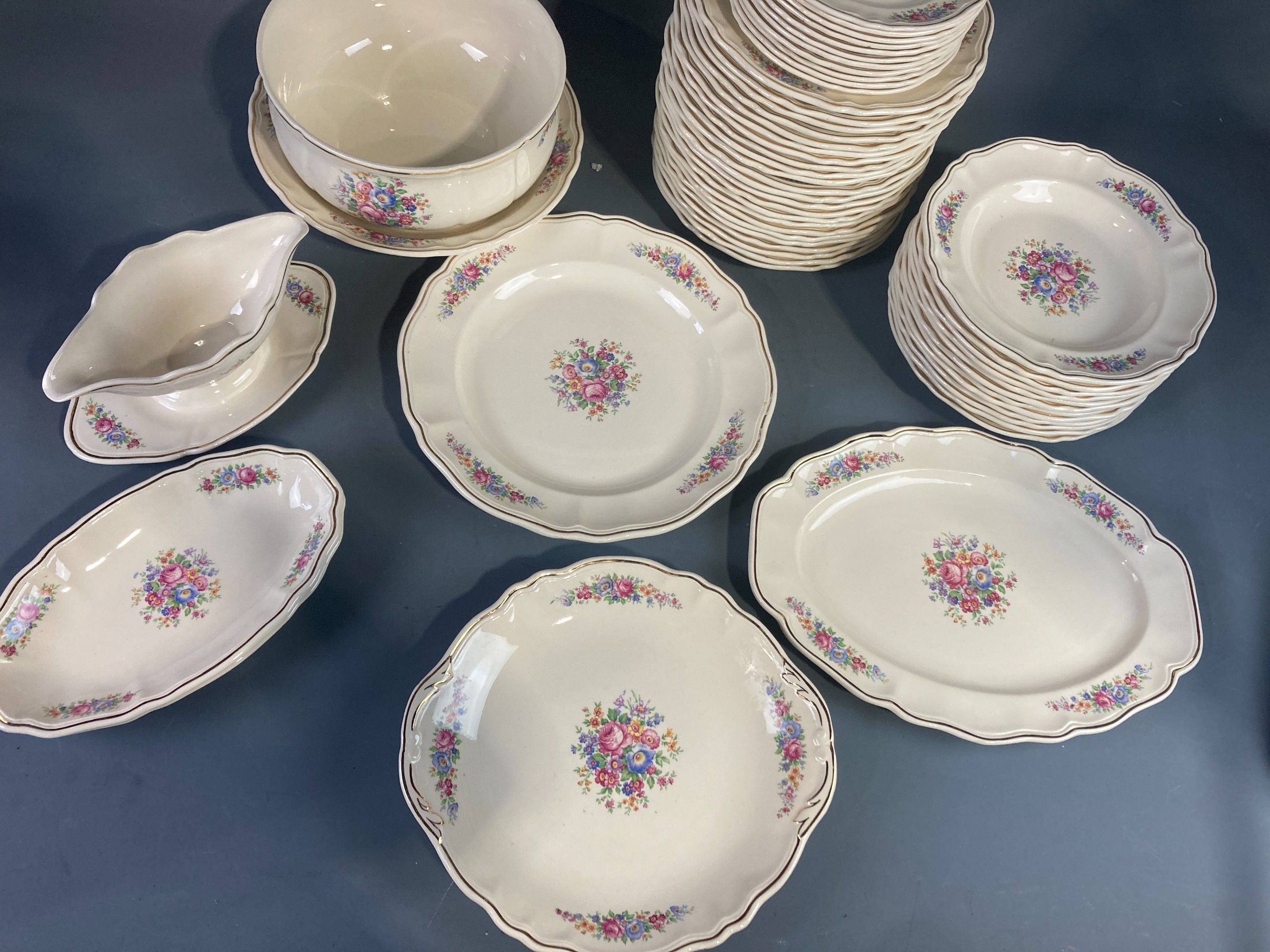 A BADONVILLER demi-porcelain dinner service with printed floral decoration and gilded fillet, comprising twenty-three plates, twelve soup plates, eleven dessert plates, a sauceboat and its stand, a salad bowl, a circular shallow dish, a circular dish, an oblong dish and two ramekins. Slight wear and chips