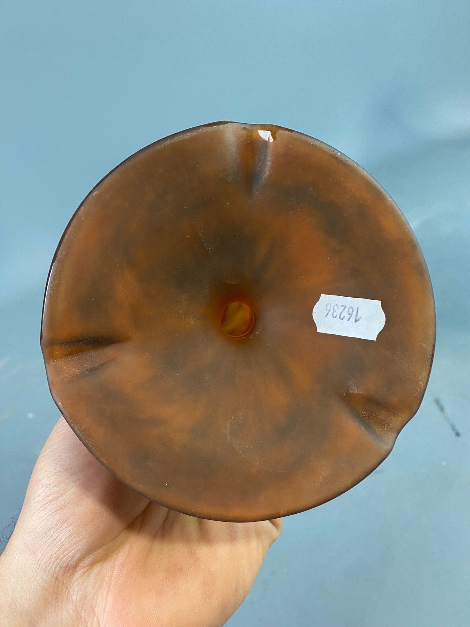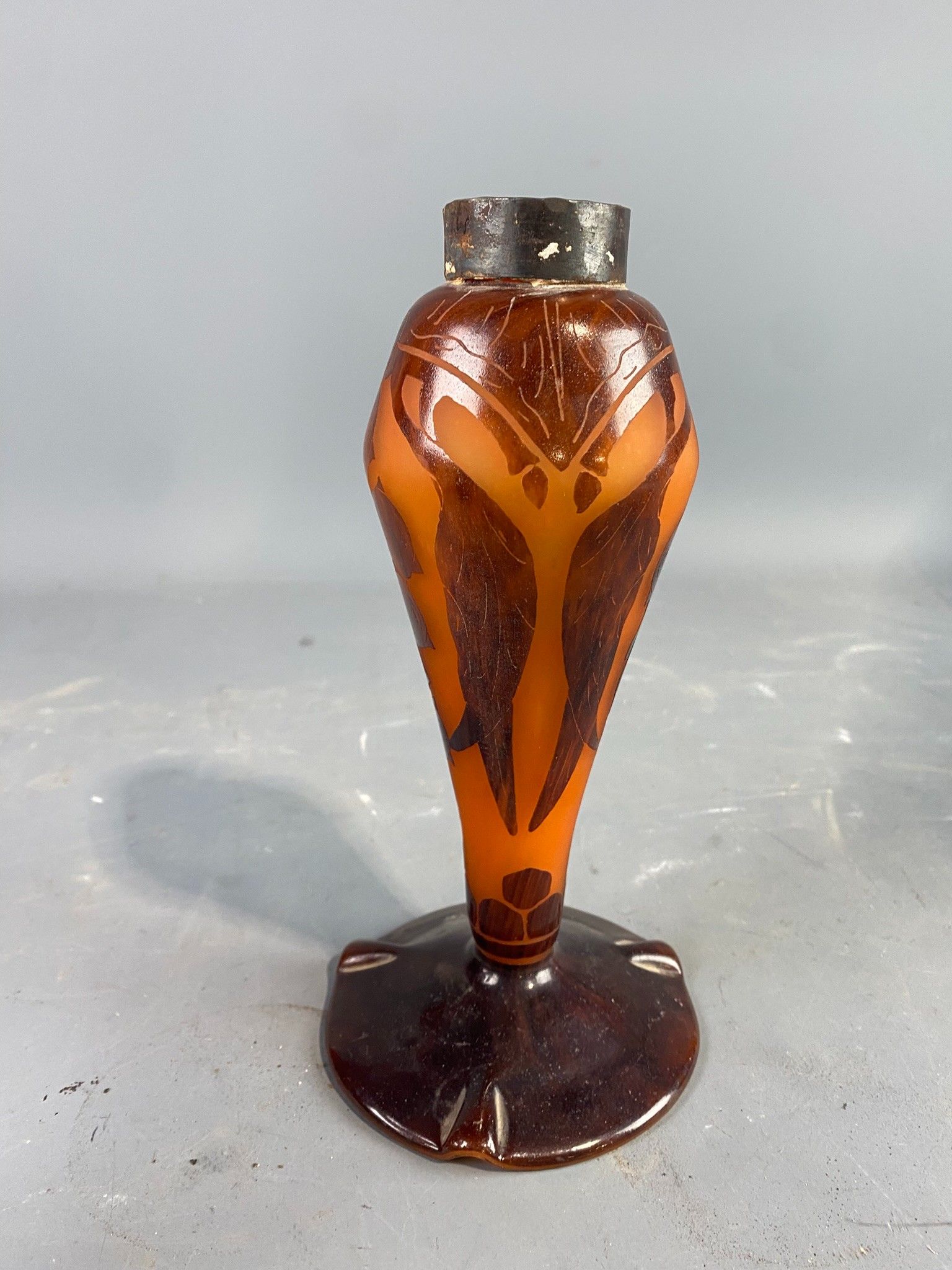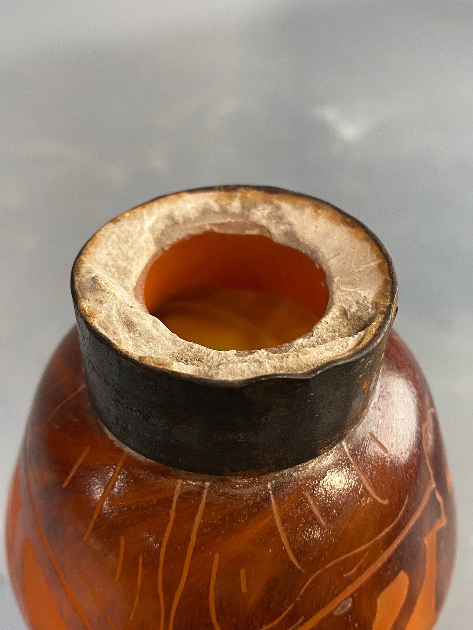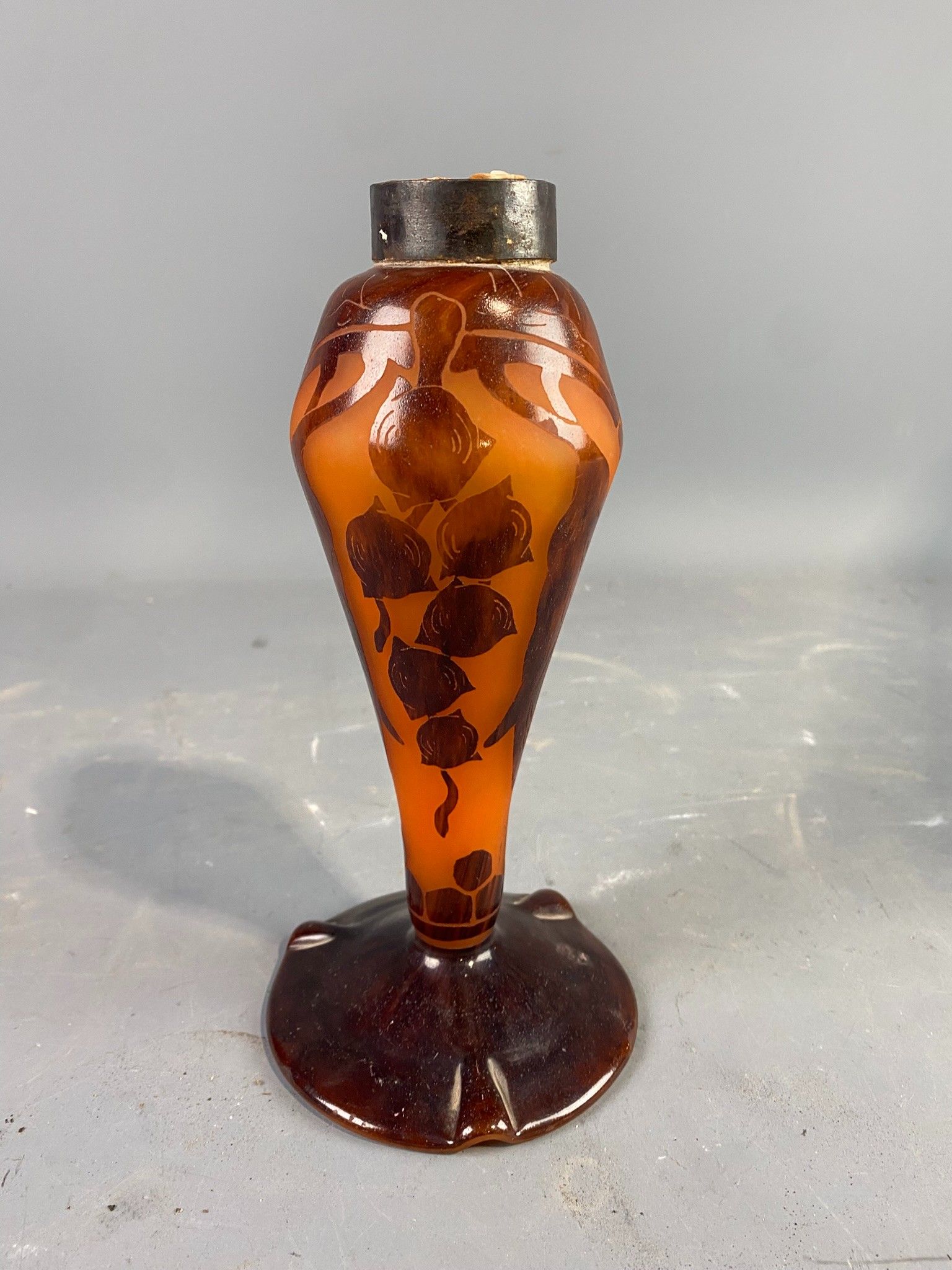 Attributed to CHARDER or Le Verre Français: Tapering lamp base on a flared glass base decorated with two layers of acid-etched orange/brown berry falls. Height : 23 cm. Lamp cover incomplete