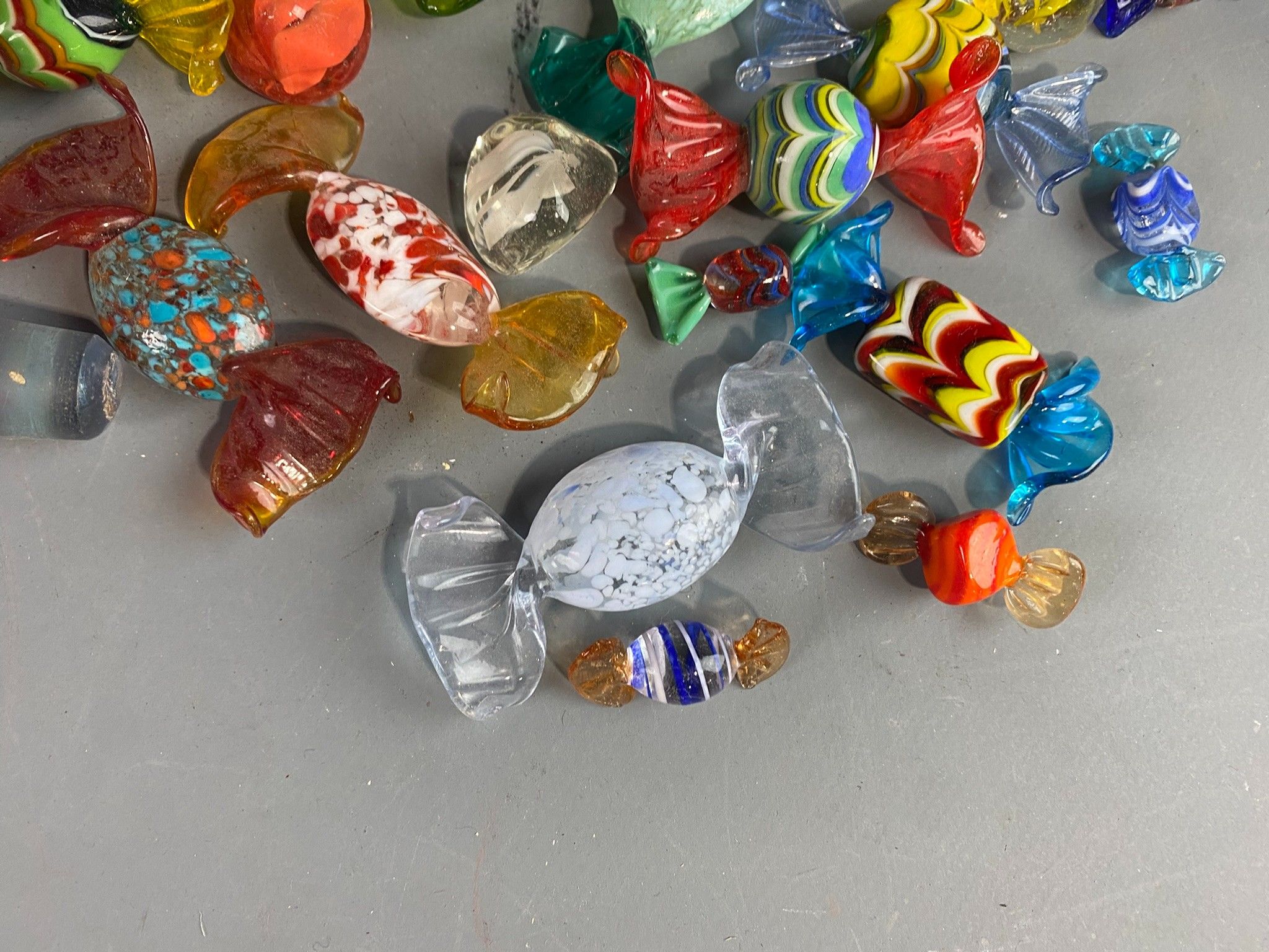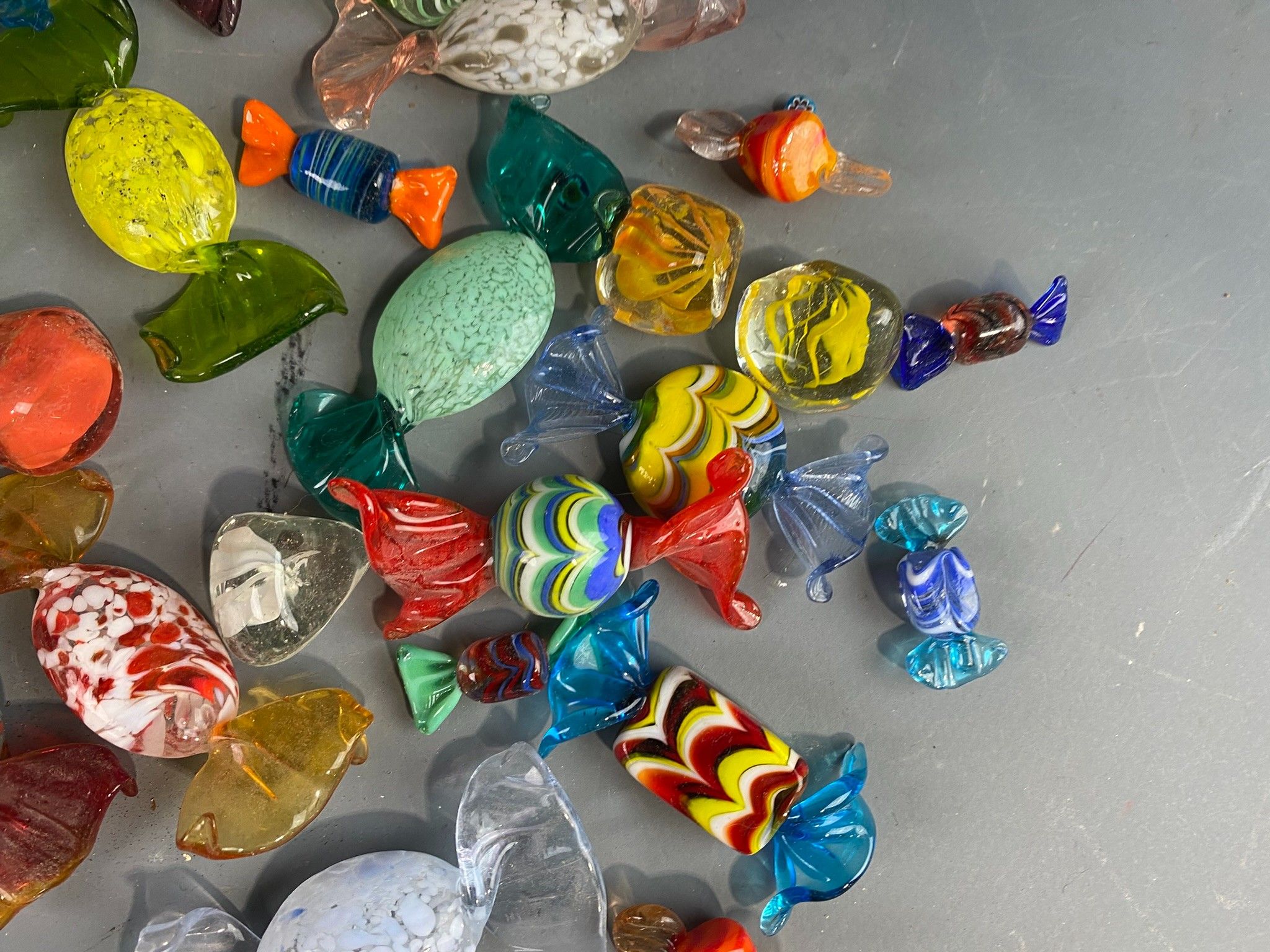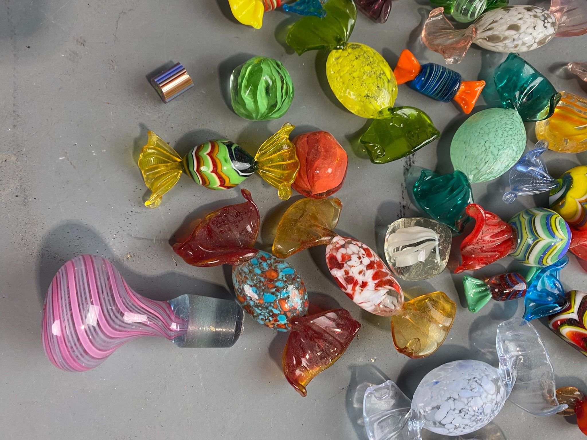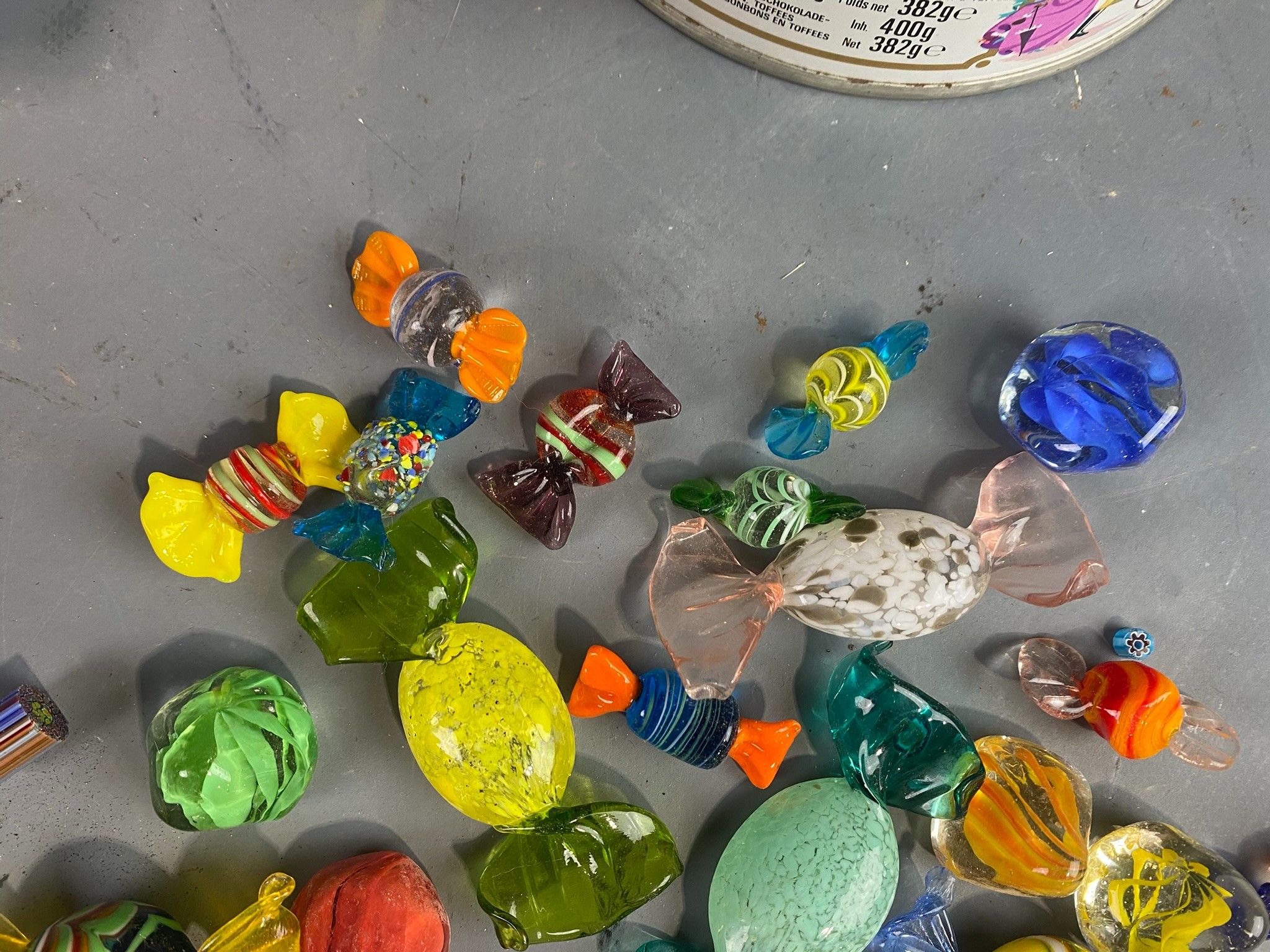 Journey to Murano: An assortment of tutti frutti sweets in fluted, spiral and embellished glass contained in a small metal box.
