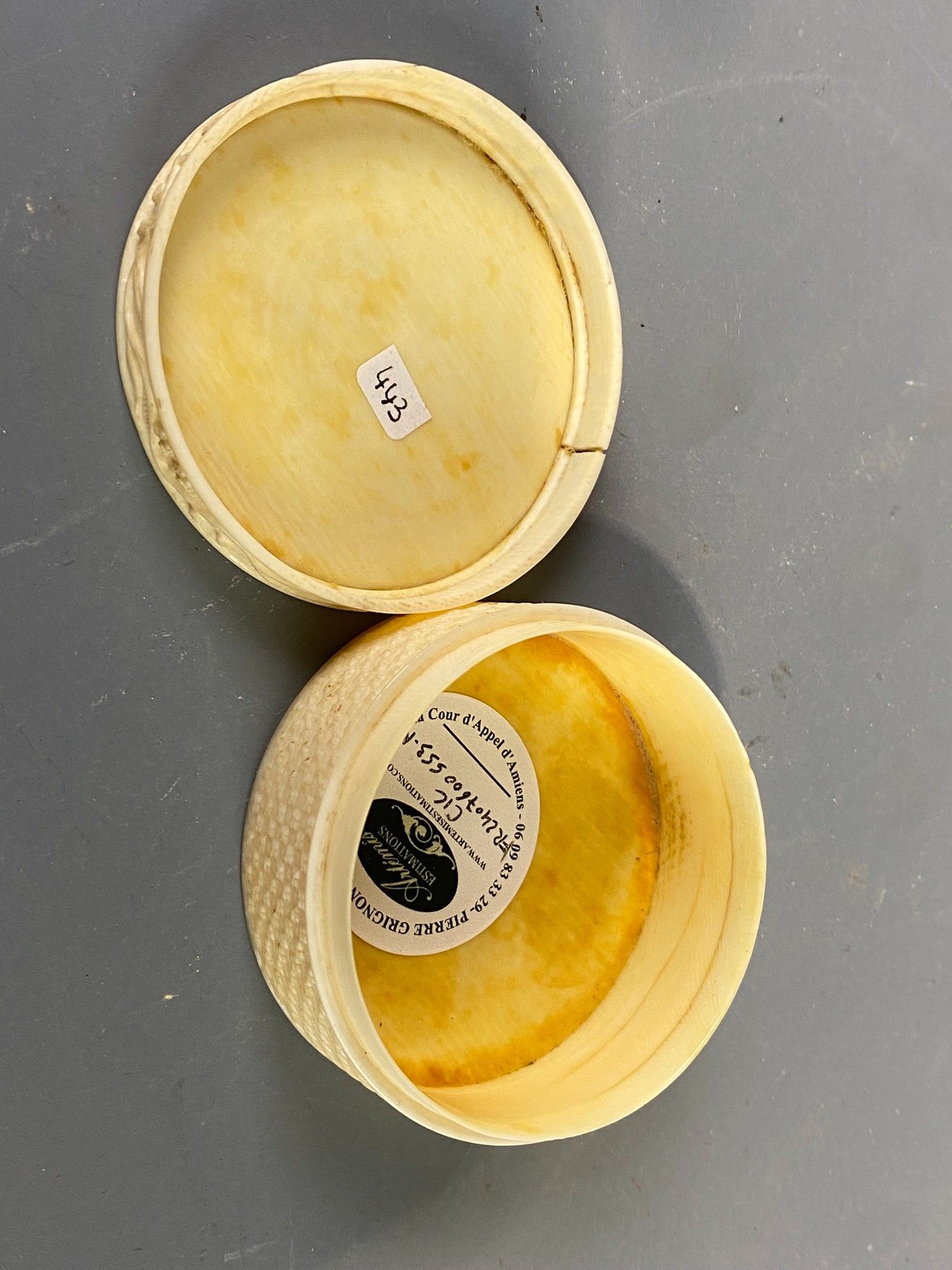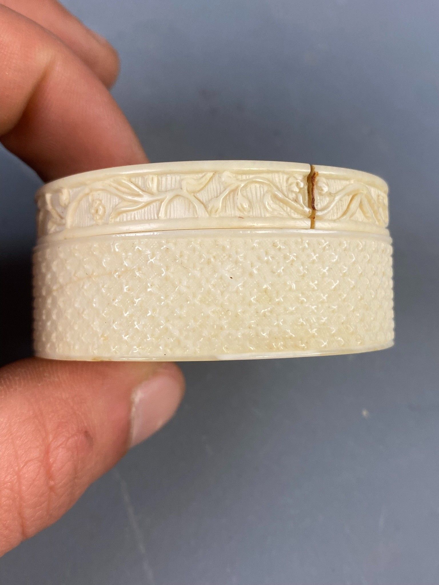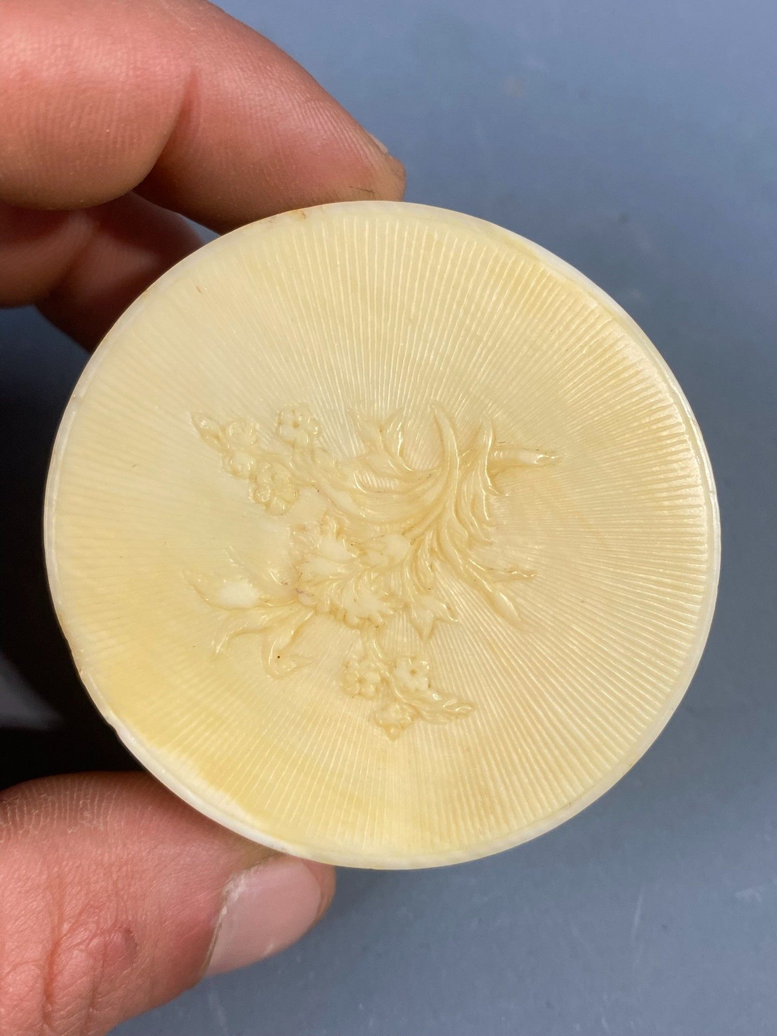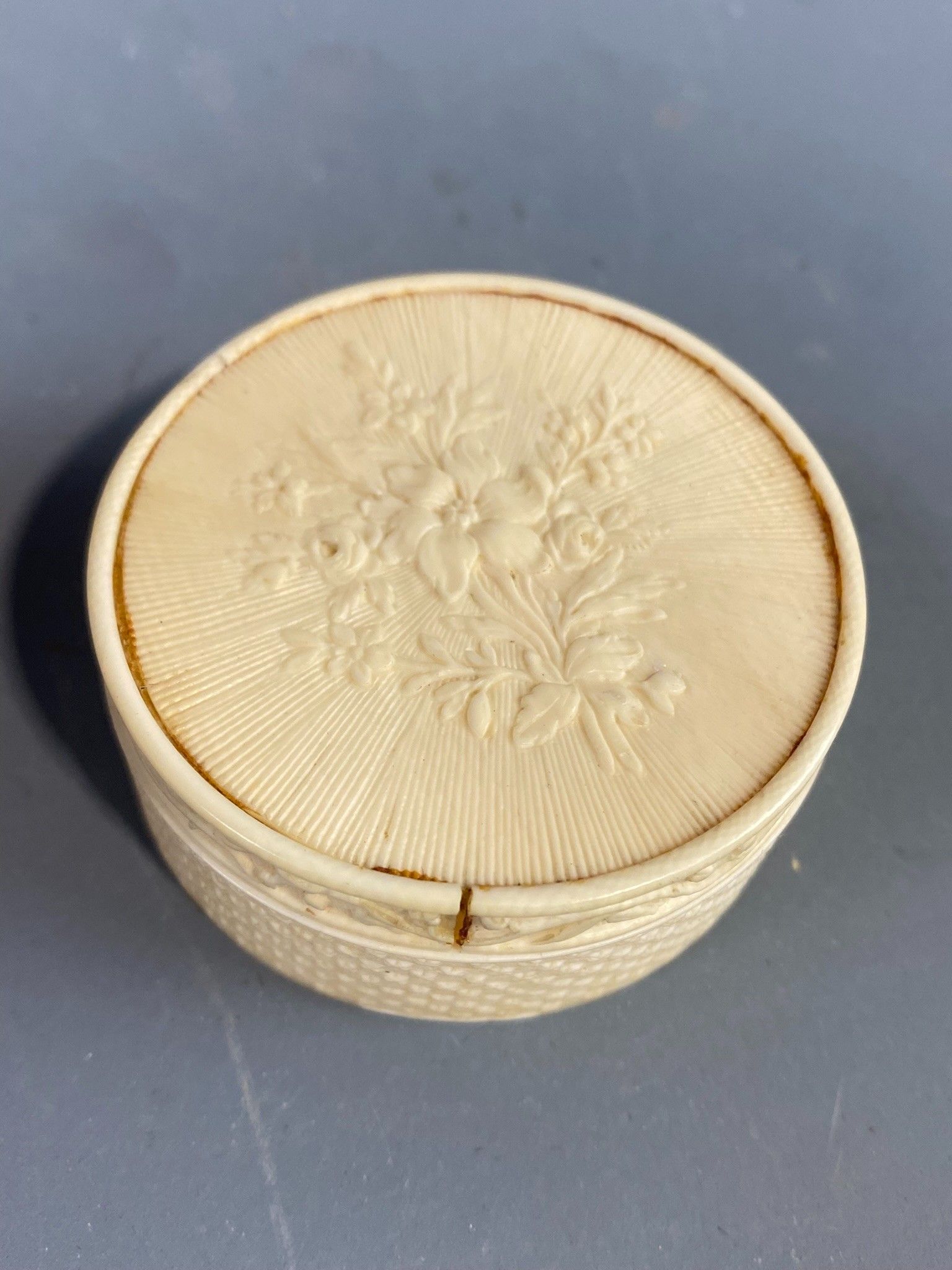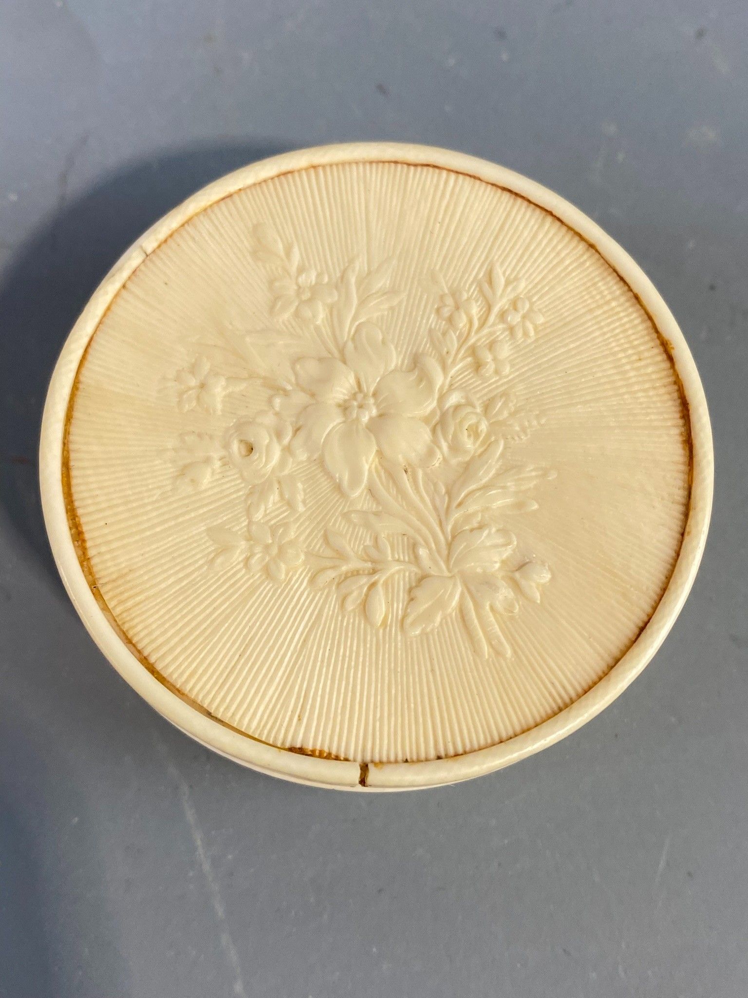 Circular ivory box decorated with a bouquet of flowers on a radiant background on the lid, foliage scrolls and semi flowers on the sides. Made in Dieppe around 1780. Diameter: 5.5 cm, height: 2.5 cm. The lid is unfortunately reglued and there is a crack on one side. Accompanied by its K CITES permit.
