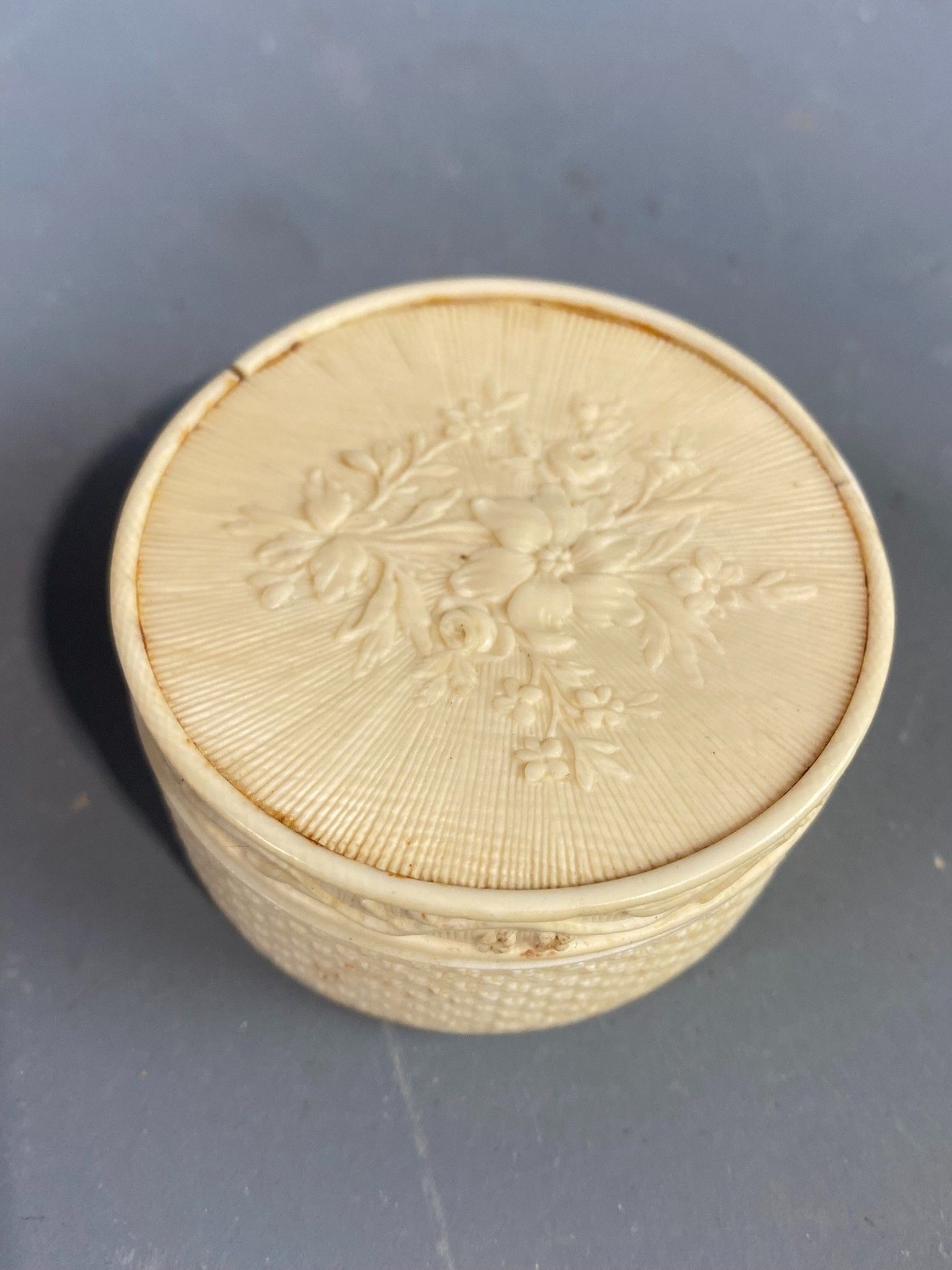 Circular ivory box decorated with a bouquet of flowers on a …