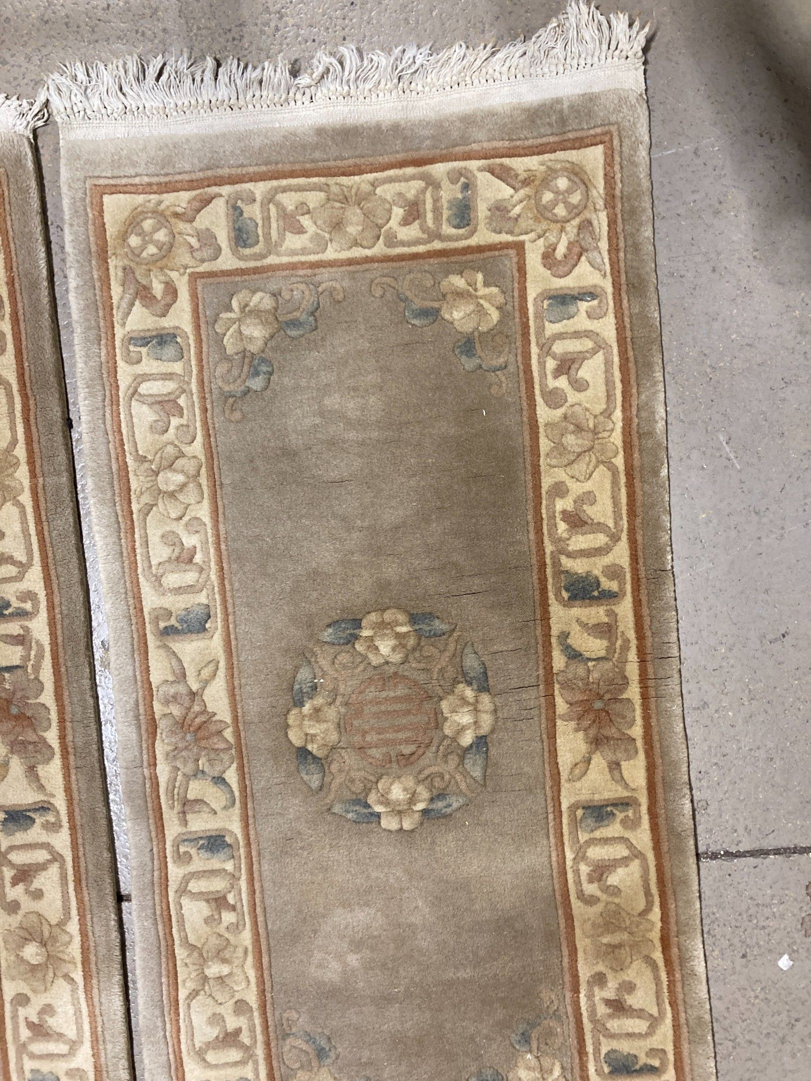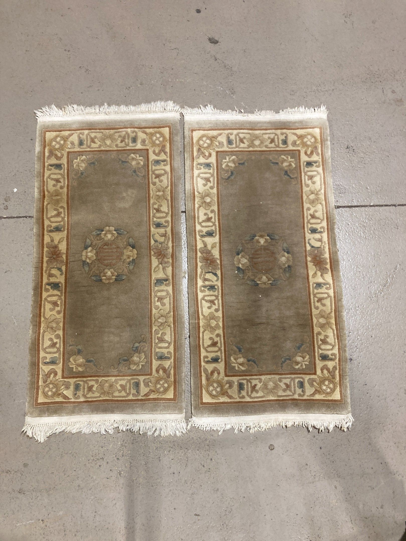Pair of Chinese carpets with a light grey background decorated with a medallion and a wide floral border. 120 x 62 each