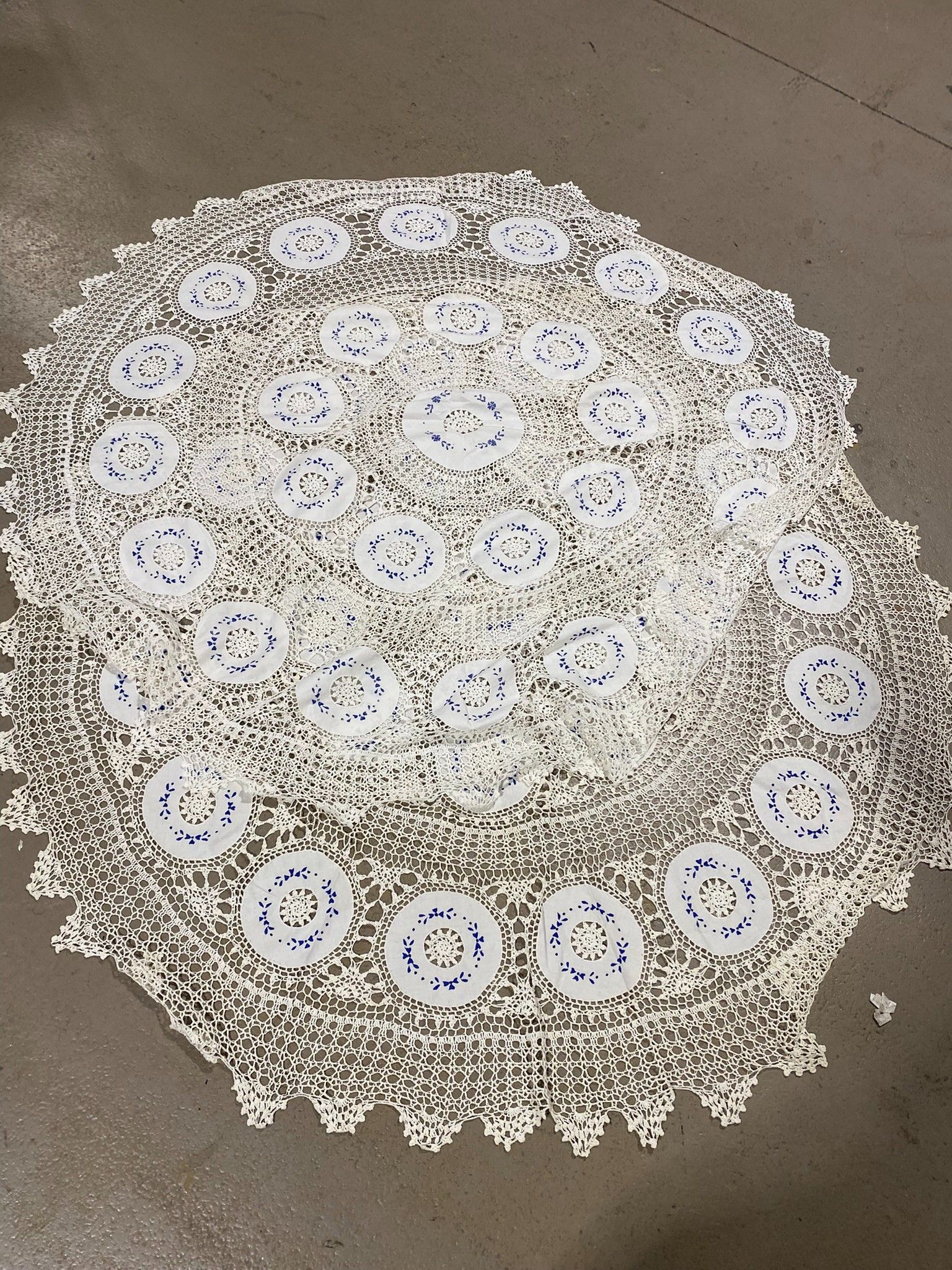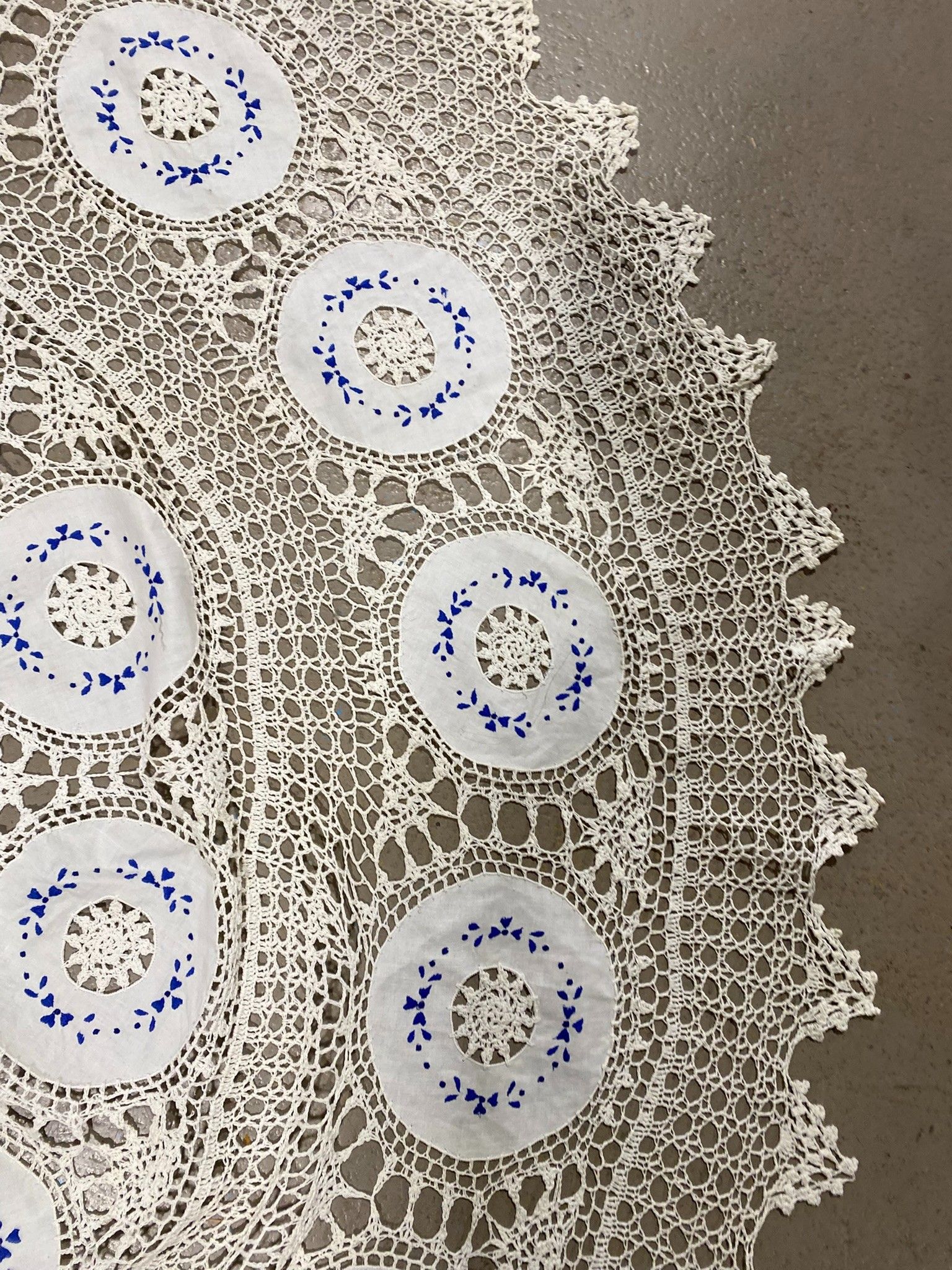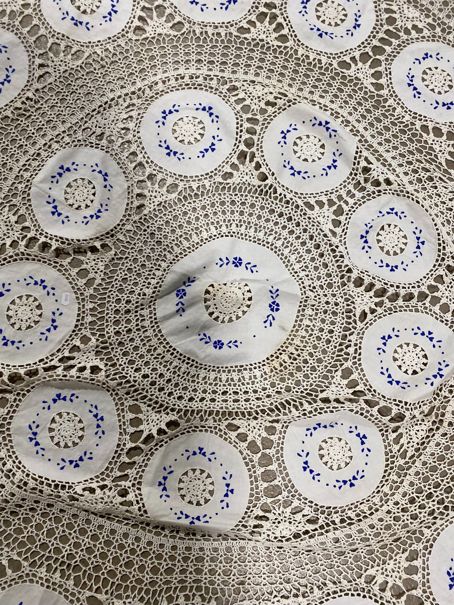 Pair of round tablecloths in cotton or openwork crochet with embroidered section. Diameter: 170 cm