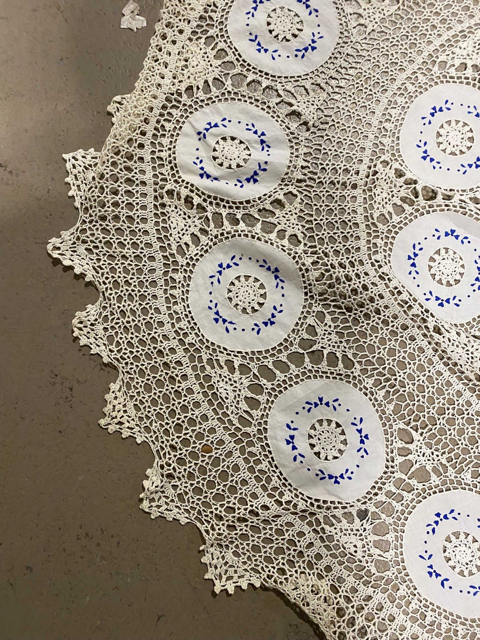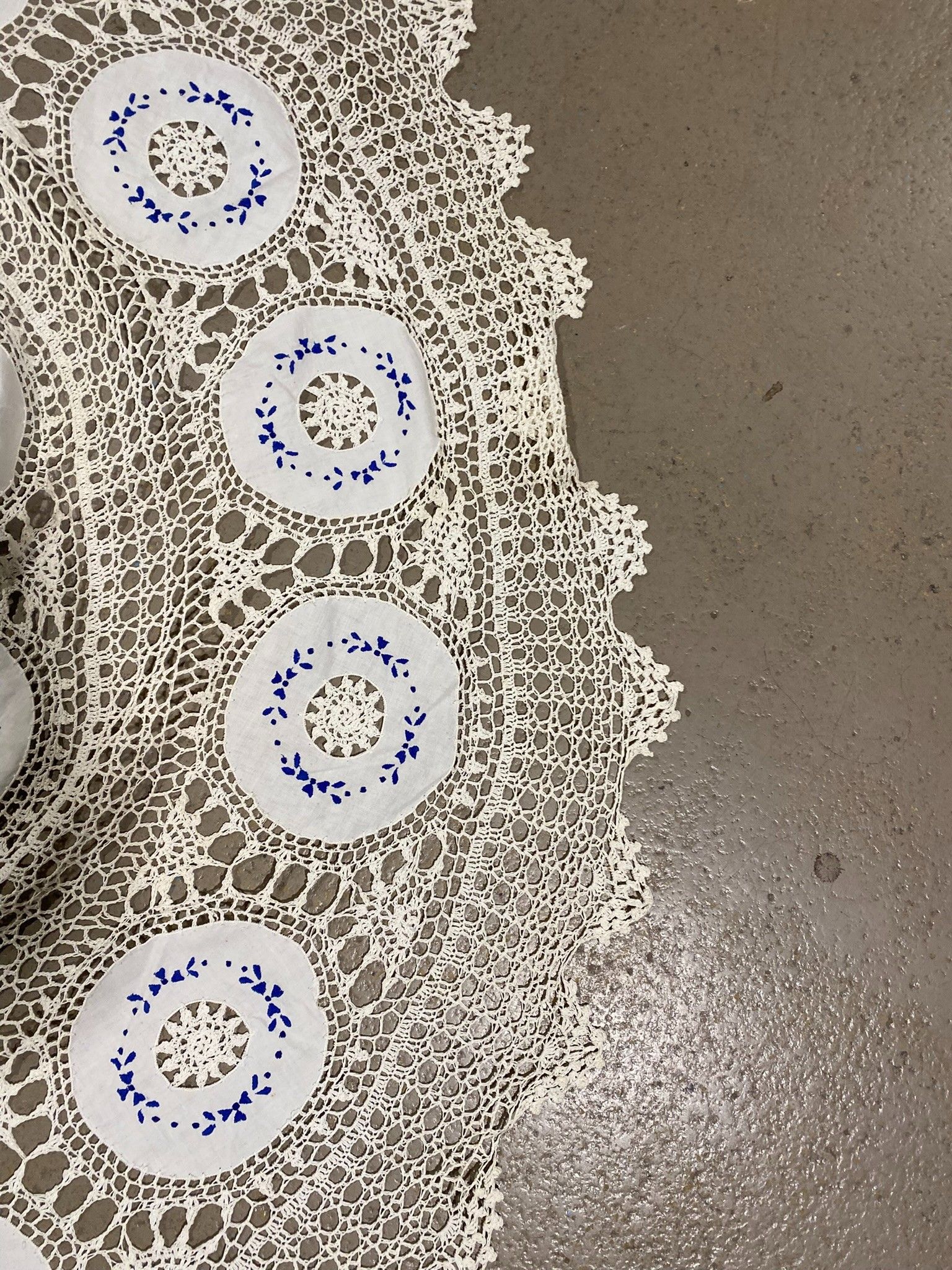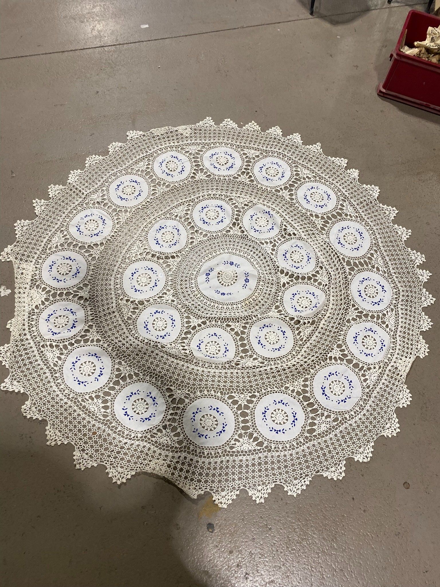 Pair of round tablecloths in cotton or openwork crochet with embroidered section. Diameter: 170 cm