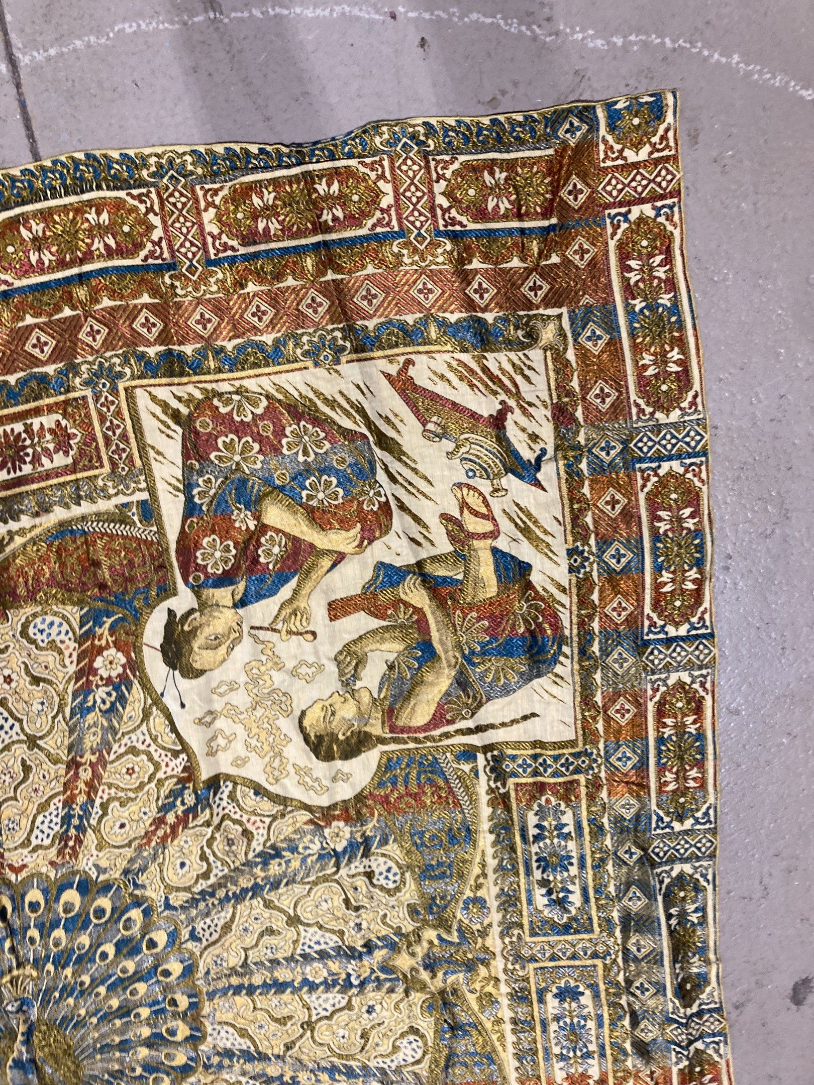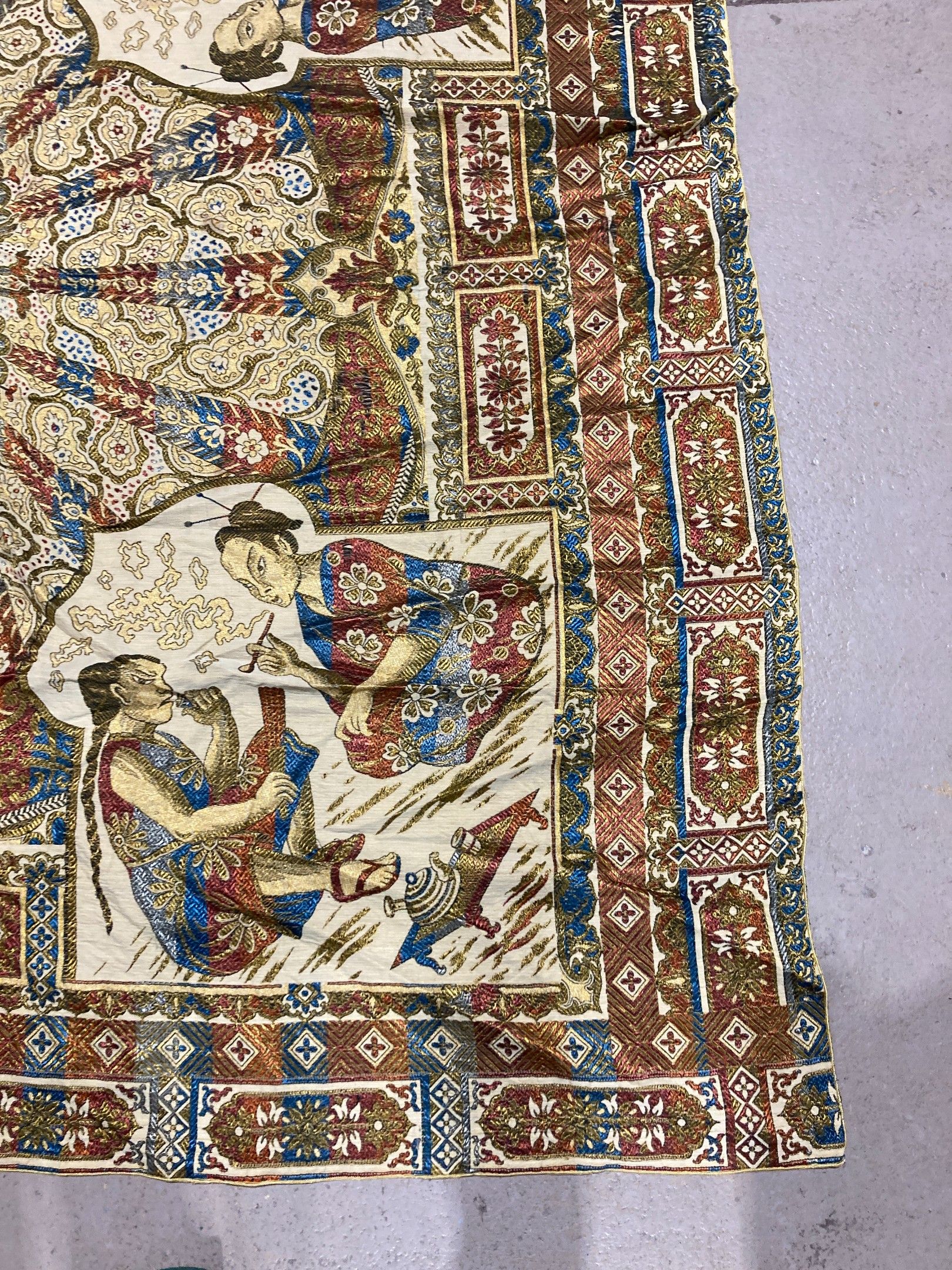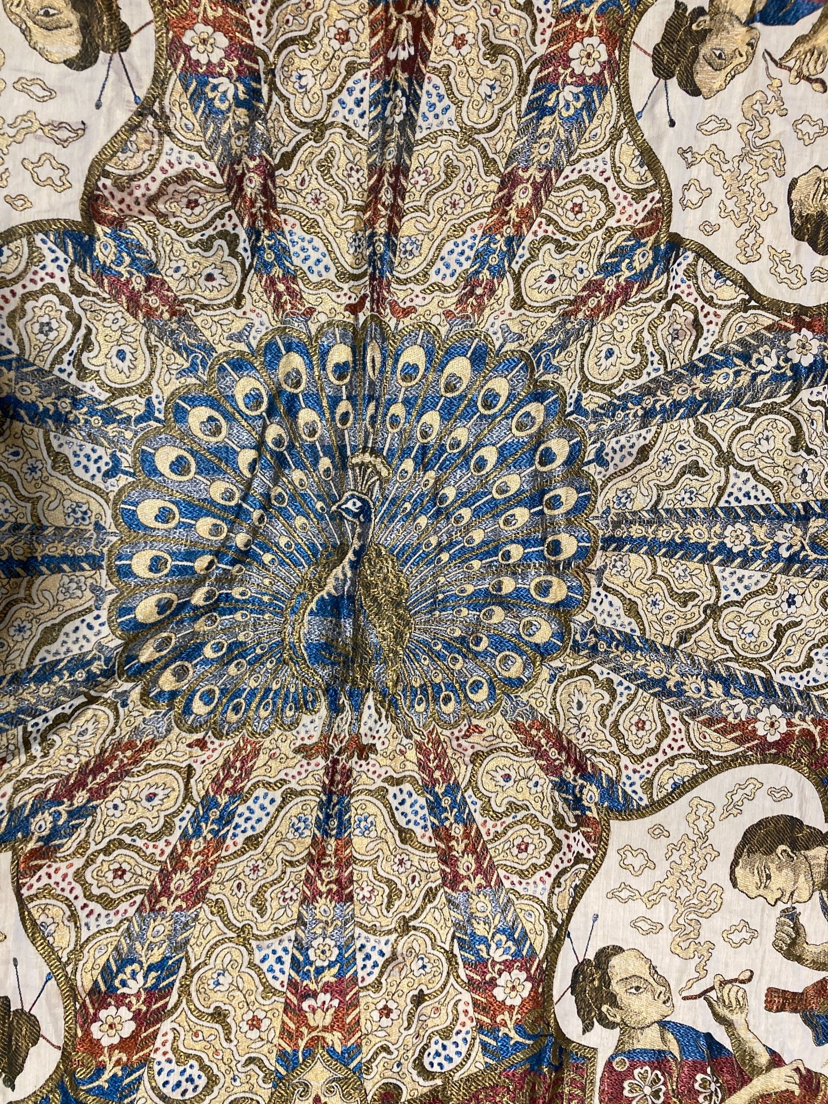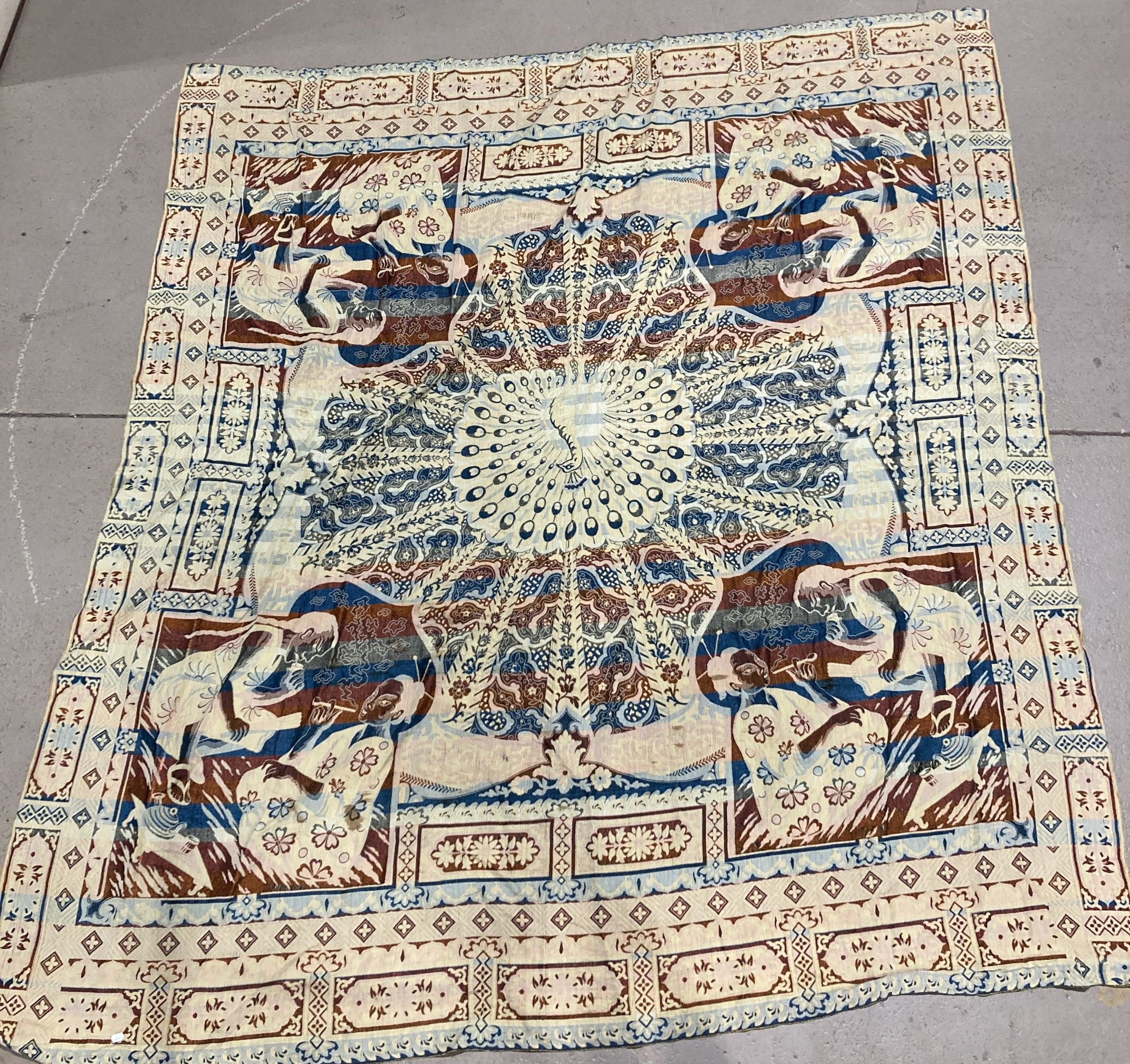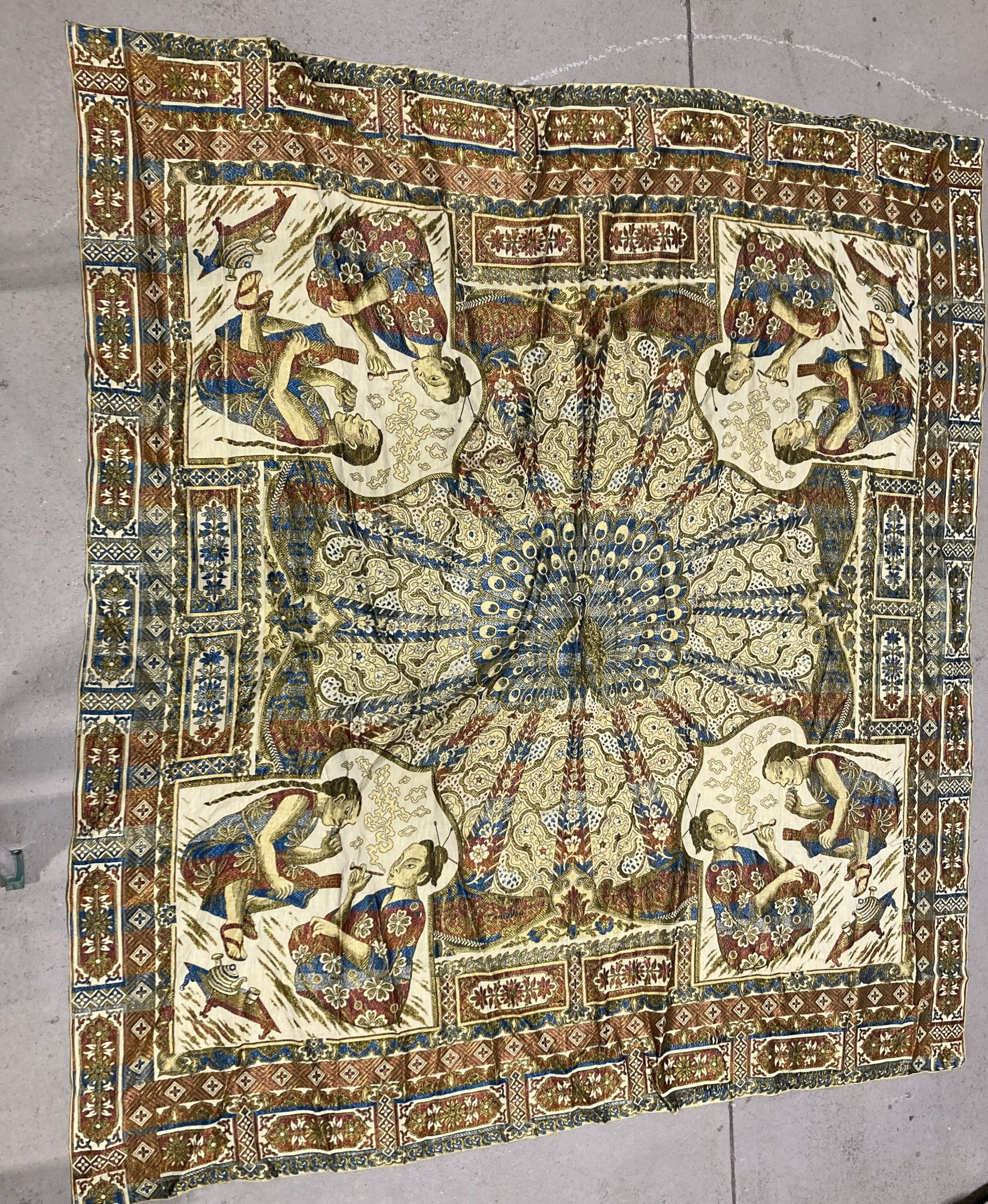 Large silky shawl with mechanically woven decoration featuring a peacock in the centre, surrounded by four spandrels of smokers. 220 x 205 cm